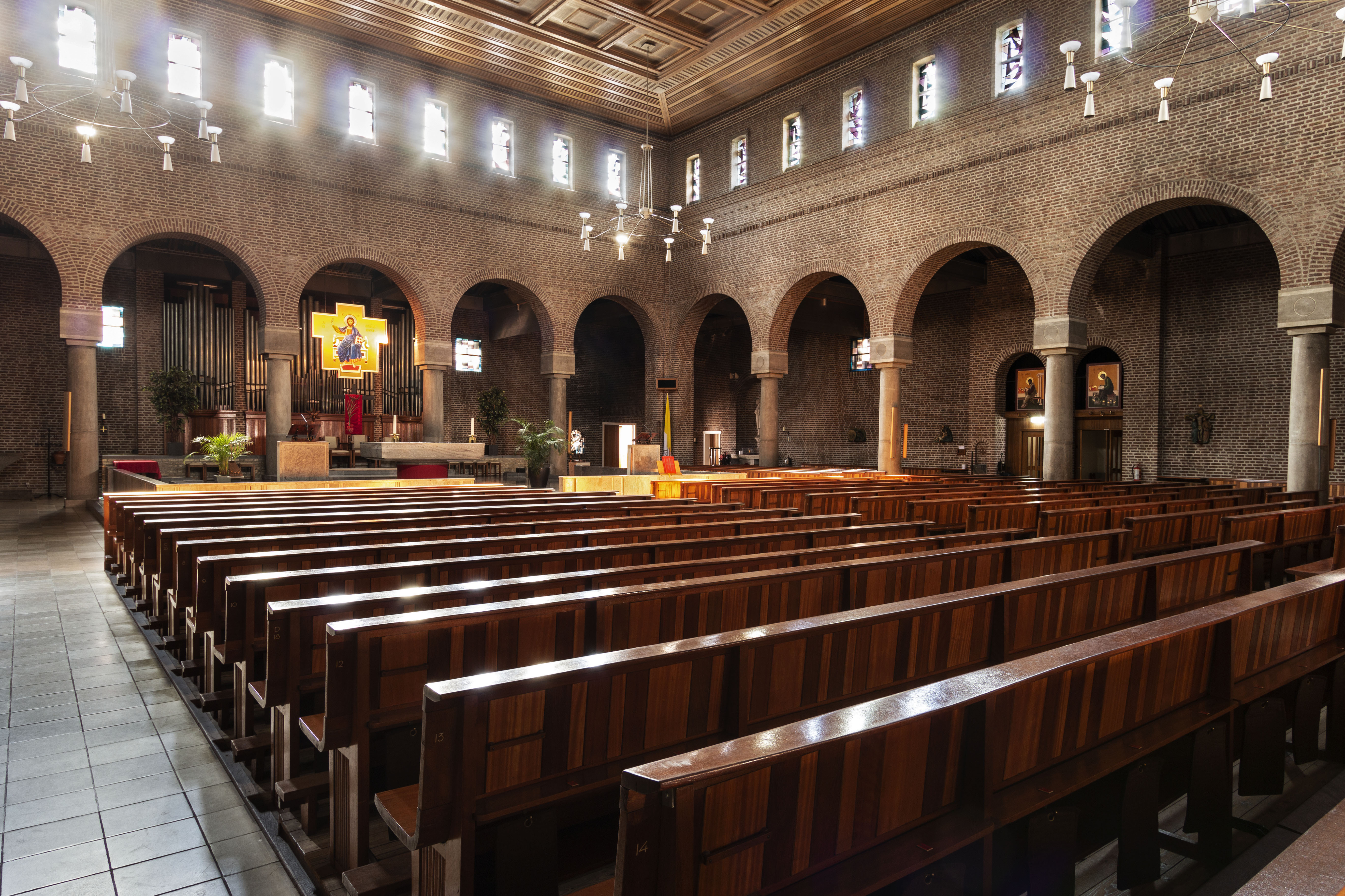 Het inwendige van de kerk is uitgevoerd in schoon metselwerk. De natuurstenen ronde kolommen zijn voorzien van gemetselde rondbogen. In de vier hoeken zijn gemetselde hoekpijlers geplaatst. Boven de rondbogen vlak onder het plafond bevindt zich een doorgaande strook langwerpige ramen. Het plafond bestaat uit blankhouten cassettes. De daken worden door middel van stalen spanten gevormd. In de voorbouw van de kerk bevindt zich naast de hoofdingang een devotiekapel. Op de verdieping van de voorbouw zijn een repetitiezaal voor het zangkoor en een bibliotheek gesitueerd. De kerkzaal bevat bijna 1000 zitplaatsen. De banken staan in drie zijden rond het verhoogde altaar, dat aan de achterzijde in de hoge kerkruimte is gesitueerd. Achter het altaar is de plaats van het zangkoor in de galerij nabij de uitbouw voor het orgel. Rechts naast het altaar is het doopvont in de galerij geplaatst. De religieuze elementen in het interieur zijn door verschillende beeldende kunstenaars vormgegeven:.