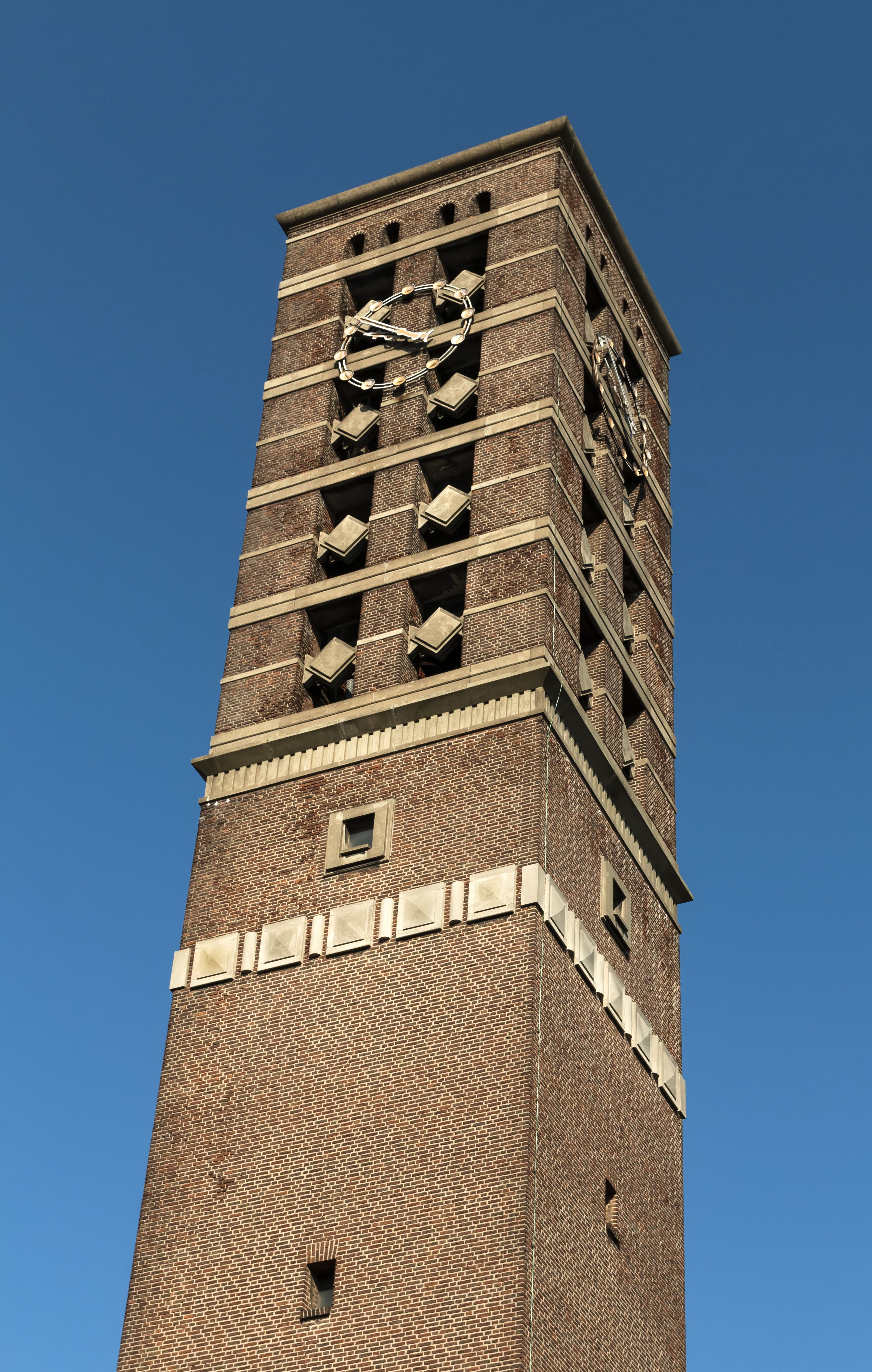 De kerk is opgetrokken in schoon metselwerk met in de voorgevel een mozaïek van Joan Collette. De gevels zijn voorzien van horizontale banden decoratief metselwerk. De vrijstaande toren is 46 meter hoog en is in baksteen gebouwd, voorzien van betonnen elementen bij de galmgaten