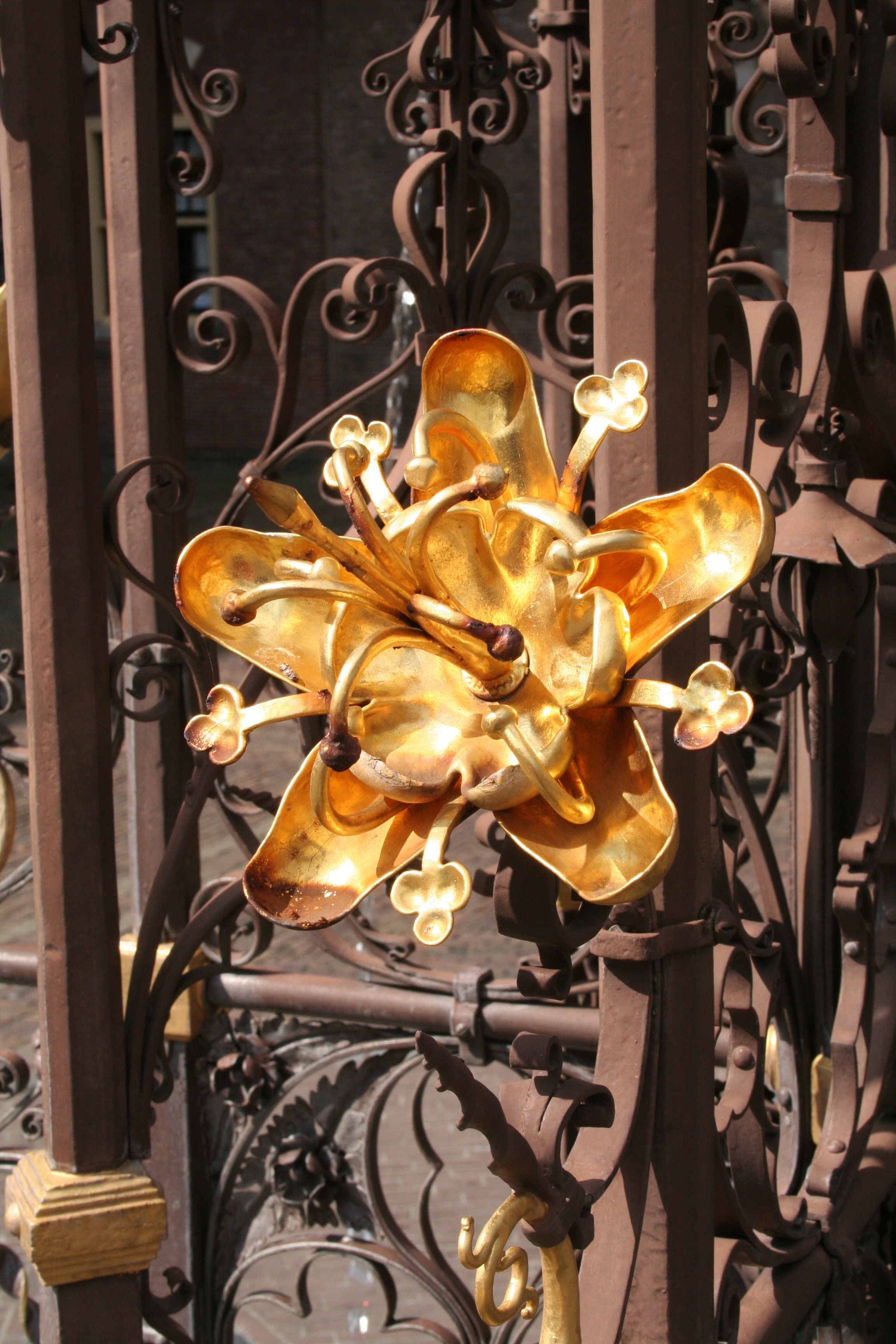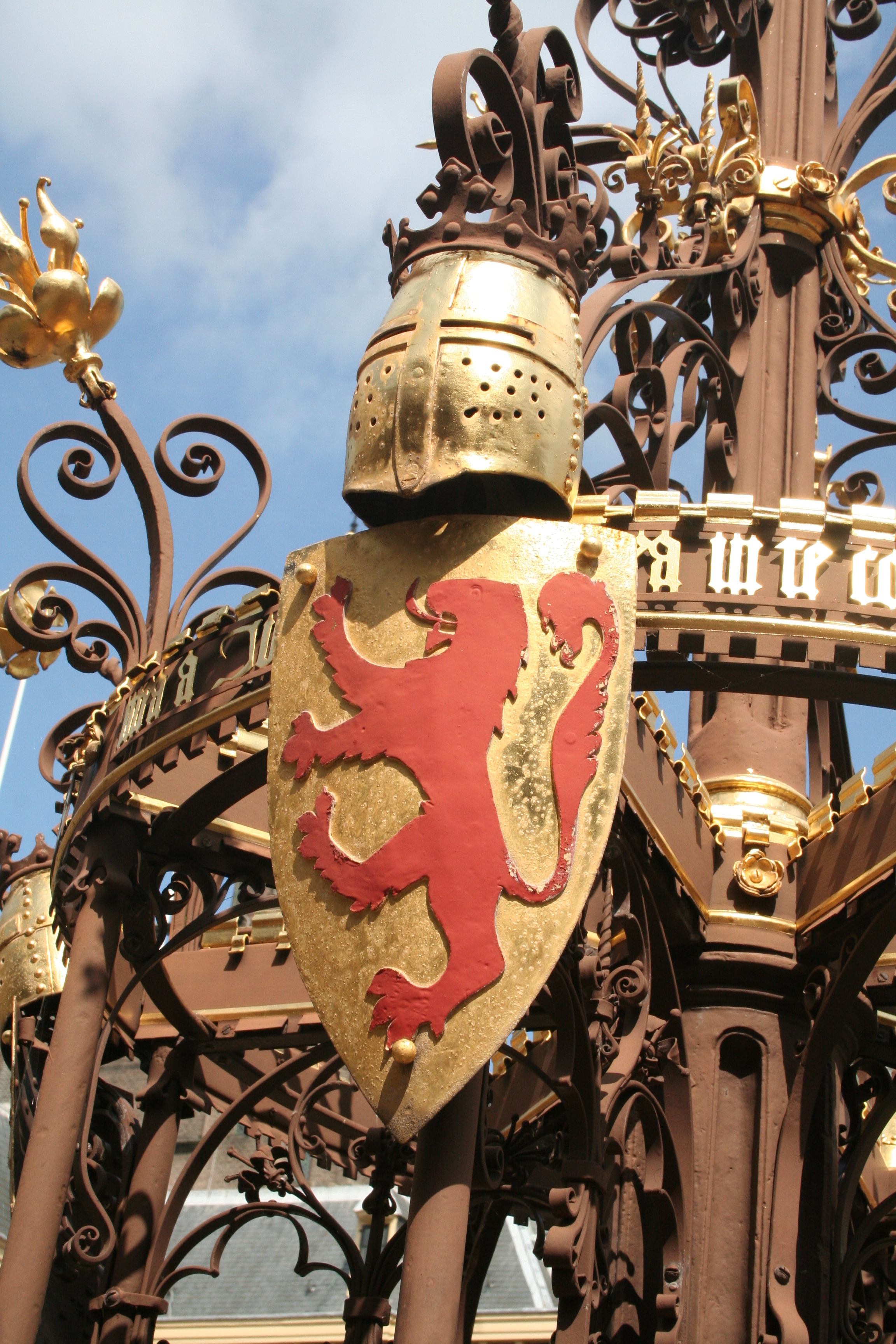 De armen zijn afwisselend van draadvormige spuwers voorzien, bij de eerste geleding als volledige dierfiguren, bij de tweede geleding alleen als koppen; voorts vier wapenschilden door helmen bekroond (beurtelings met de Hollandse leeuw of de Duitse adelaar), die een Latijns randschrift rondom telkens onderbreken.