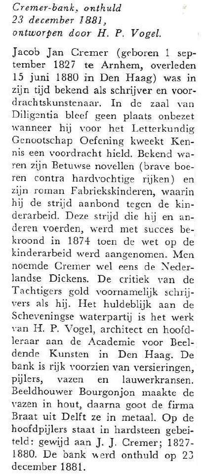 Op zondag 11 juli 1880 koos de commissie tot het plaatsen van een herinneringsteken voor de schrijver en dichter J.J. Cremer (1827-1880) een plek uit aan de zuidwestkant van de waterpartij in de Scheveningse Bosjes. Het herinneringsteken kreeg de vorm van een monumentale bank. Cremer hield niet van begraafplaatsen en had gezegd dat, als men een herinnering aan hem op wilde richten, dit niet op de begraafplaats te doen. Hij had liever een bank in de Scheveningse Bosjes, 'waarvan zij, die er zich verpoozen, nog genot kunnen hebben'.