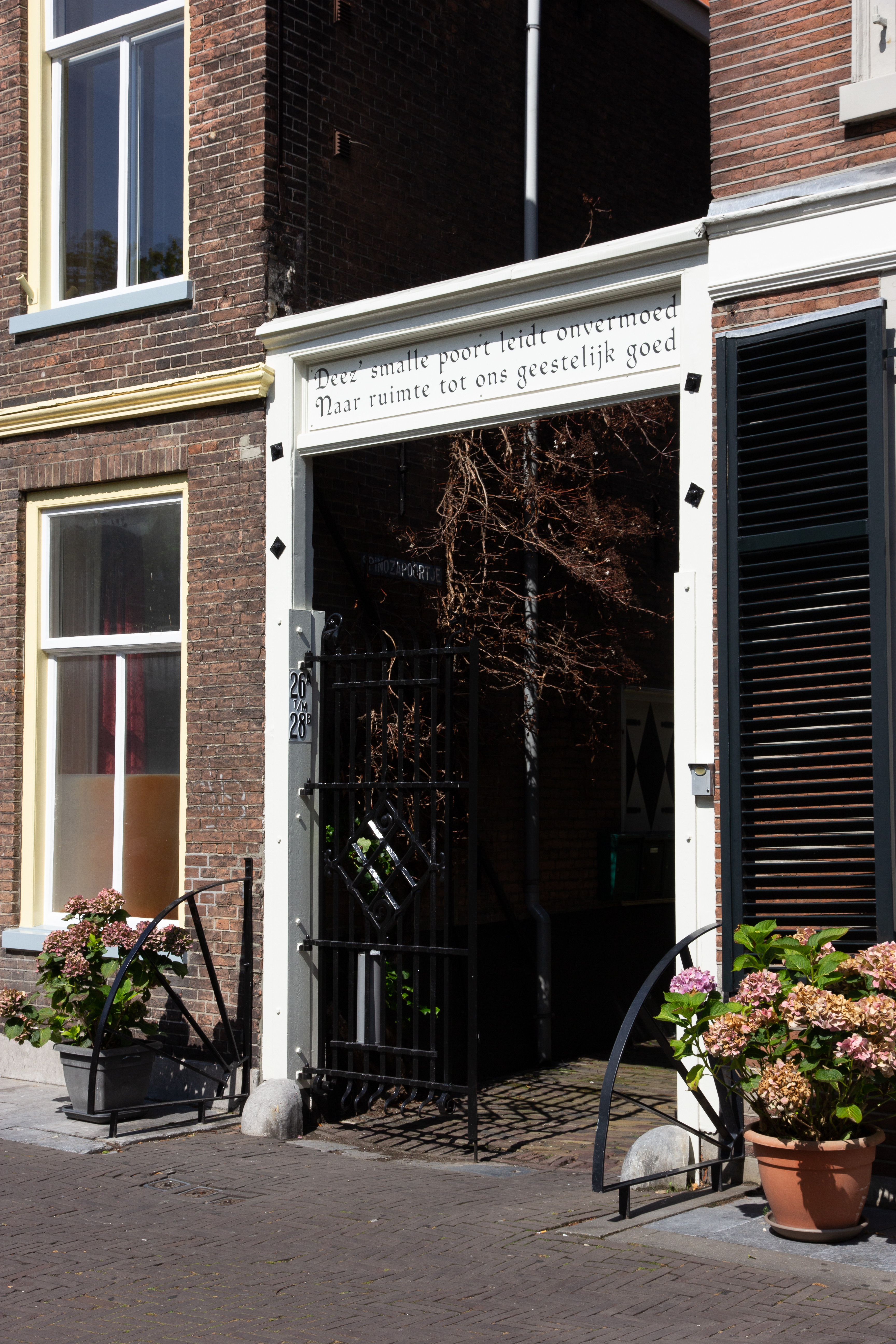 Houten poort met smeedijzeren hek, waarschijnlijk daterend uit de 18de eeuw. De steeg is genaamd Spinozapoort. Op de houten poort de tekst:"Deez' smalle poort leidt onvermoed naar ruimte tot ons geestelijk goed".