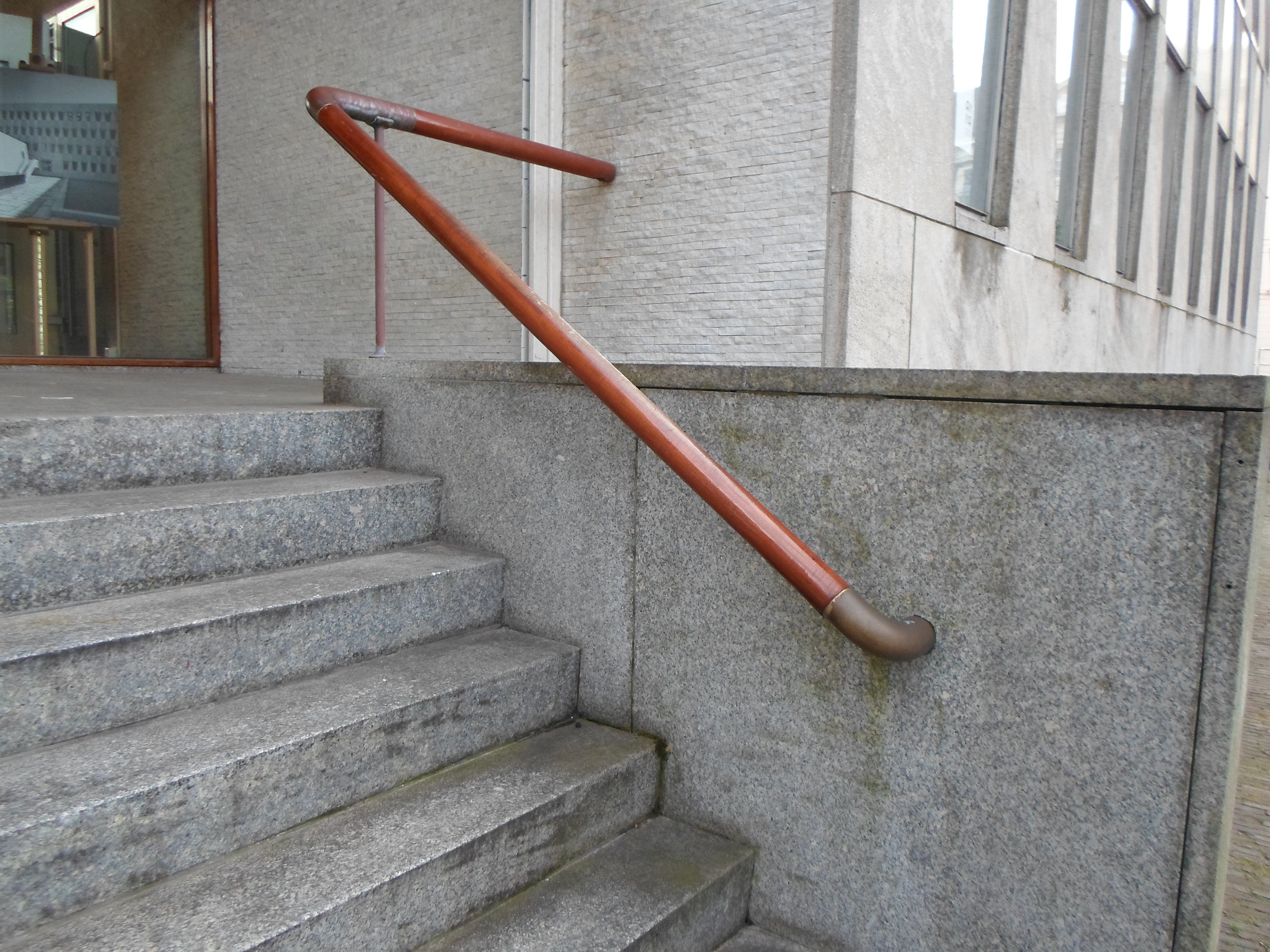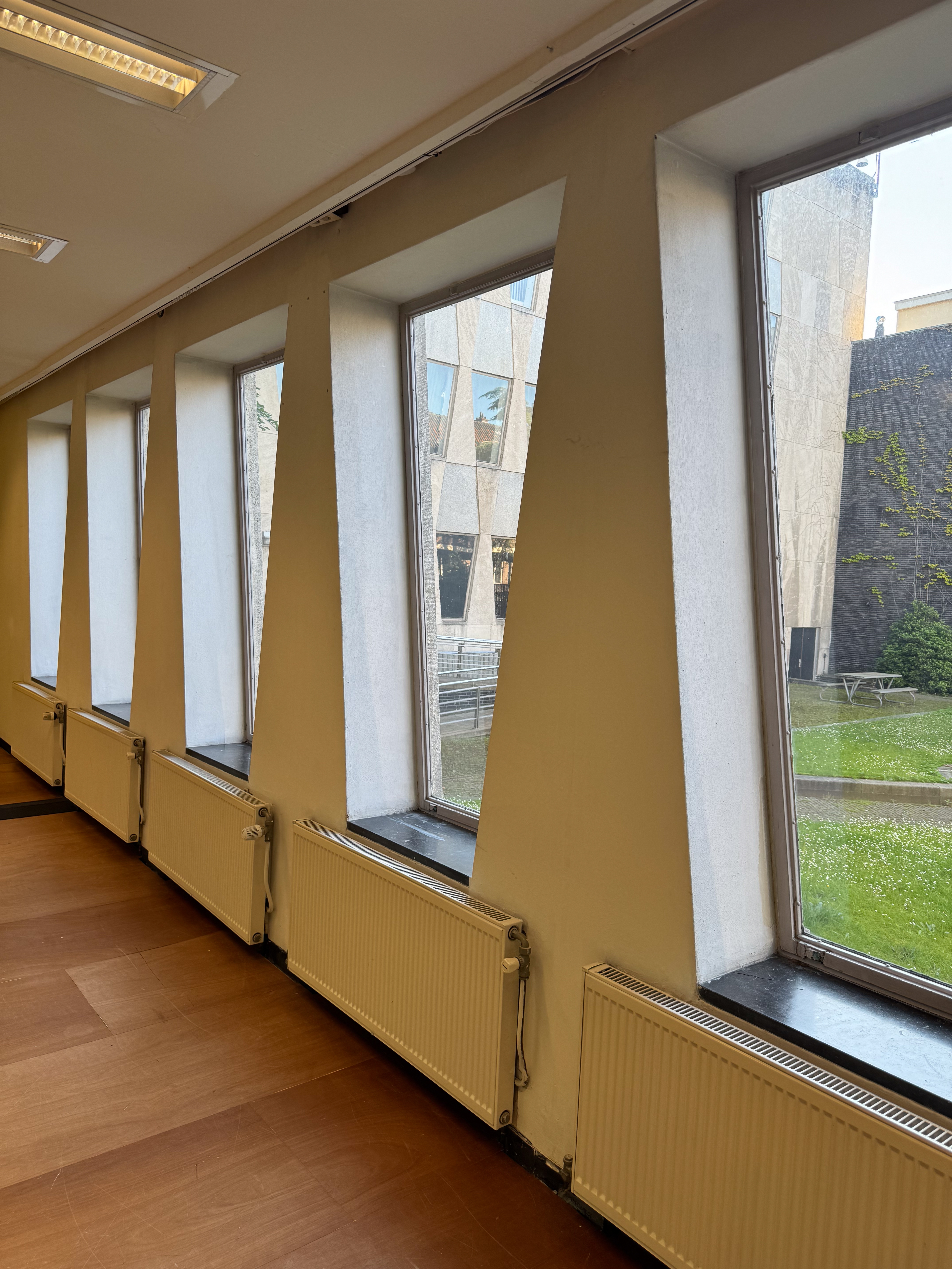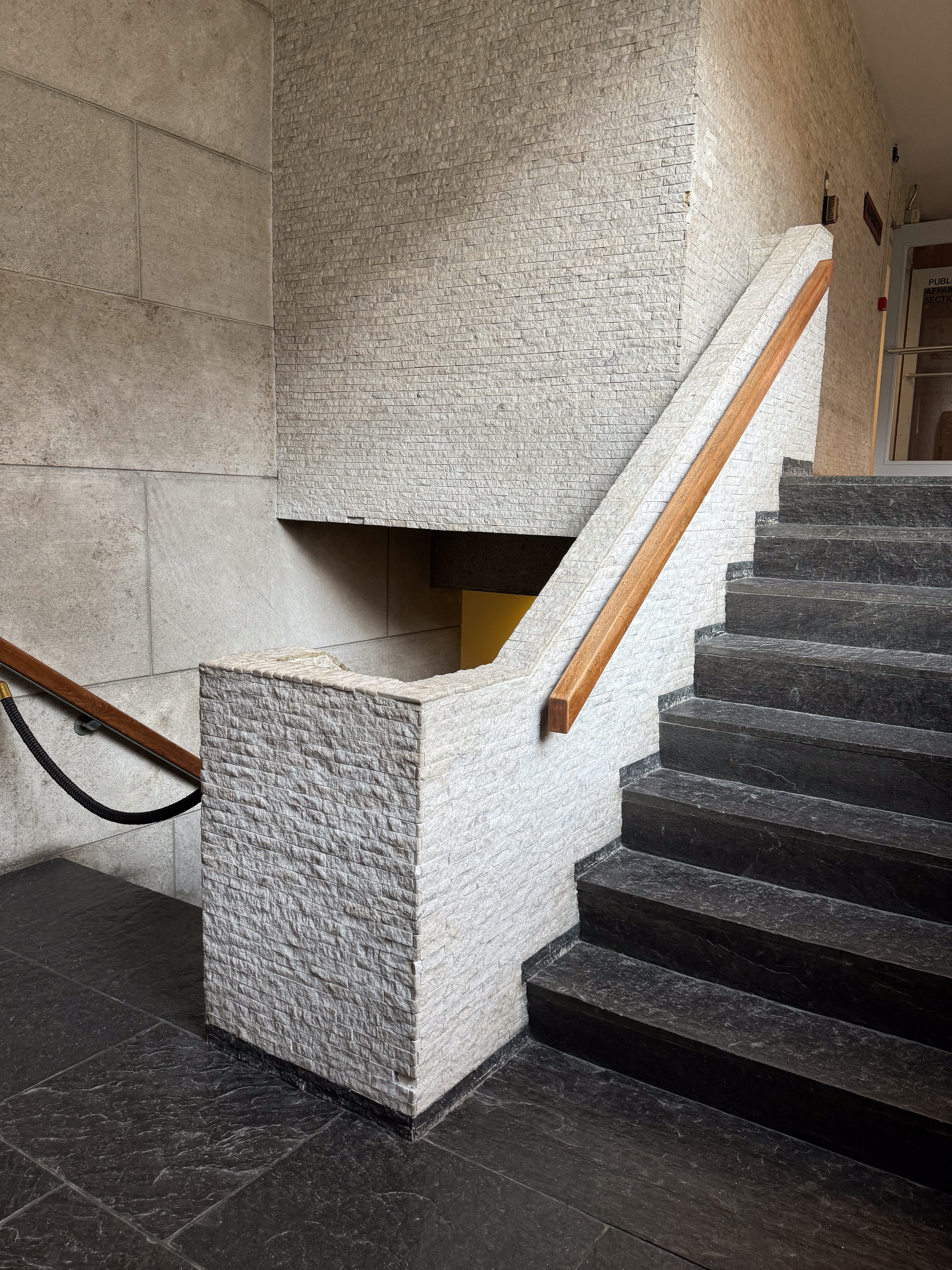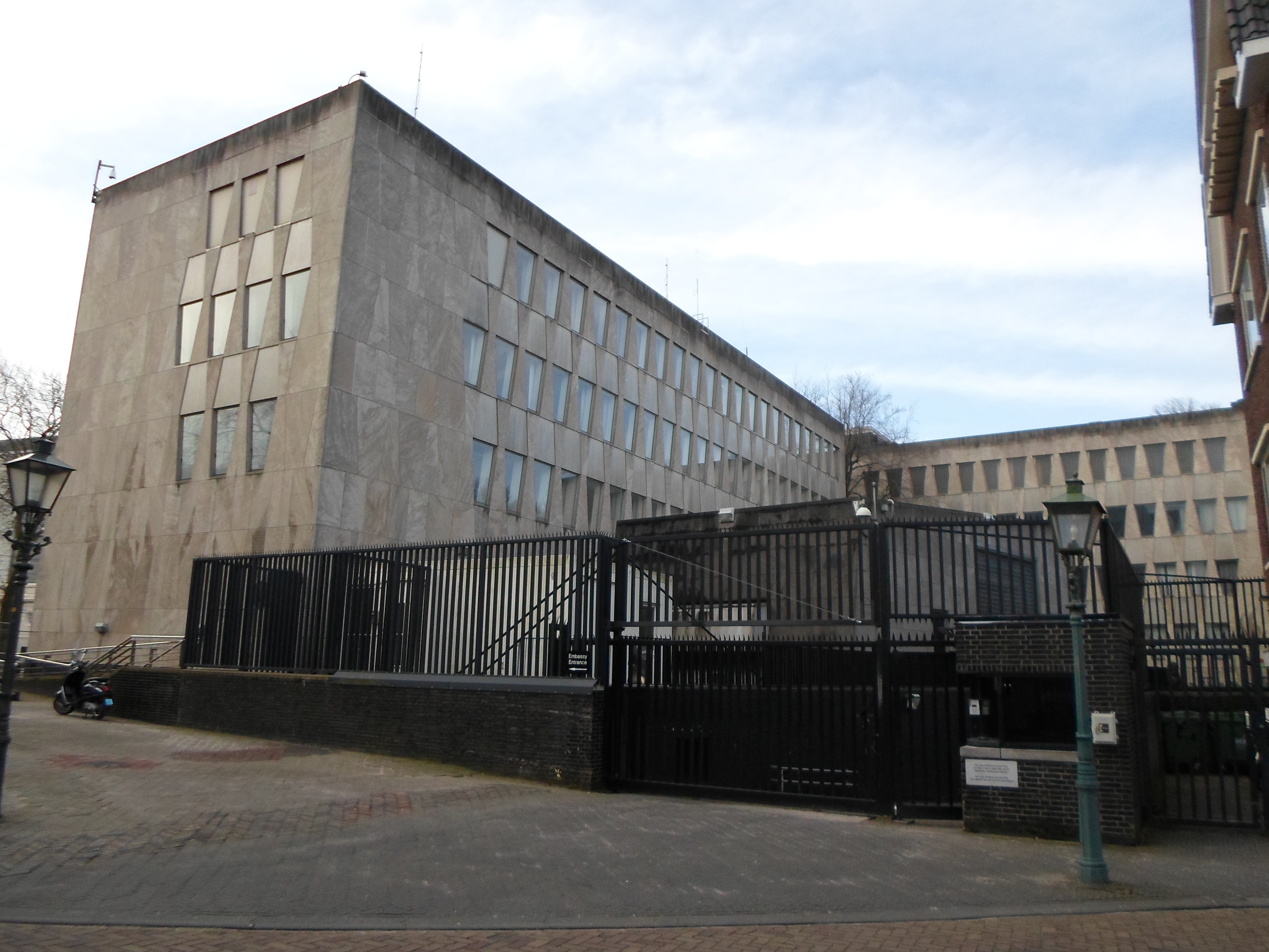 Ambassadegebouw, binnenplaats met muur op de parkeerkelder, auditorium en beveiligingsunit |