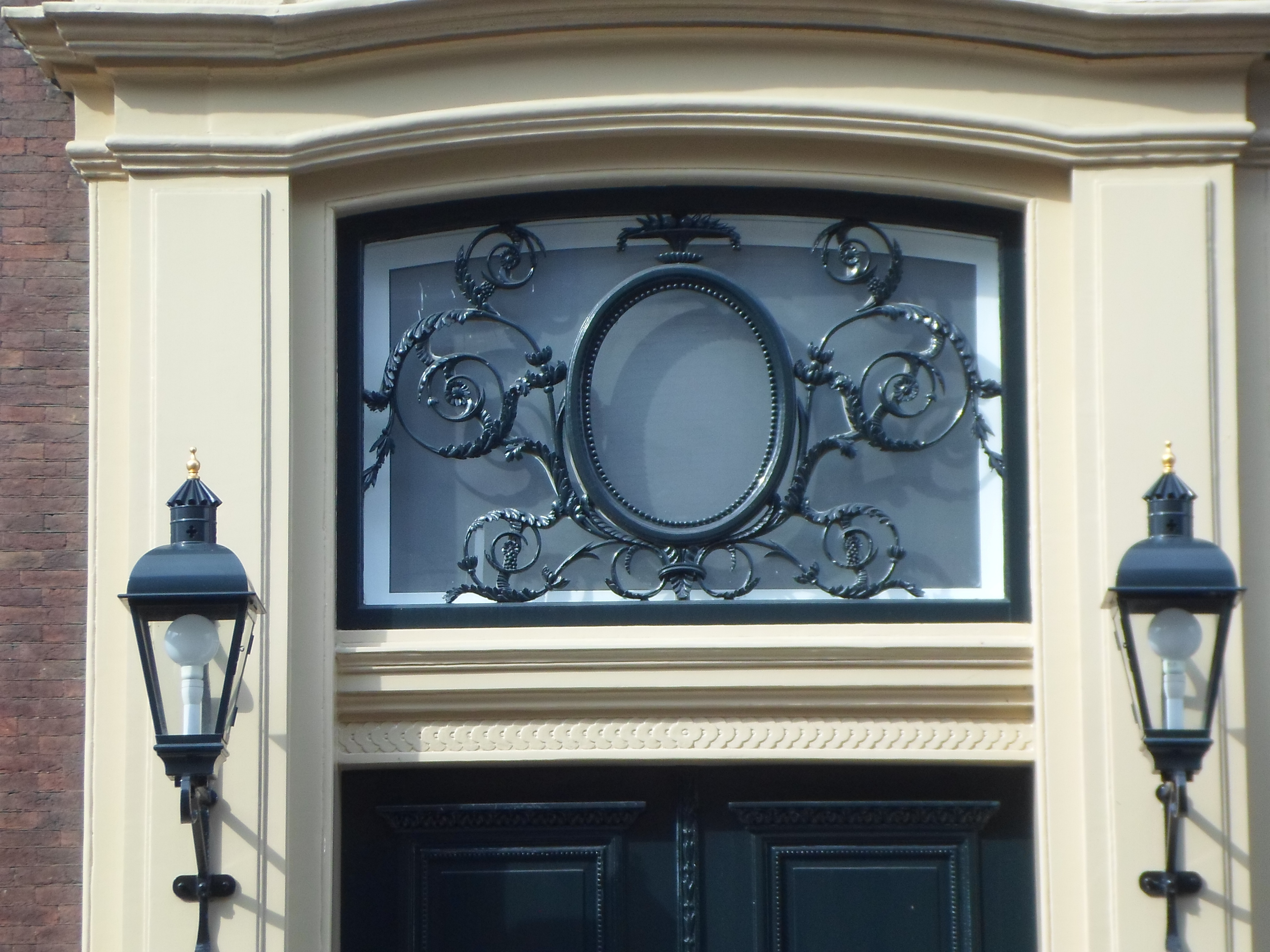 Pand met brede bakstenen gevel uit 1757 met versierde ingangspartij en kuifstuk. Trap en interieurs in Lodewijk XV en Empire stijl