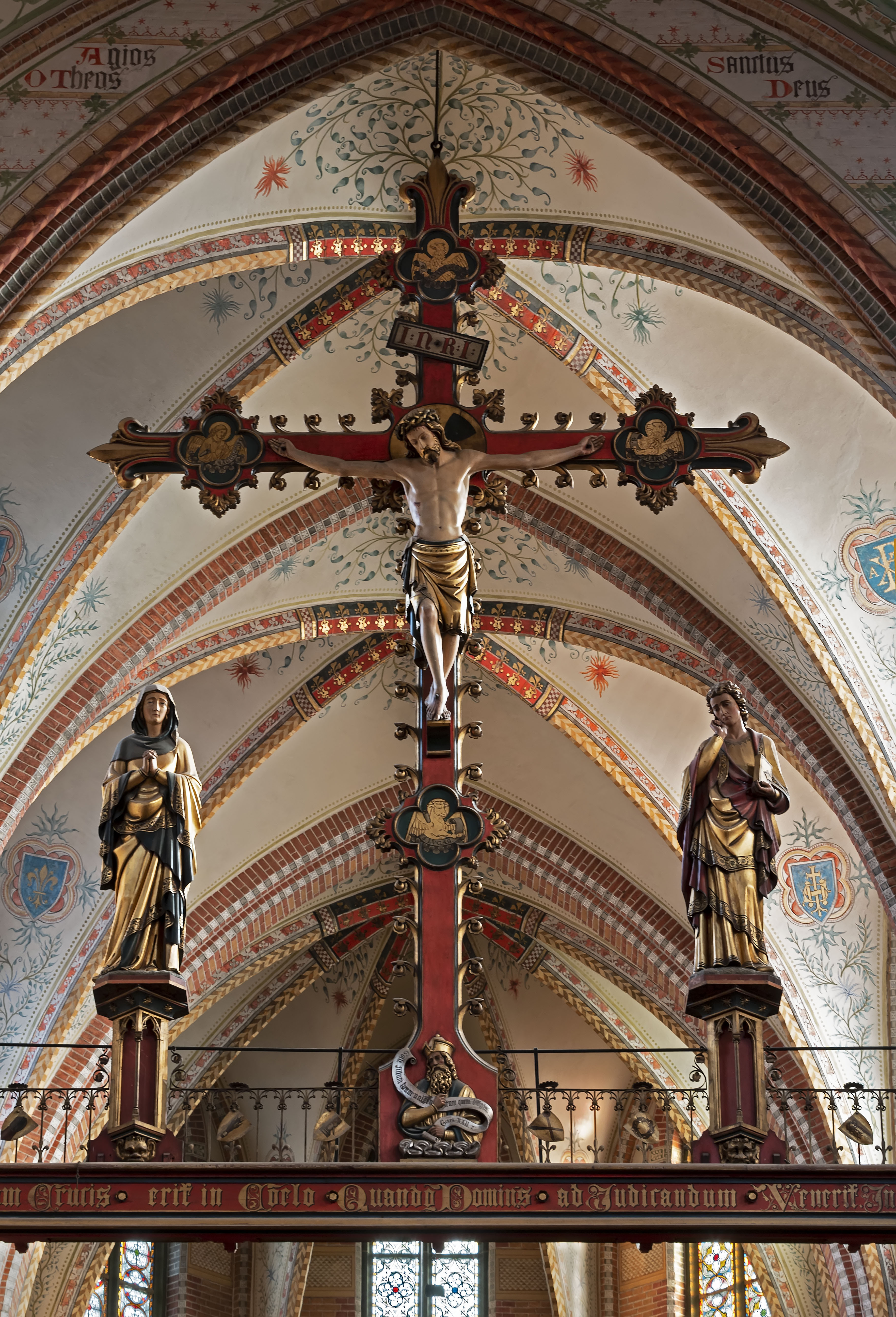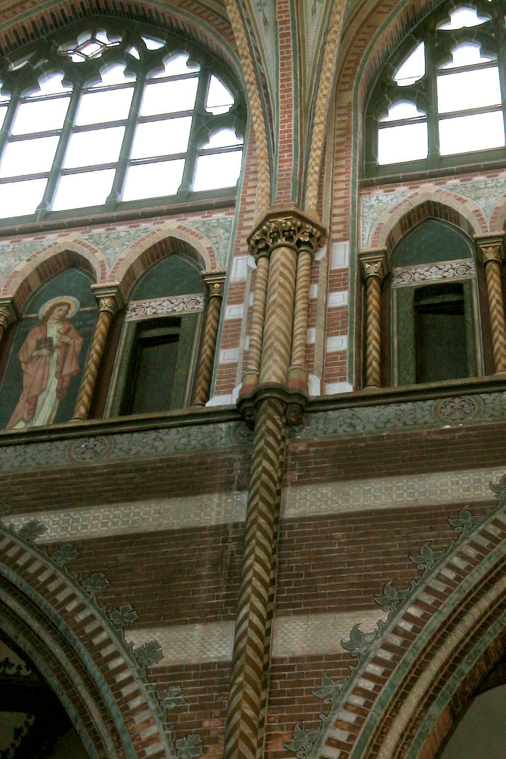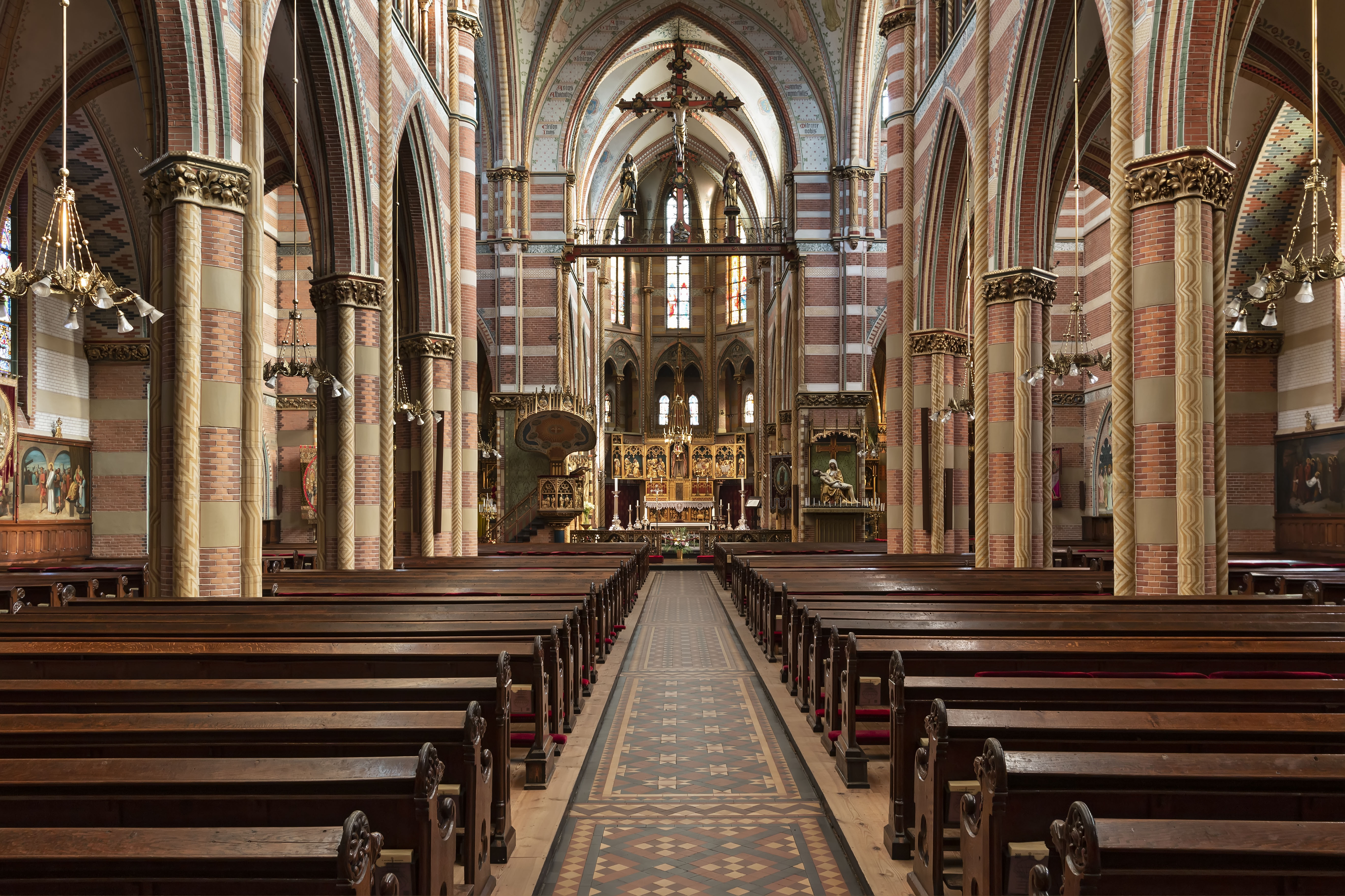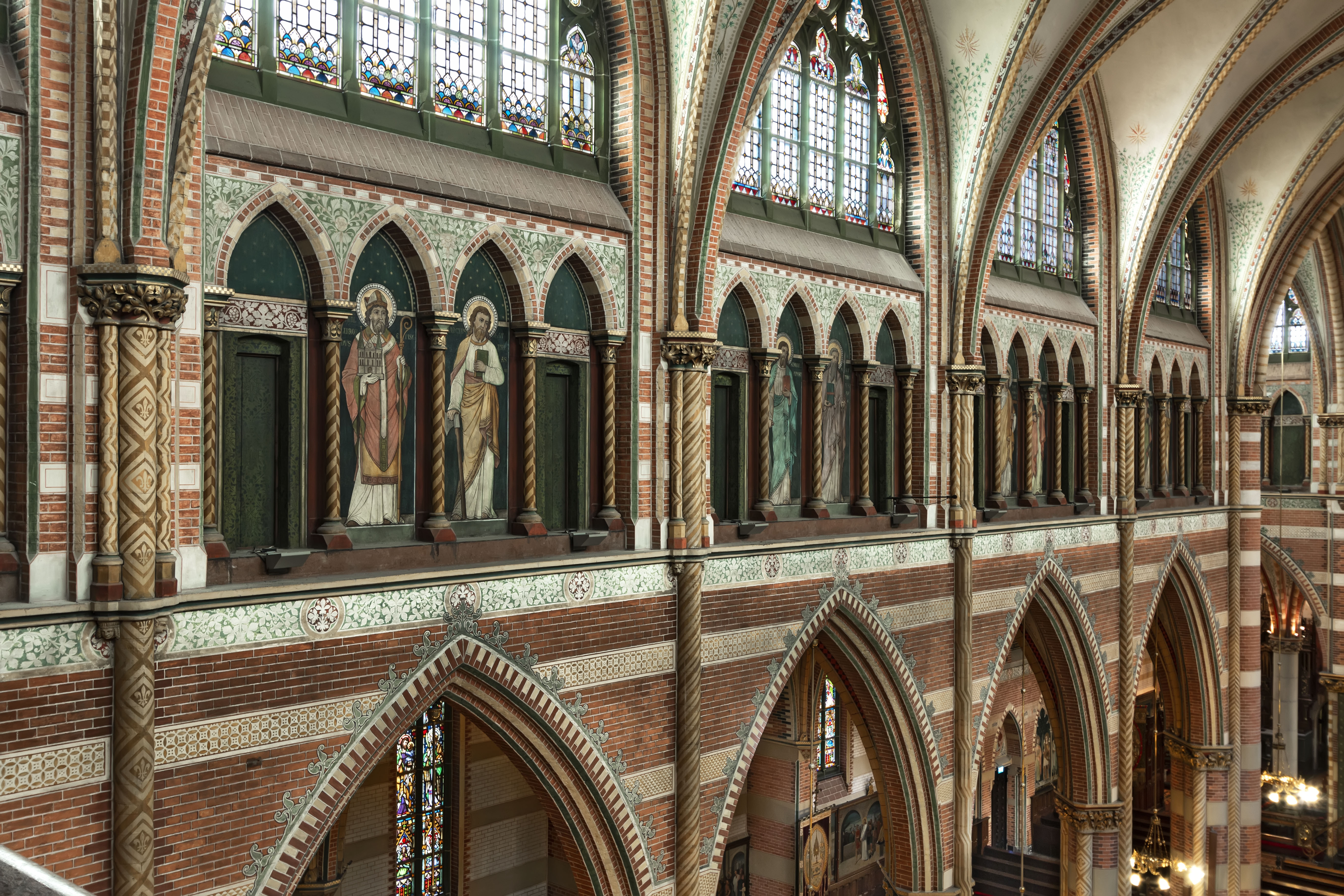 Rechthoekige kapellen aan weerszijden van het koor, elk overdekt door vier kruisribgewelven die op een middenpijler samenkomen. De kerk bezit pijlers met kolonnetten en gebeeldhouwde kapitelen en wordt overkluisd door gemetselde kruisribgewelven. Roosvensters in de westgevel en de eindgevels van het transept. De 91 m hoge westtoren bestaat uit twee vierkante geledingen en een achthoekige, door pinakels geflankeerde lantaarn, waarop een hoge naaldspits waarvan de houtconstructie in de toren tot op kerkhoogte doorloopt. De lantaarn wordt op de hoeken begeleid door forse pinakels. Op de kruising van de daken over schip, koor en transept een houten, achthoekige vieringtoren met naaldspits. Aan de linkerzijde van het koor de sacristie met oorspronkelijke doopkapel (thans bijsacristie). Aan de rechterzijde van de apsis bevindt zich een diplomatenkapel met kapel op de verdieping. Vierkante traptoren met spits bij de sacristie, achthoekige traptorens aan weerszijden van het koor.