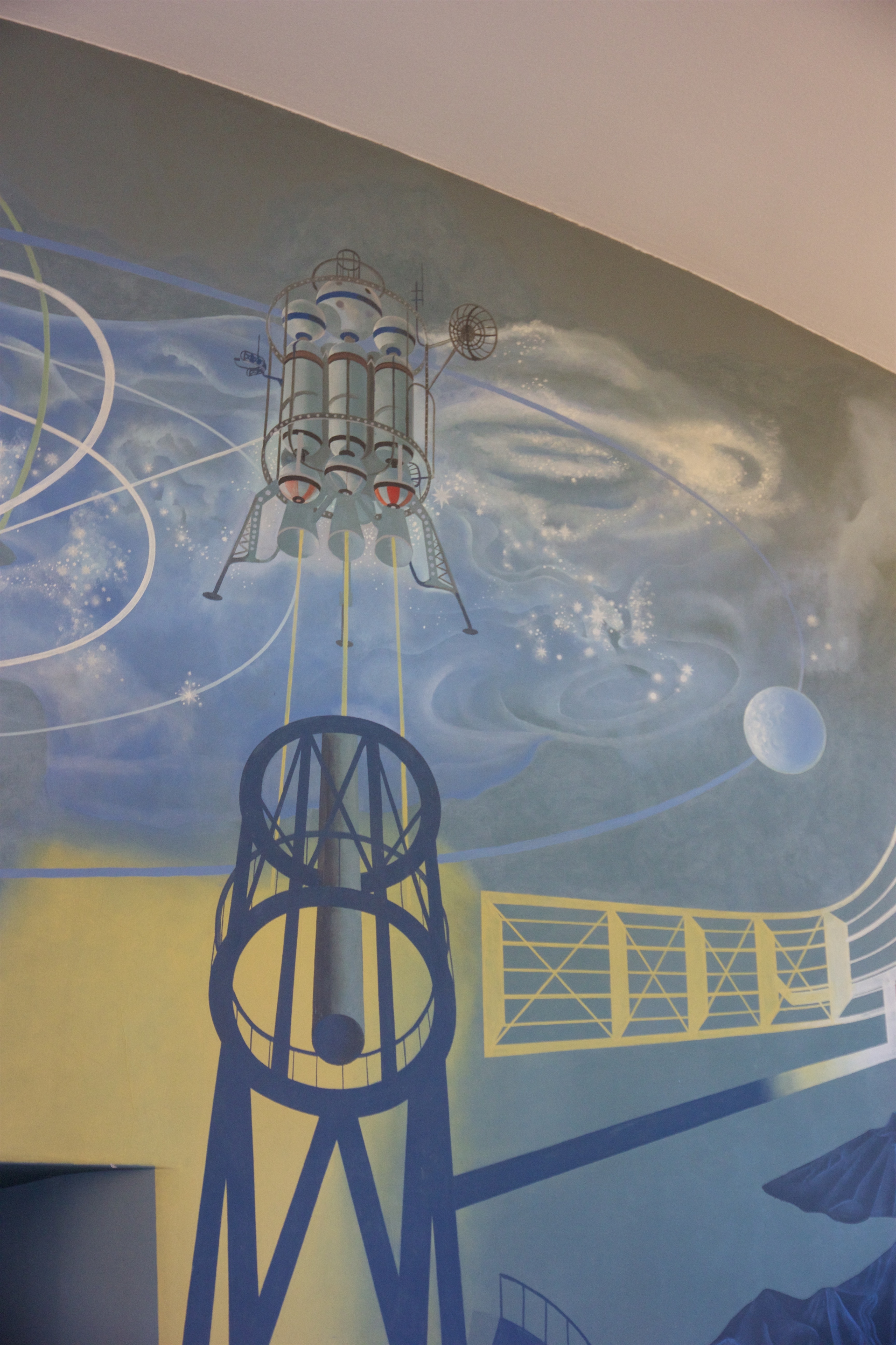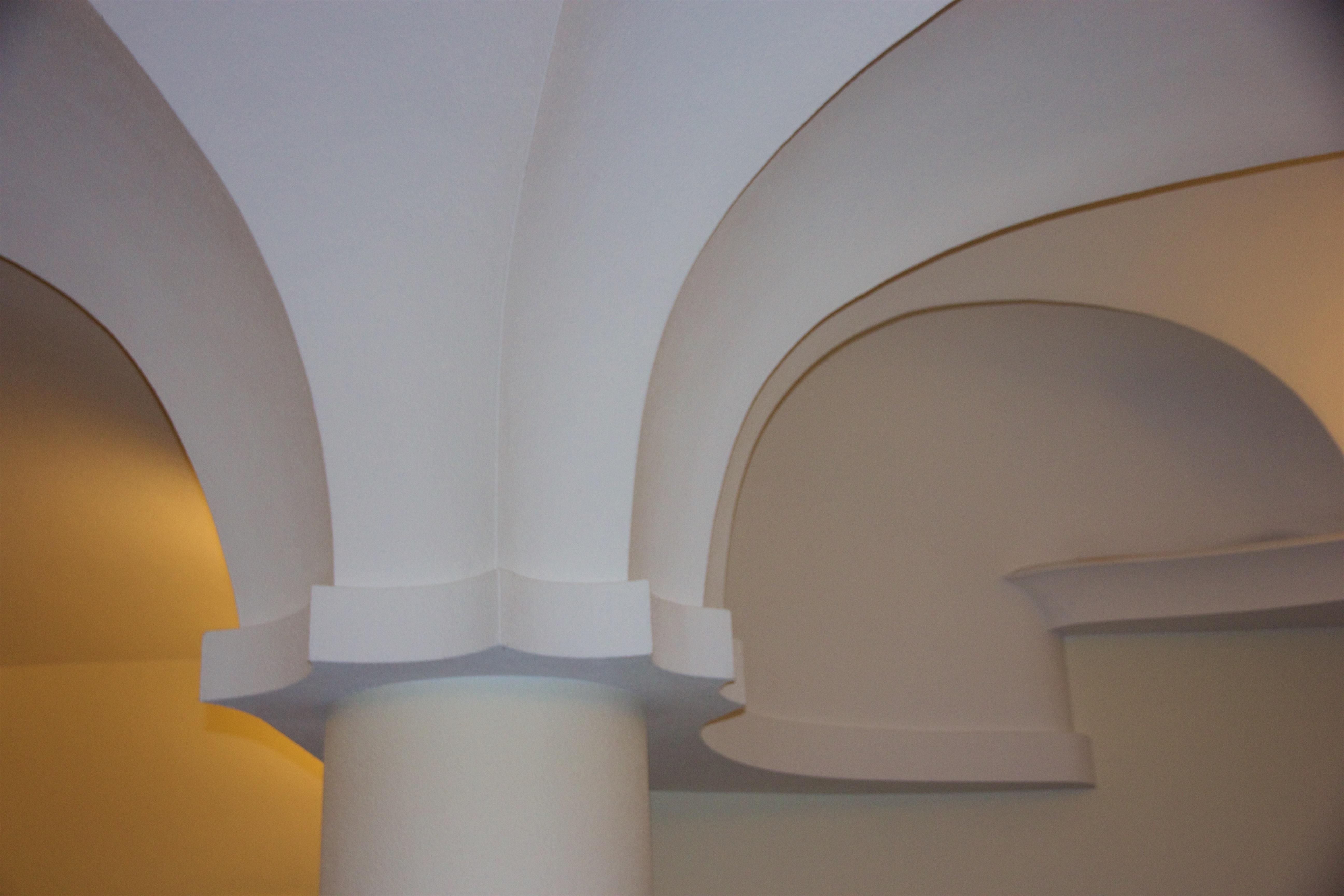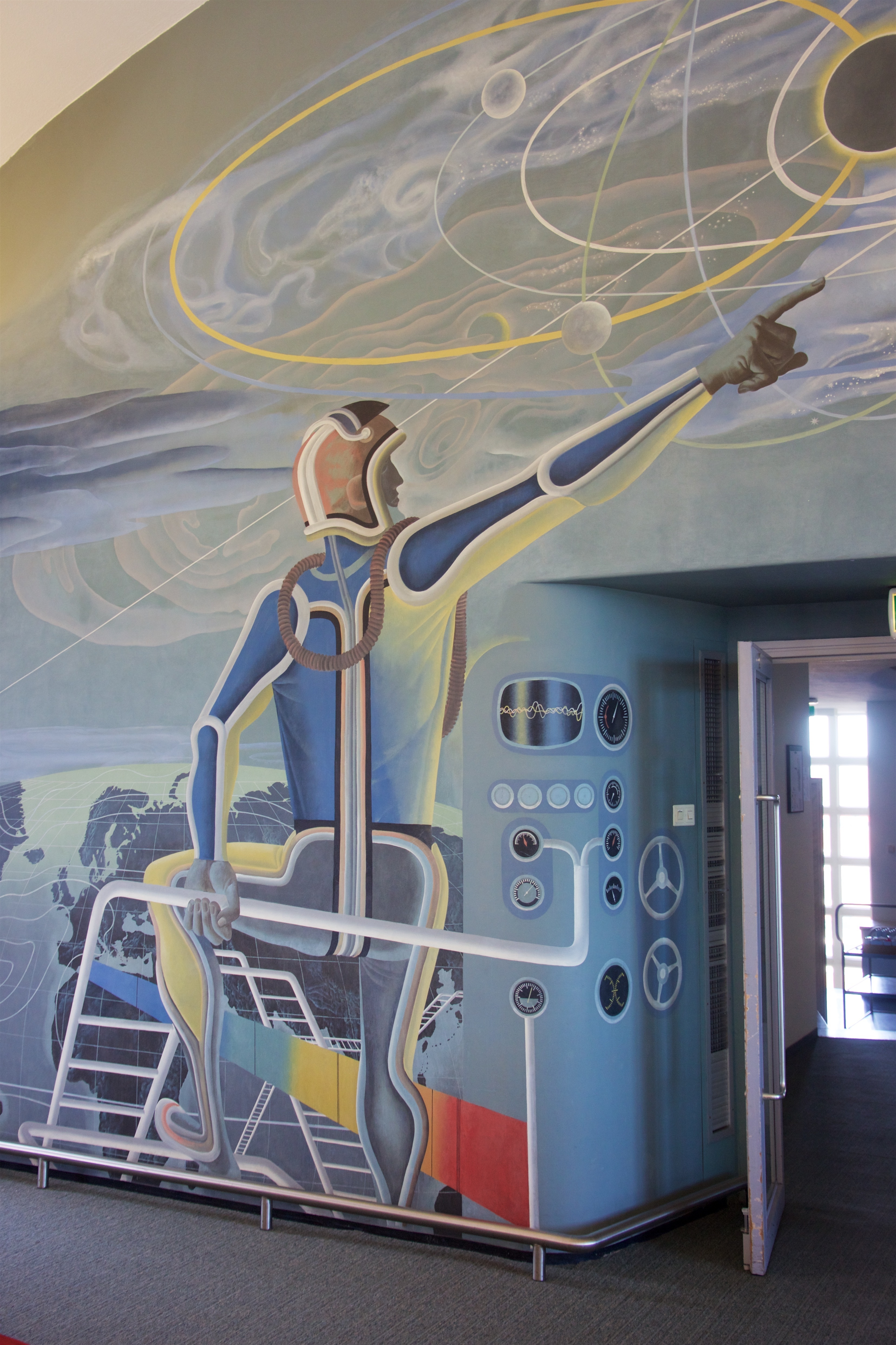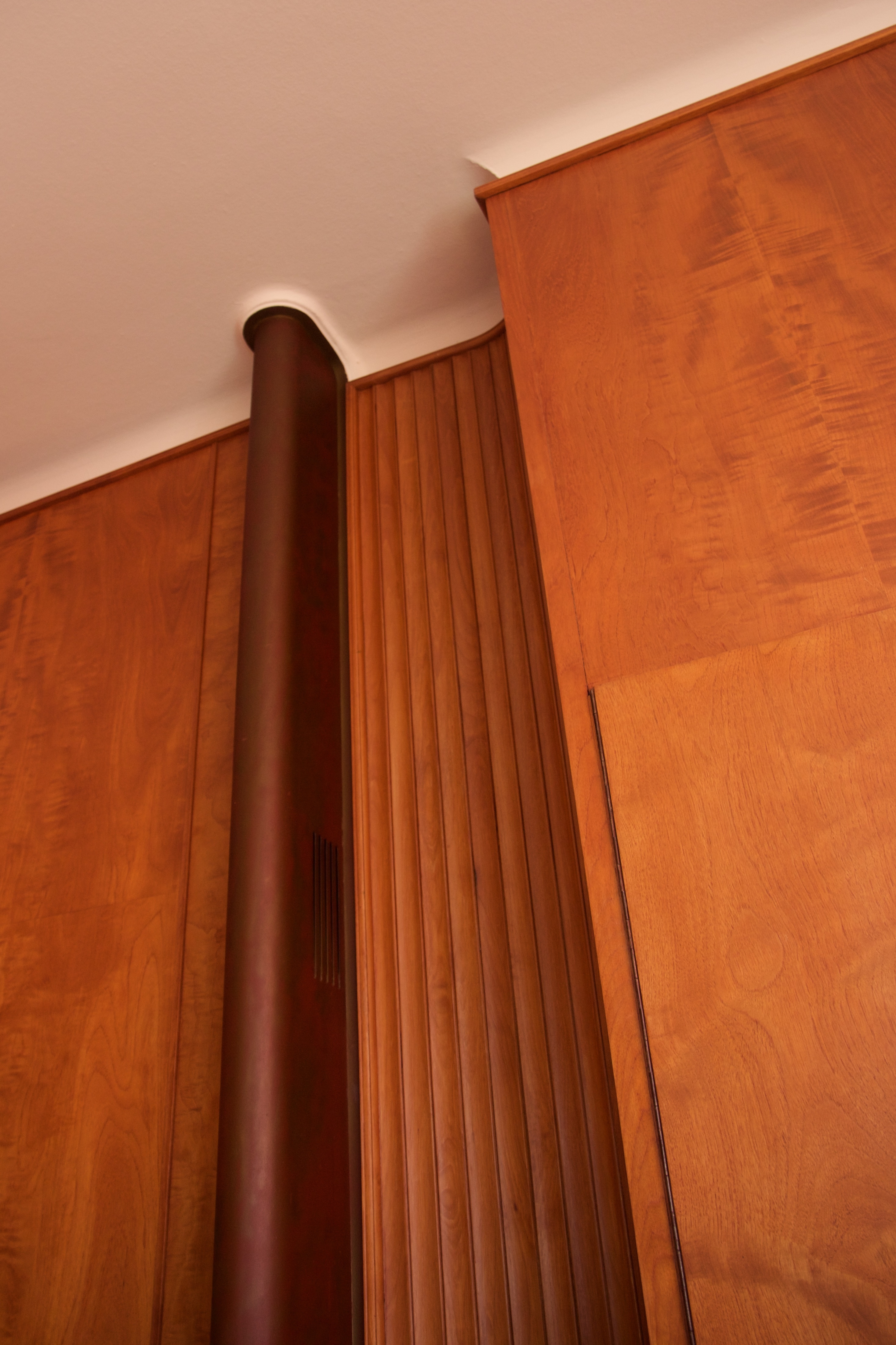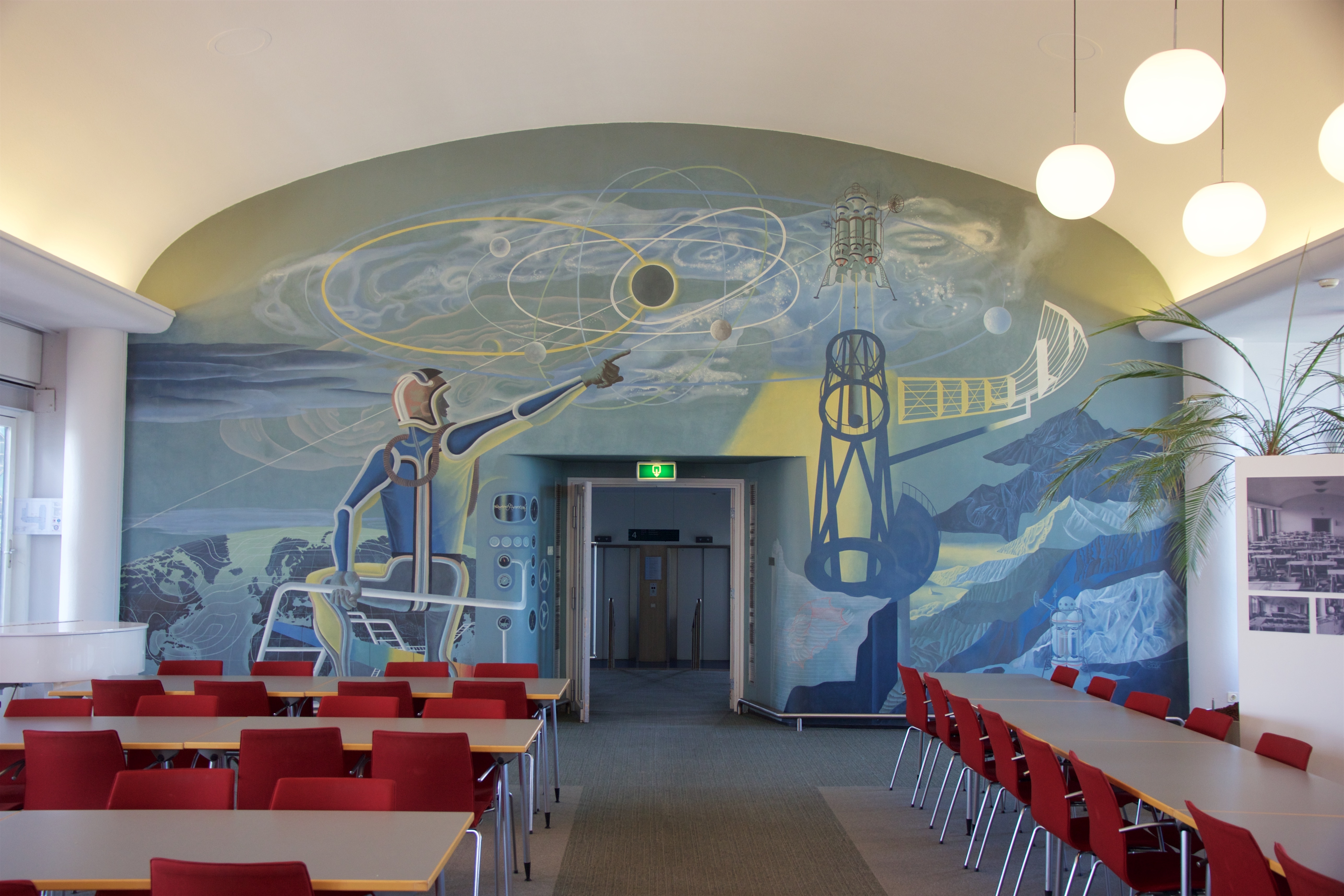 - door de aankleding van het interieur met toegepaste kunst, van E. Doeve.
