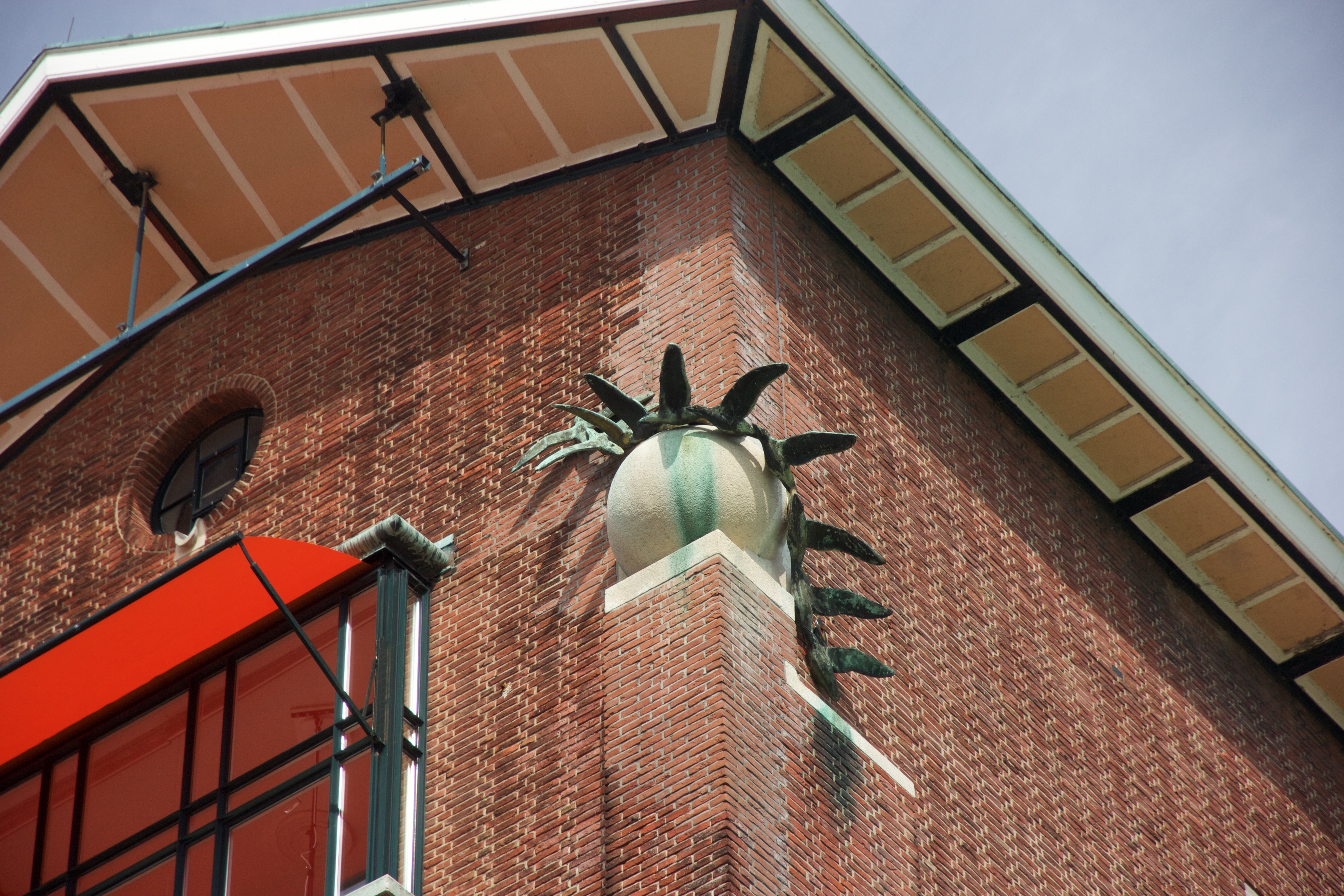 - door de aankleding van het exterieur met terra-cotta gevelornamenten in de entreepartij, die verwijzen naar de oorspronkelijke eigenaar en gebruiker;