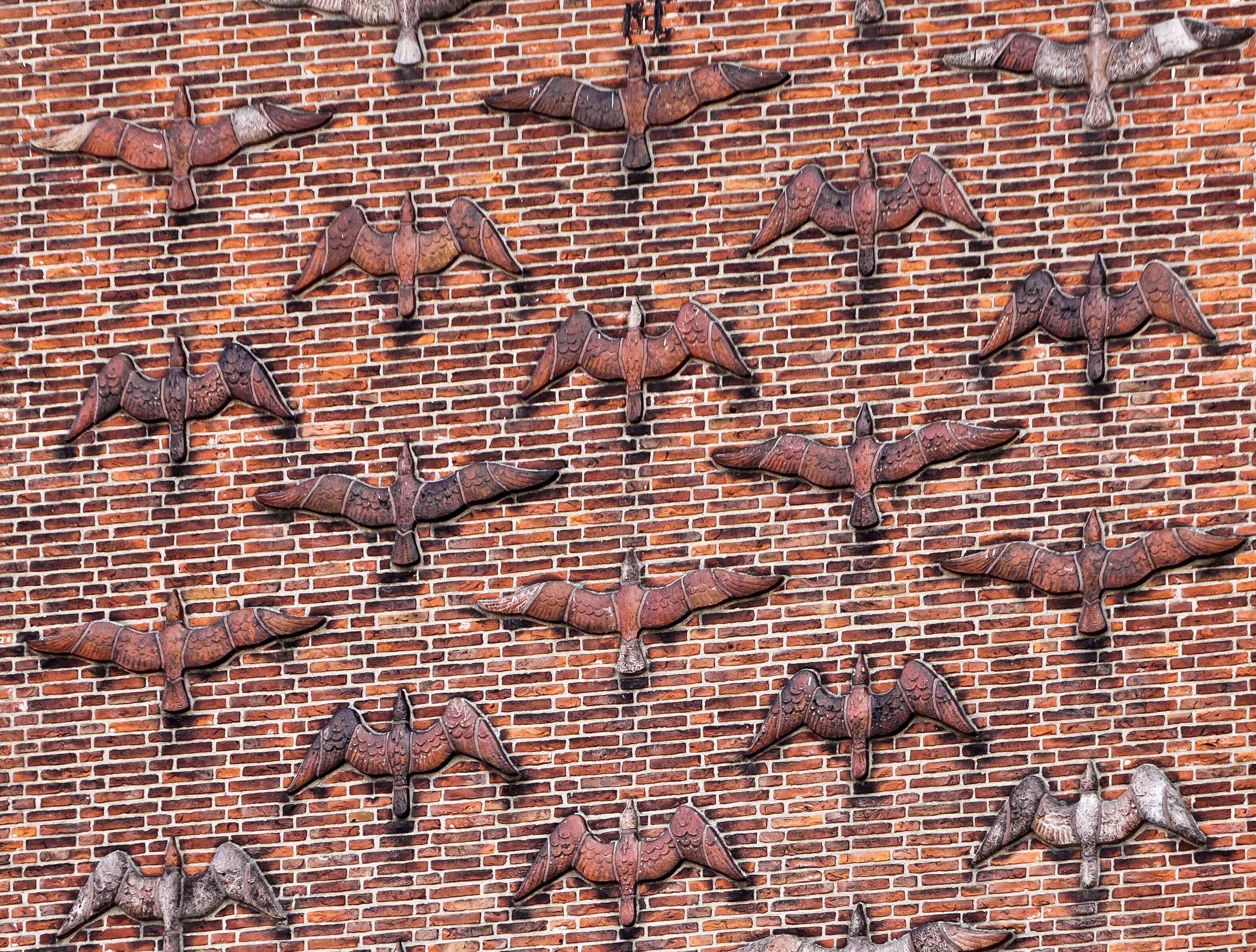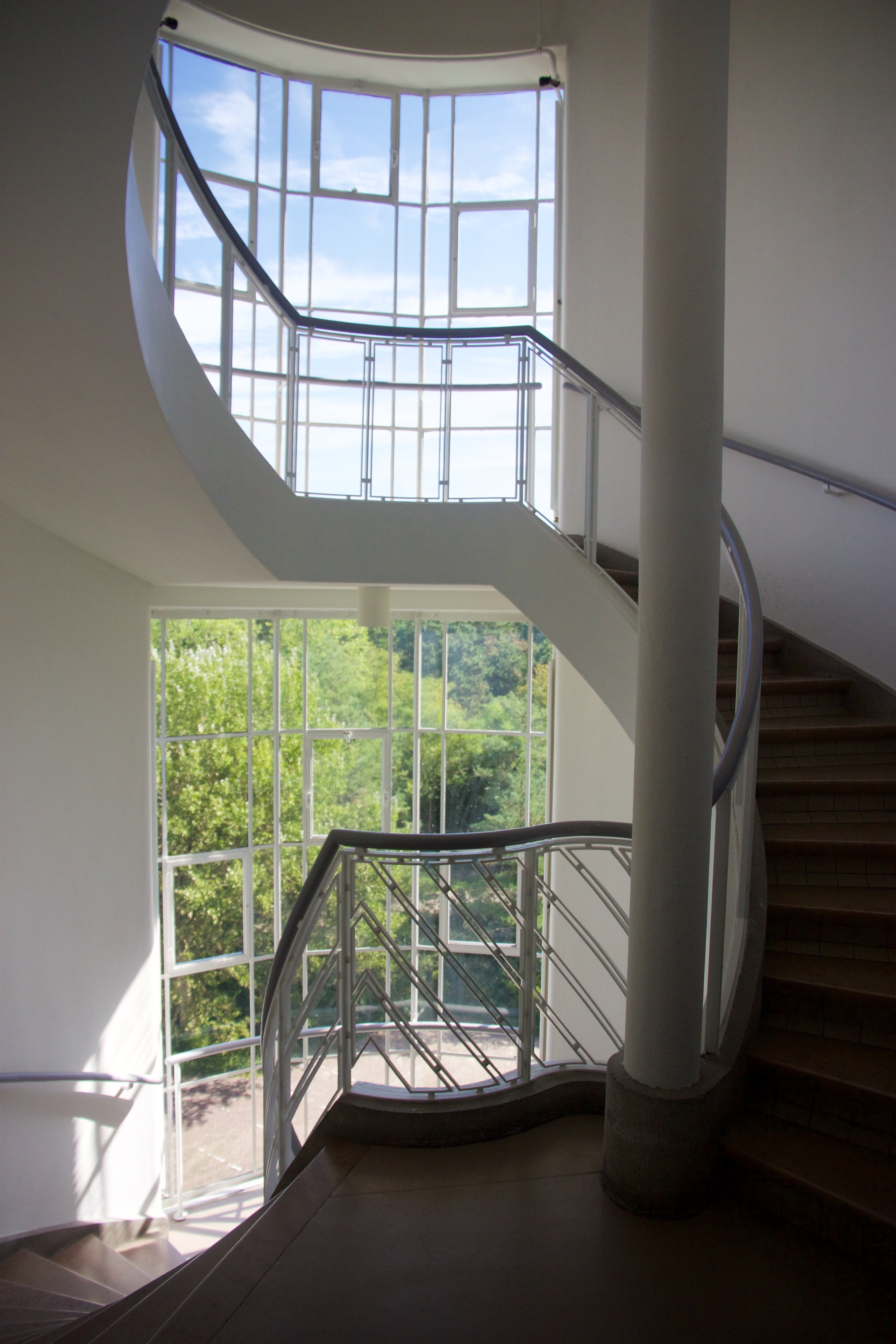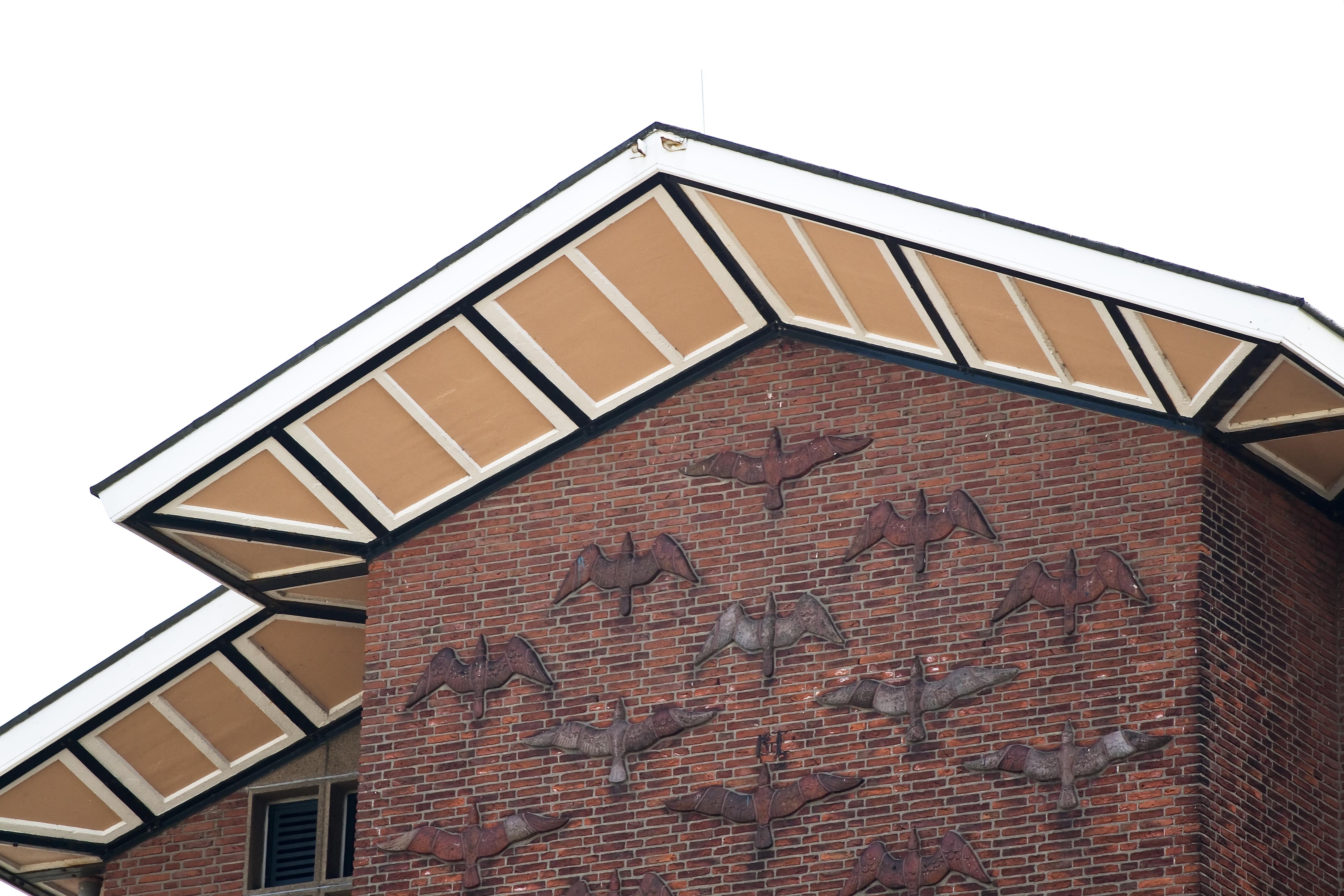 Elke vleugel heeft een zelfstandige entree, gemarkeerd door een halfronde uitgebouwde bordestrap. De representatieve hoofdentree aan de Badhuisweg wordt geaccentueerd door een gebogen, betonnen luifel die wordt gedragen door gedraaide zuilen. De onderzijde van de luifel wordt door hanglampen verlicht. De gesloten, massieve gevel boven de hoofdentree is versierd met in terra-cotta uitgevoerde vliegende vogels die in een regelmatig patroon zijn bevestigd. De trappenhuizen, met uitzondering van het hoofdtrappenhuis, zijn gelegen op de koppen van de vleugels. Deze zijn aan de buitenzijde herkenbaar aan de doorlopende glasstroken en veelal door de ronde of halfronde uitbouwen.