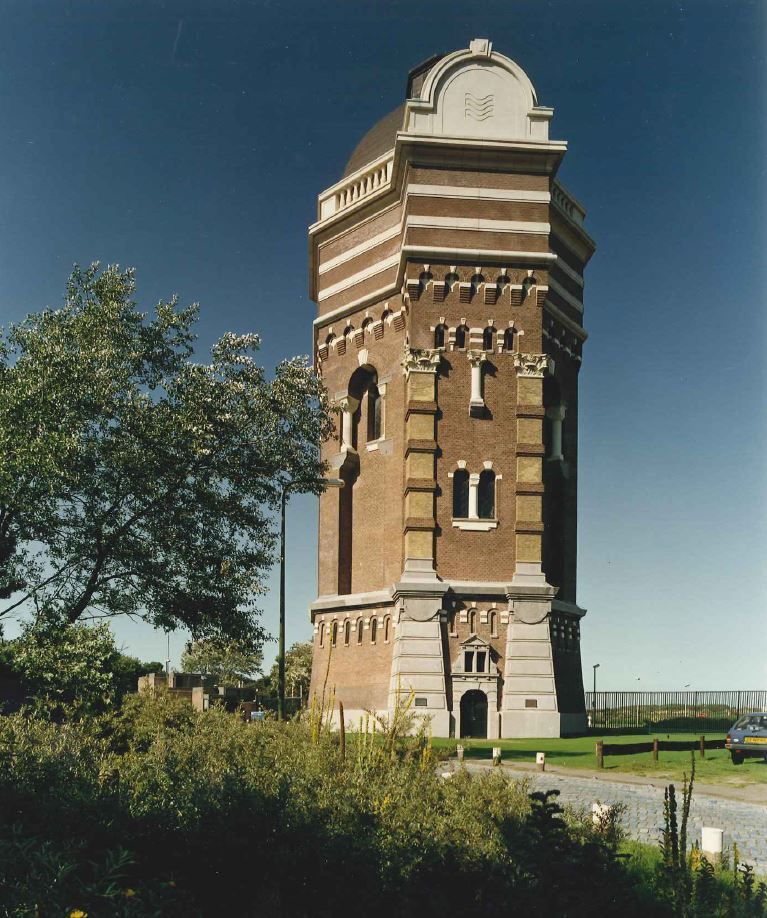 Achthoekige watertoren uit 1874 uitgevoerd in schoon metselwerk. Het is het eerste exemplaar in Nederland waar een bakstenen muur om het reservoir is opgetrokken, hetgeen de zwaar aangelegde onderbouw verklaart. Het uiterlijk van de toren wordt gekenmerkt door een onderbouw in de vorm van een sokkelgeleding, een middendeel met verticale nissen in de gevelvlakken en een bovenbouw met horizontale geleding van sierlijsten, afgesloten door een balustrade. De toren wordt gedekt door een koperen koepeldak.