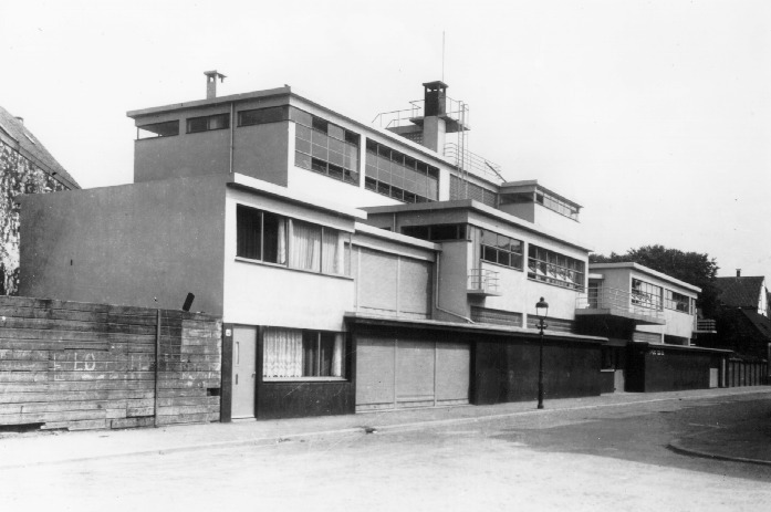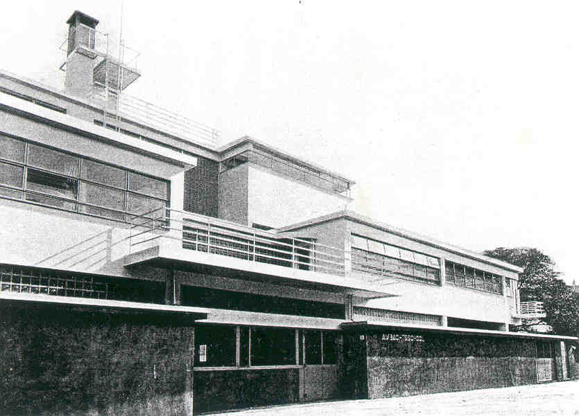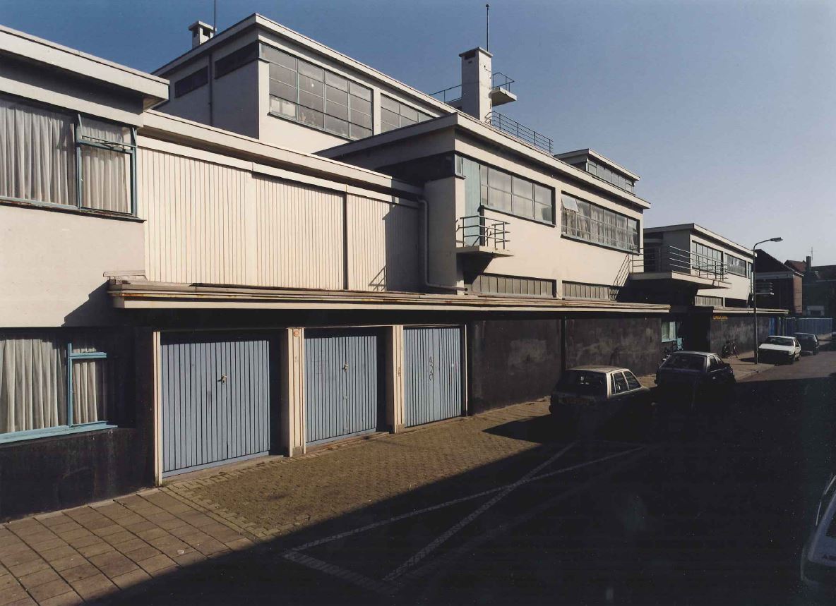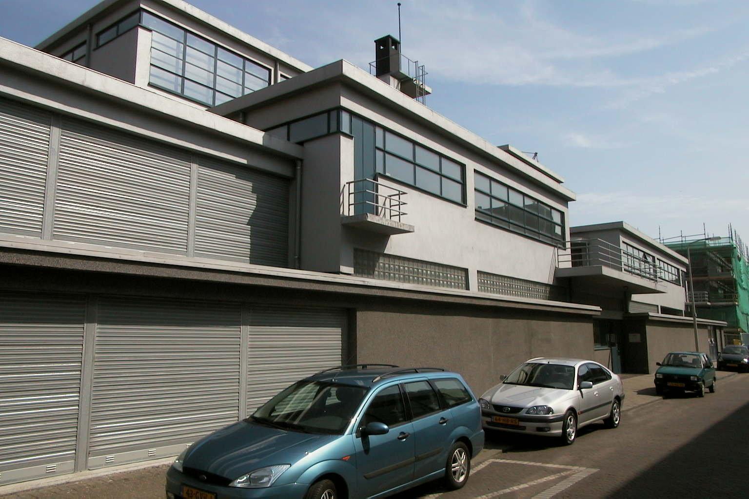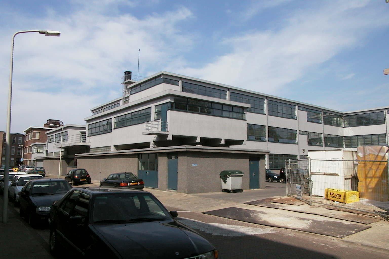 Vrijgelegen voormalige Derde Ambachtsschool, ontworpen door J. Duiker in 1930-1931 op een complexe plattegrond naar de ideeen van het Nieuwe Zakelijkheid.