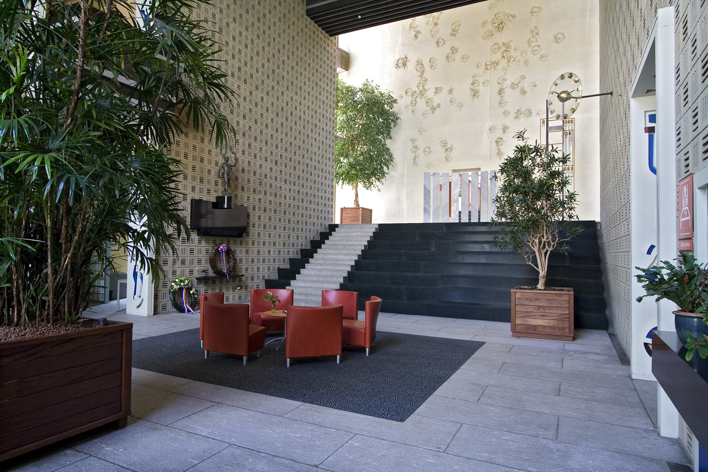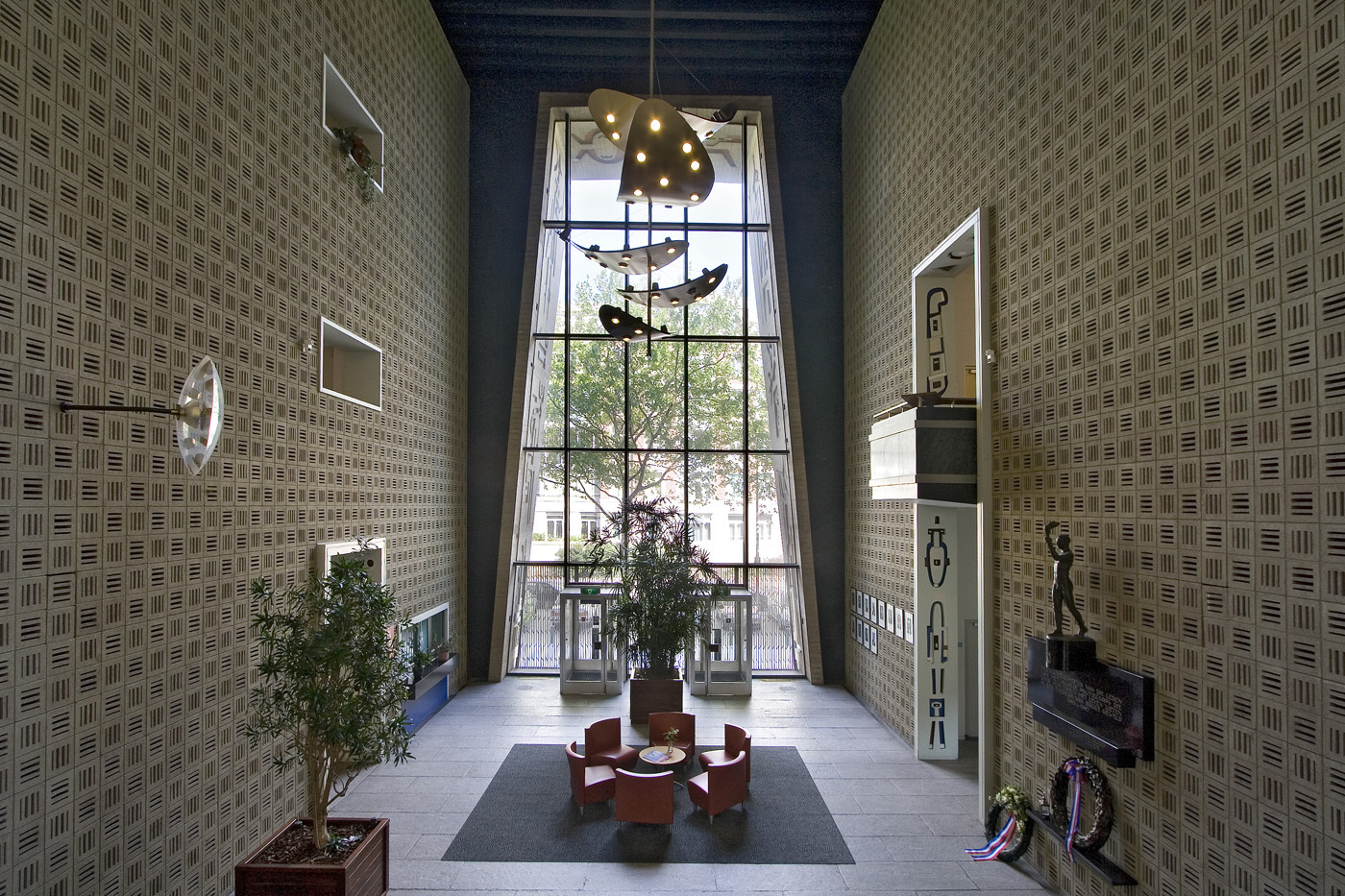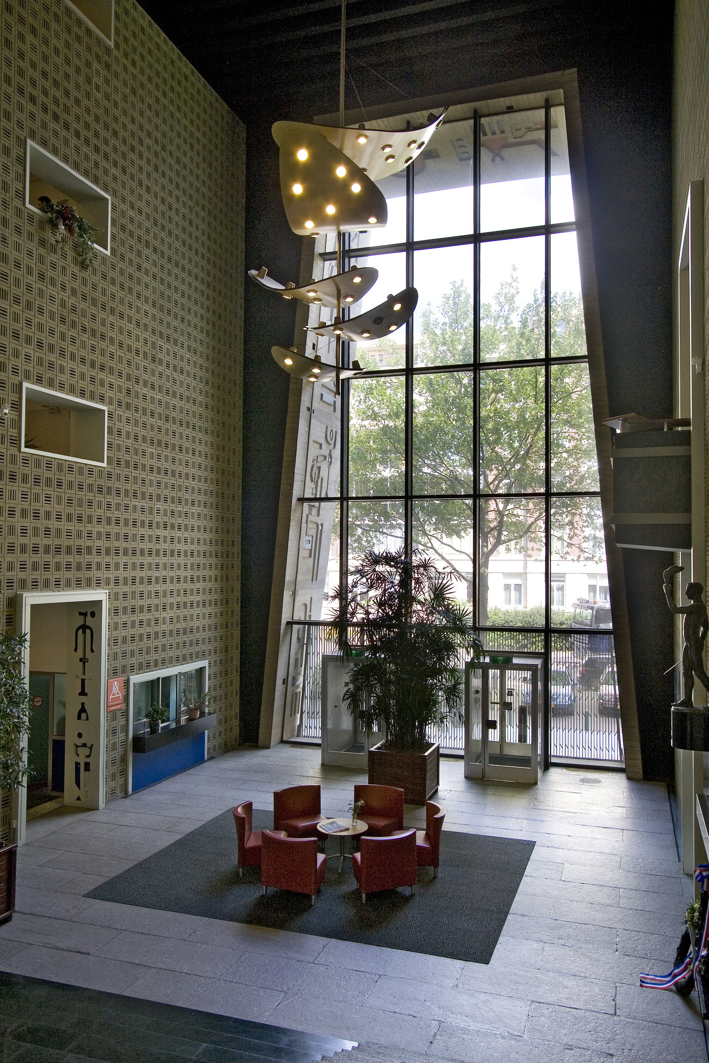 In het verlengde van de hoofdentree is het gebouw voorzien van een trapeziumvormige uitbouw aan de achterzijde, waardoor een monumentale hal over drie lagen is ontstaan, die ook voor bijeenkomsten gebruikt kan worden. Het heeft een hoogwaardig interieur met verschillende decoratieve elementen: twee poorten met geabstraheerde basreliëfs, een achterwand met reliëfs in vorm van gestileerde vissen en vogels, wandbekleding met opengewerkte betonstenen en een met serpentino beklede trap.