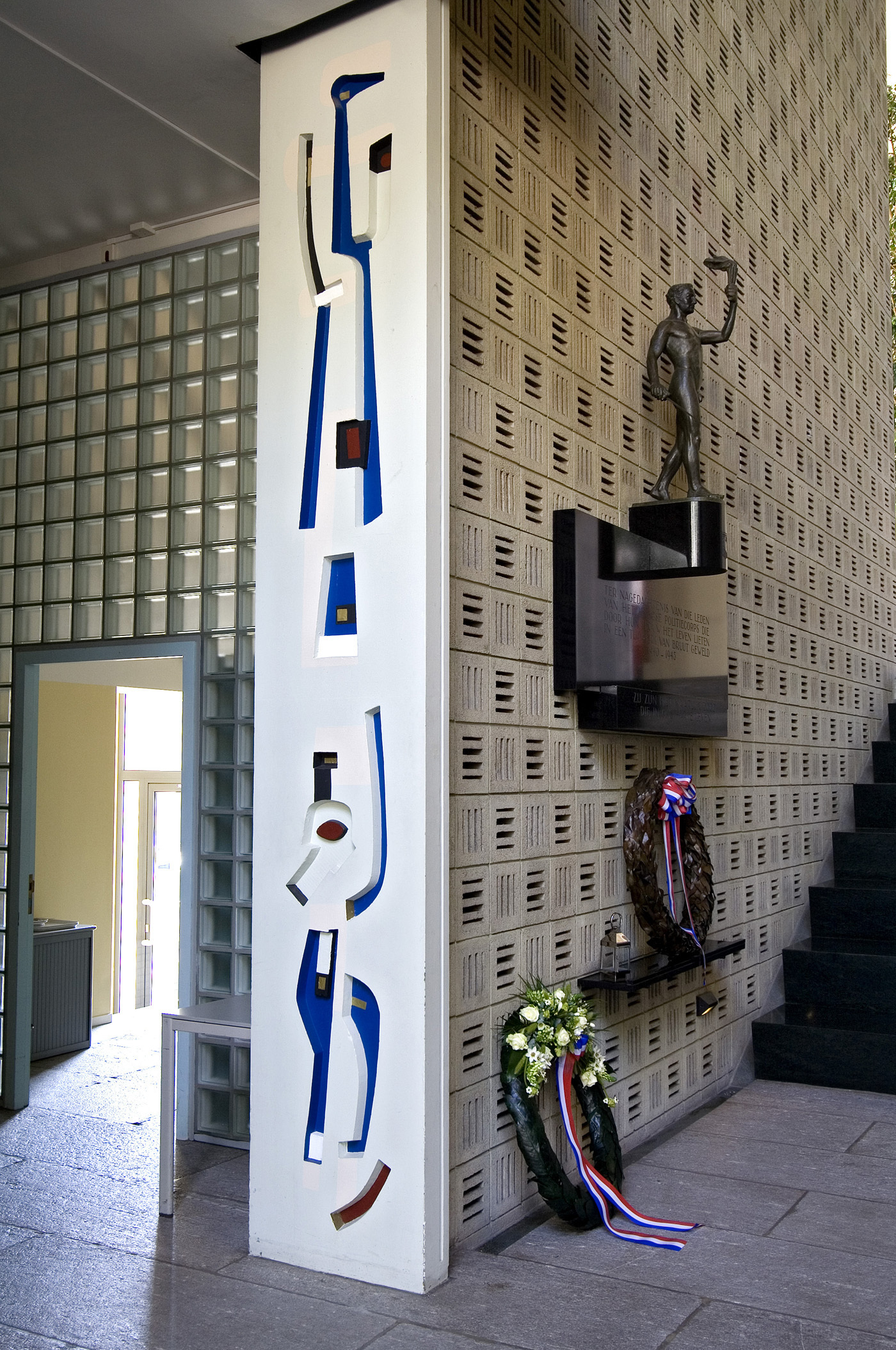 Architect Van de Erve zag de taak van de politie in de eerste plaats als vermanend en bestraffend, en daar paste het beste een streng ogend gebouw bij, wat hij bereikte door strakke lijnen en koele kleuren te gebruiken. In de gevel heeft de architect een onderscheid gemaakt tussen het werkgedeelte (bekleed met schokbeton-raamelementen) en het representatieve deel (bekleed met bakstenen van een speciaal gerekte vorm). In het representatieve deel bevindt zich de hoofdingang, een enorme glazen ingangspartij die omlijst wordt door een hoge betonnen luifel met aan de binnenzijde reliëfs. De reliëfs hebben betrekking op de taak van de politie (handhaving van het gezag en bescherming van de burgers) in de verschillende periodes sinds de Egyptenaren. Het ontwerp is van R.D.E. Oxenaar en J.H. Kuiper.
