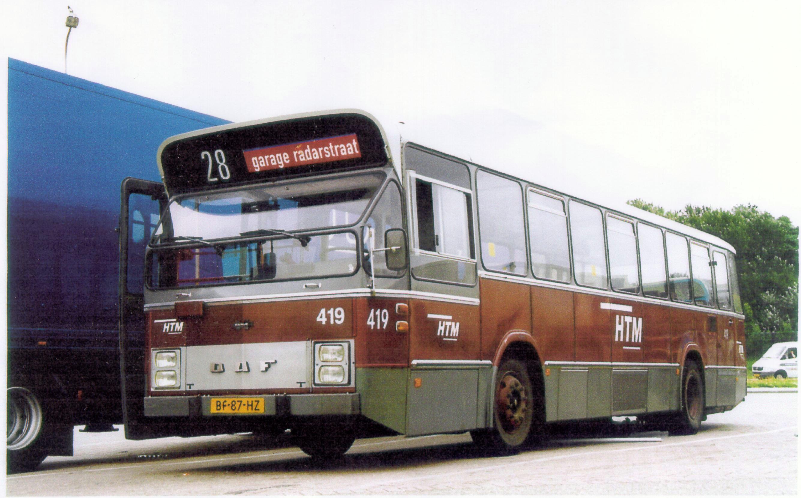 Deze autobus van het type 419 behoort tot de zogenaamde HTM-serie 401/420 en is één van de drie typen wijnrode standaardbussen die in het laatste kwart van de vorige eeuw in de stad hebben gereden. De bus opgeleverd op 11 augustus 1982 werd officieel bij de HTM op 17 augustus van dat jaar in dienst genomen en op 9 december 1994 onttrokken aan de lijndienst. Nadien is de bus in het zijn geheel voorzien van dubbele banken en tot 1998 ingezet voor scholierenvervoer. De vaste standplaats van de bus is het Haags Openbaar Vervoer Museum aan de Frans Halsstraat.