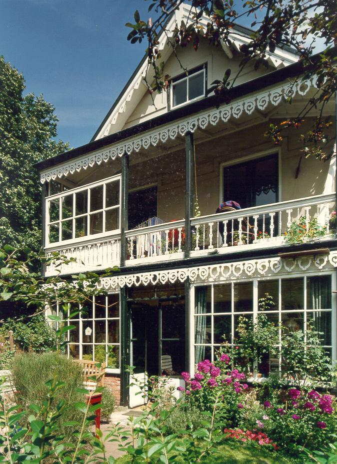 Vrijstaand woonhuis uit het vierde kwart van de 19e eeuw, gebouwd in een eclectische stijl met voor de laat 19e-eeuwse badplaats-architectuur typerende veranda's en sierlijk gesneden houten lijsten.