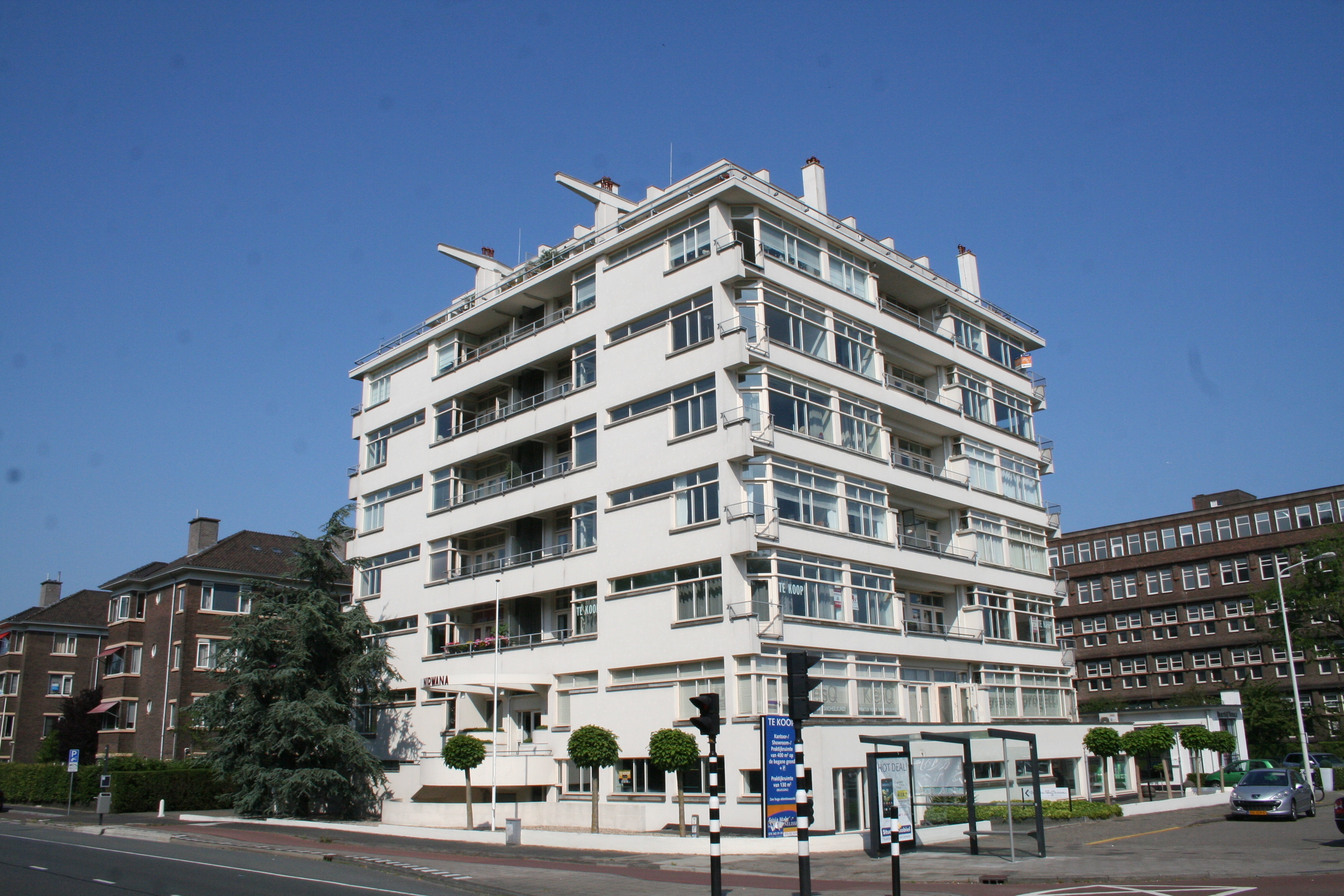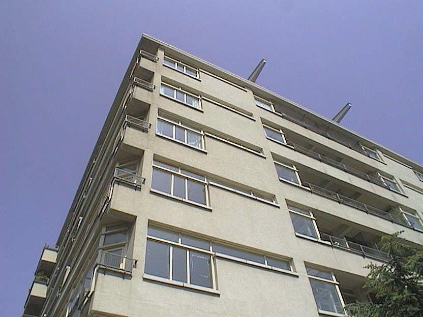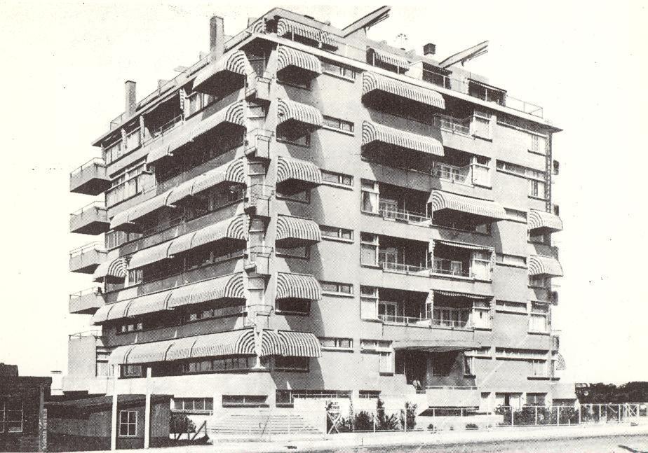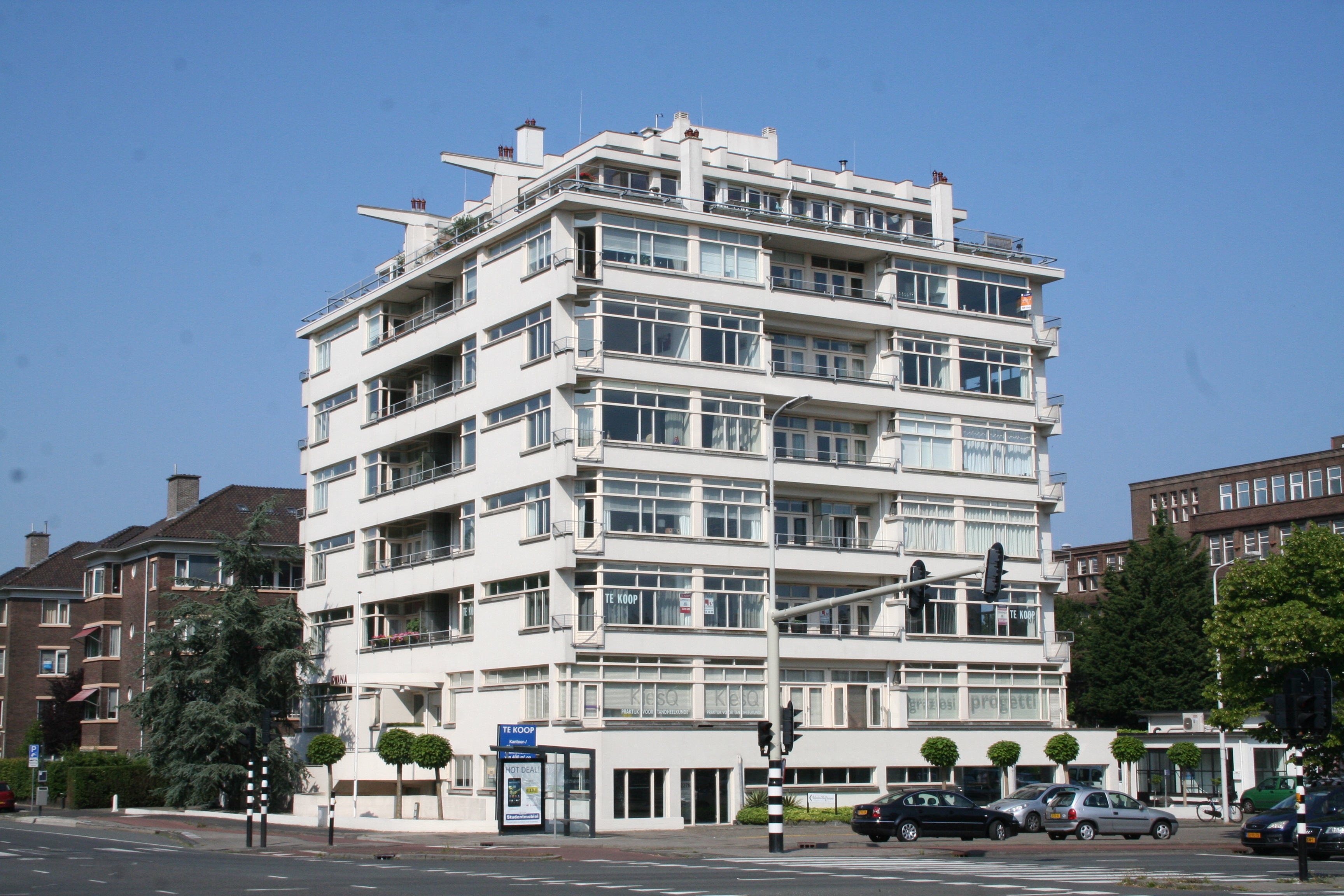 Acht bouwlagen tellend APPARTEMENTSGEBOUW, platafgedekt en opgetrokken met behulp van een gewapend beton-constructie - met teruggeplaatste vensters met stalen kozijnen en betonnen onderlijsten - op een vrijwel vierkante plattegrond, waarbij door subtiele variaties de opbouw niet volledig alzijdig symmetrisch is, doch wel steeds een indeling bevat die is gespiegeld langs een door het midden van de veranda's in het midden van de gevel lopende as, die voorts wordt gemarkeerd door matglazen schuttingen, naar ontwerp van J. Duiker en J.G. Wiebenga in Nieuw-zakelijke stijl in 1927-'29.