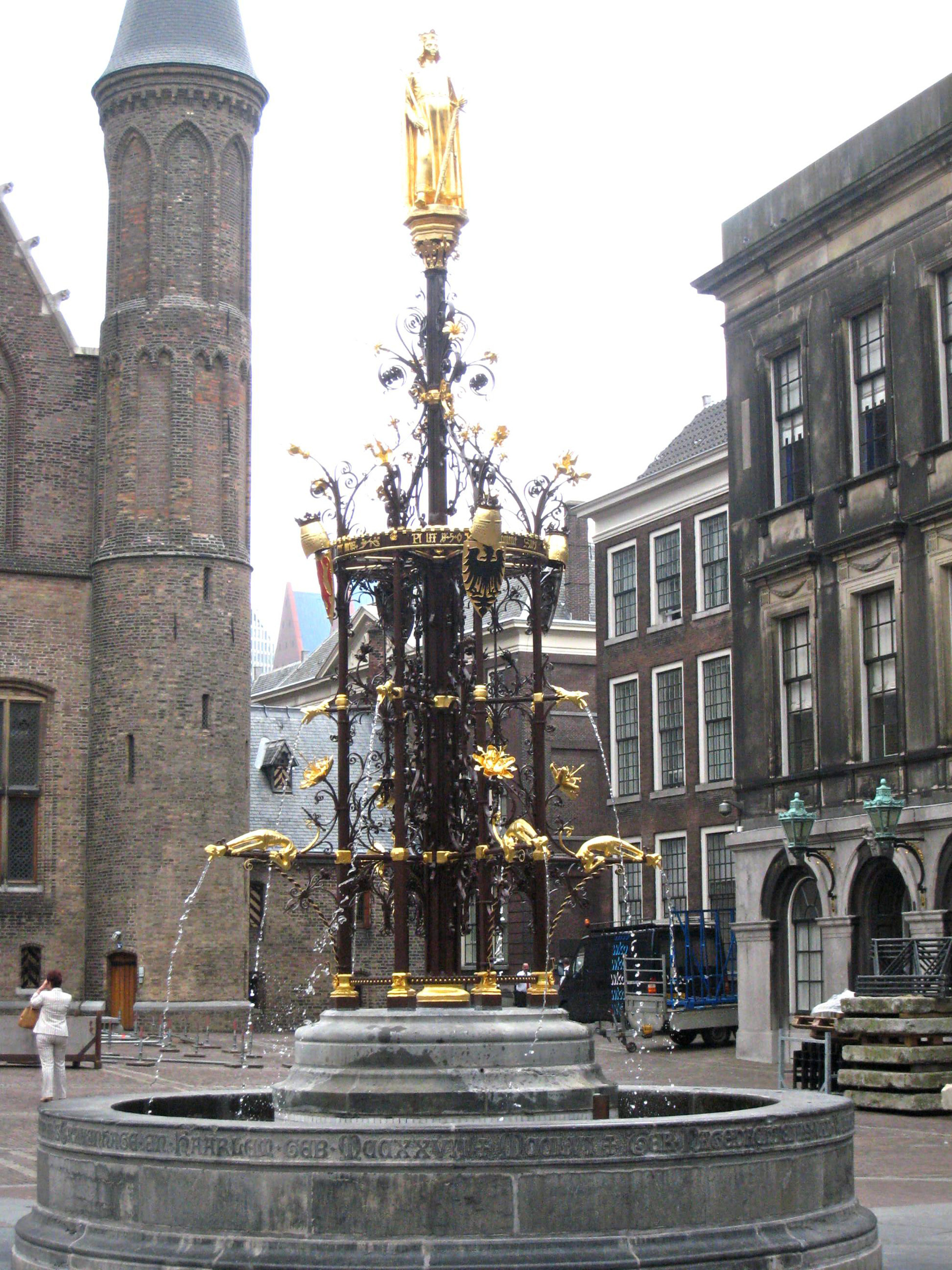 Naar ontwerp van P.J.H. Cuypers in 1885 door C.J. Vincent & Co in neo-gotische trant uitgevoerde smeedijzeren FONTEIN met cirkelvormig hardstenen bassin, gesitueerd op het Binnenhof en aangeboden door Victor de Stuers namens 86 ingezetenen aan de leden van de Staten-Generaal, ter nagedachtenis van graaf Willem II - de Roomse-Koning - en naar aanleiding van de in 1876 begonnen restauratie van het Binnenhof (gerestaureerd ter gelegenheid van het Monumentenjaar M'75 en bij die gelegenheid op een andere plaats herplaatst).