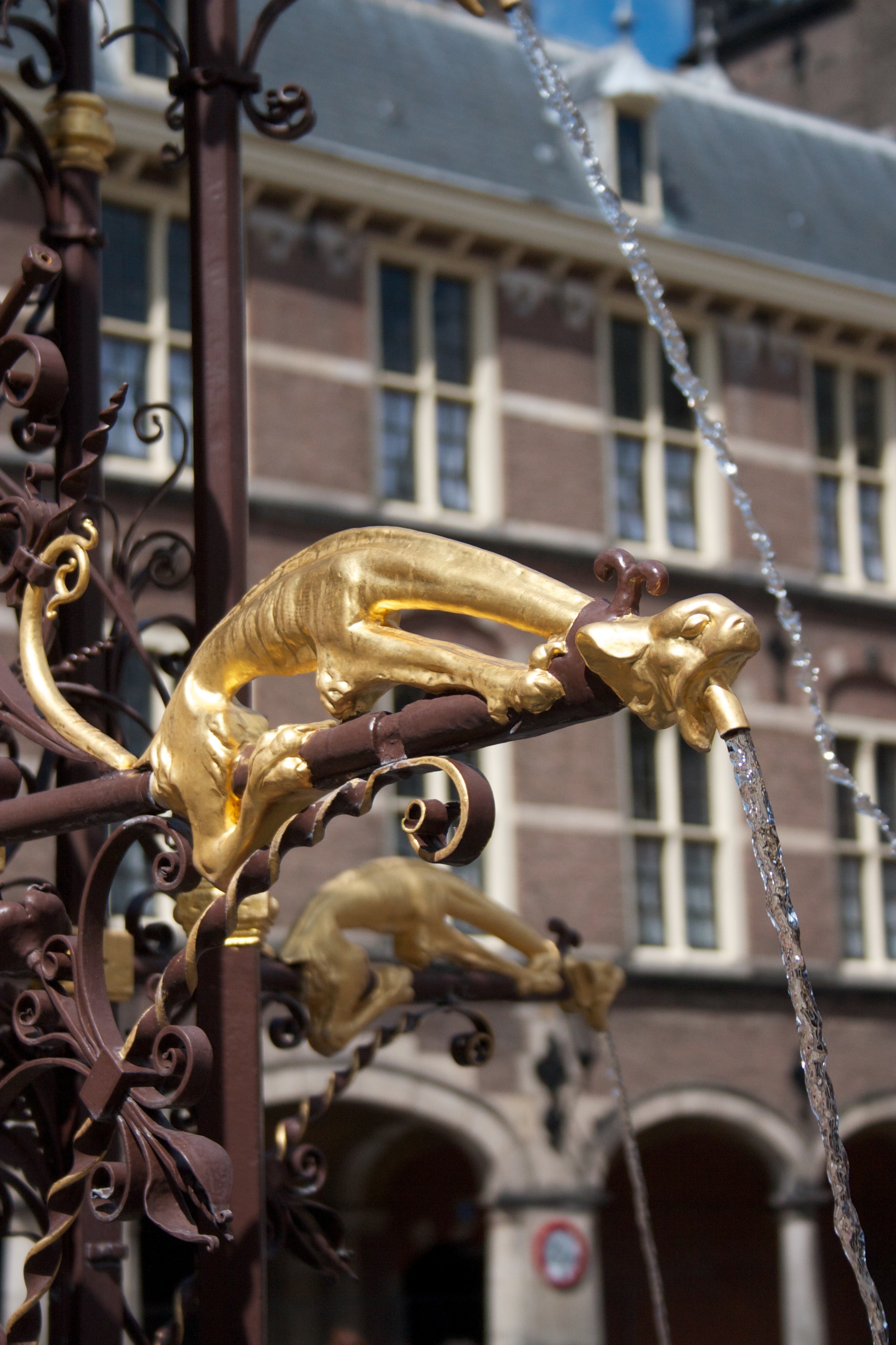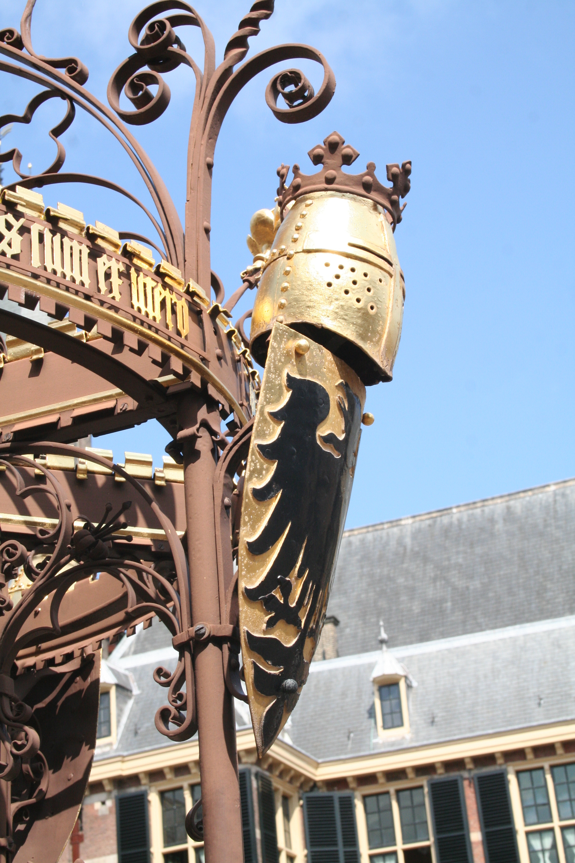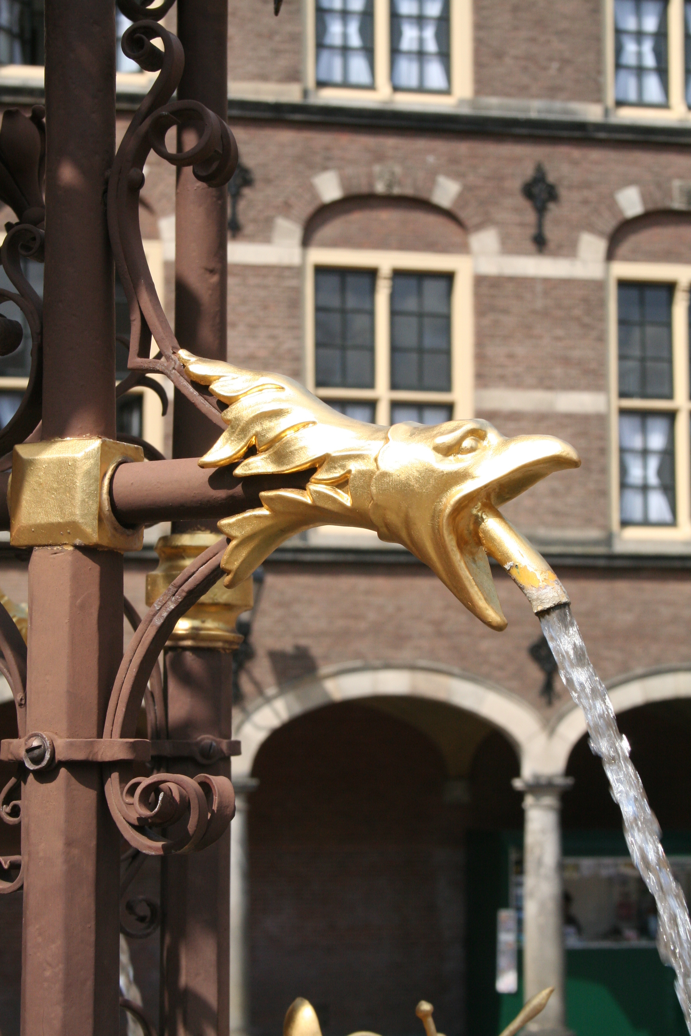 De armen zijn afwisselend van draadvormige spuwers voorzien, bij de eerste geleding als volledige dierfiguren, bij de tweede geleding alleen als koppen; voorts vier wapenschilden door helmen bekroond (beurtelings met de Hollandse leeuw of de Duitse adelaar), die een Latijns randschrift rondom telkens onderbreken.