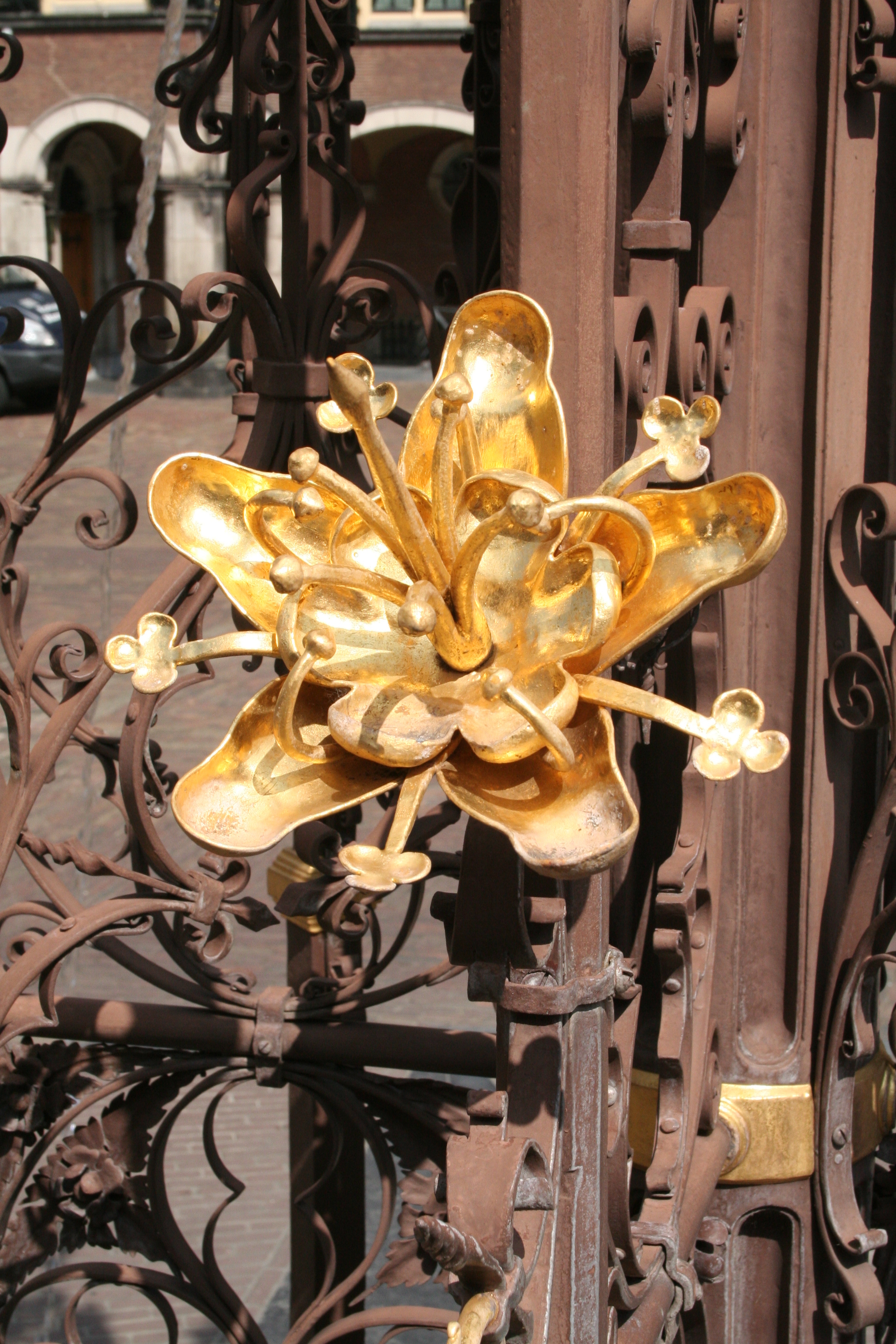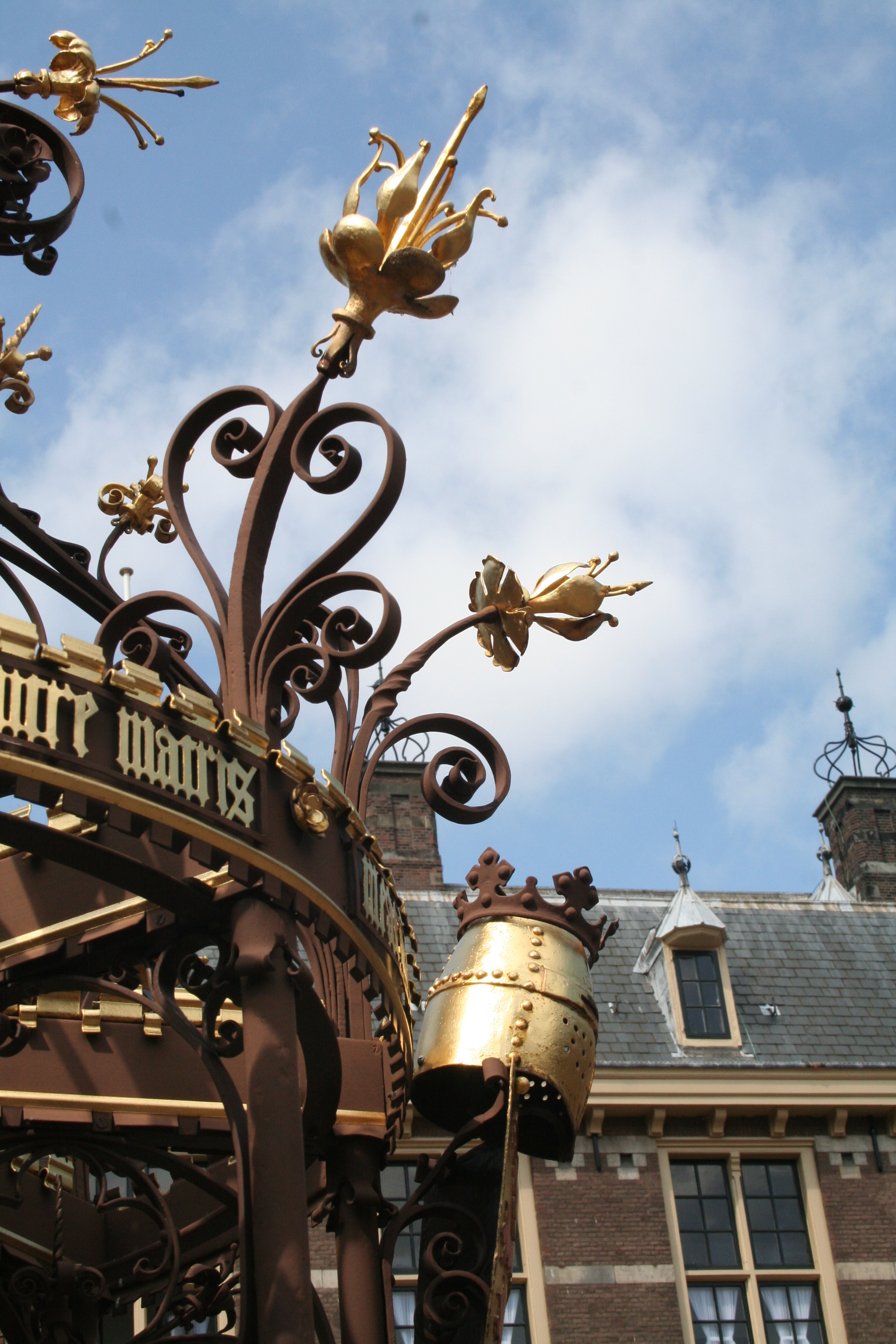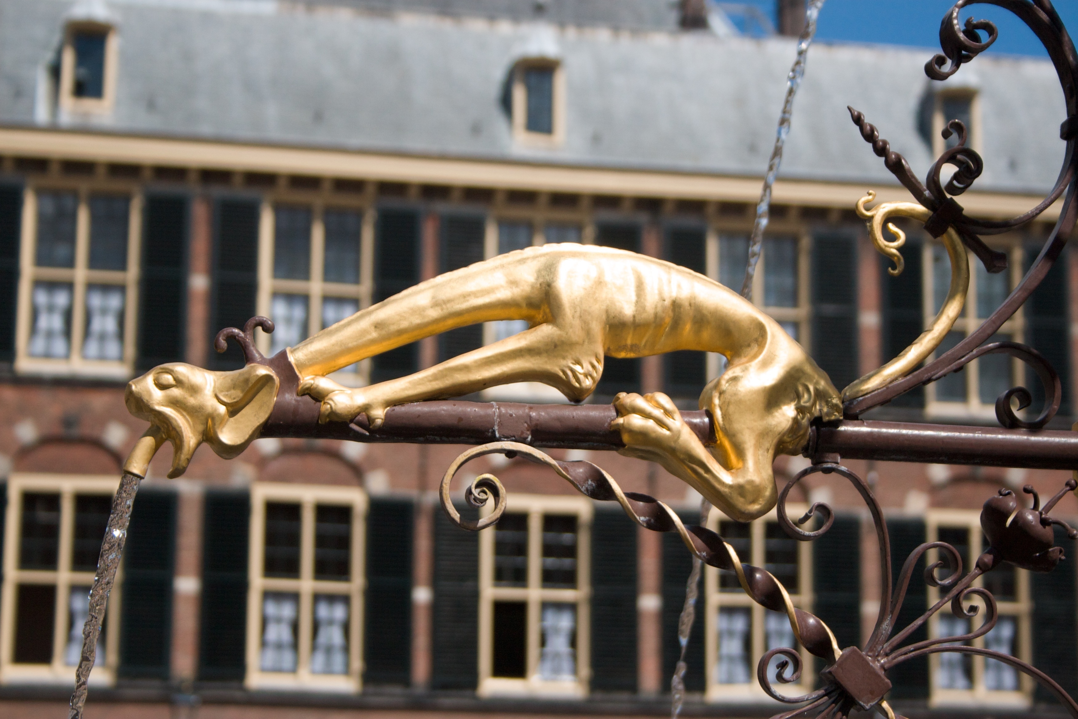 De armen zijn afwisselend van draadvormige spuwers voorzien, bij de eerste geleding als volledige dierfiguren, bij de tweede geleding alleen als koppen; voorts vier wapenschilden door helmen bekroond (beurtelings met de Hollandse leeuw of de Duitse adelaar), die een Latijns randschrift rondom telkens onderbreken.