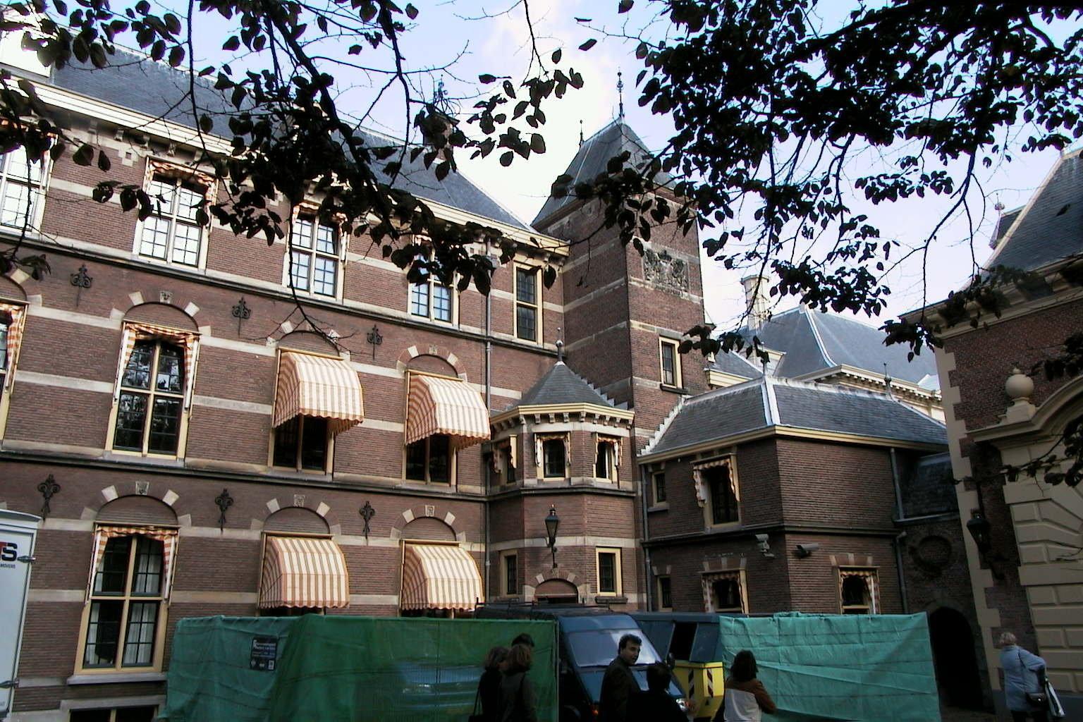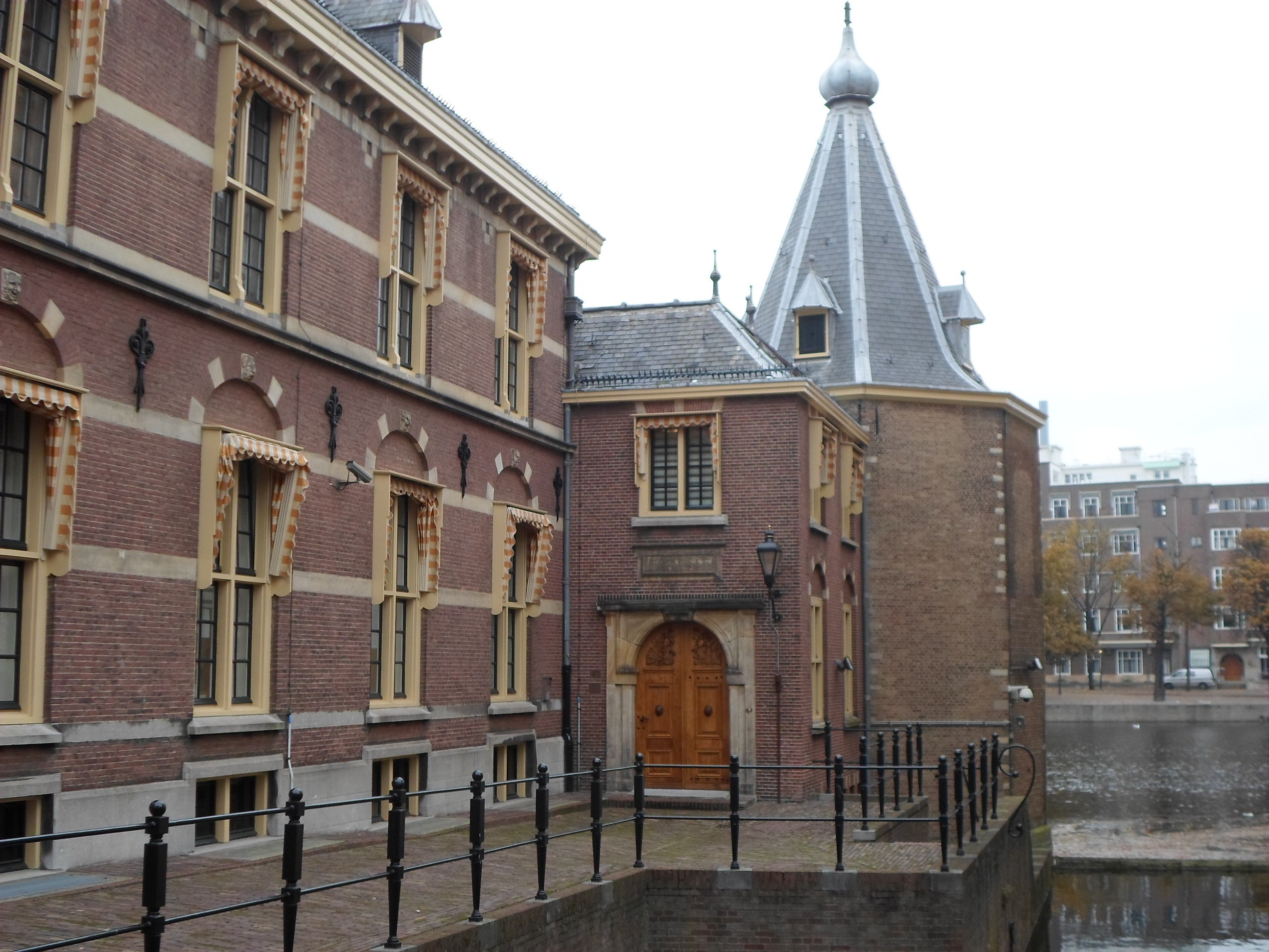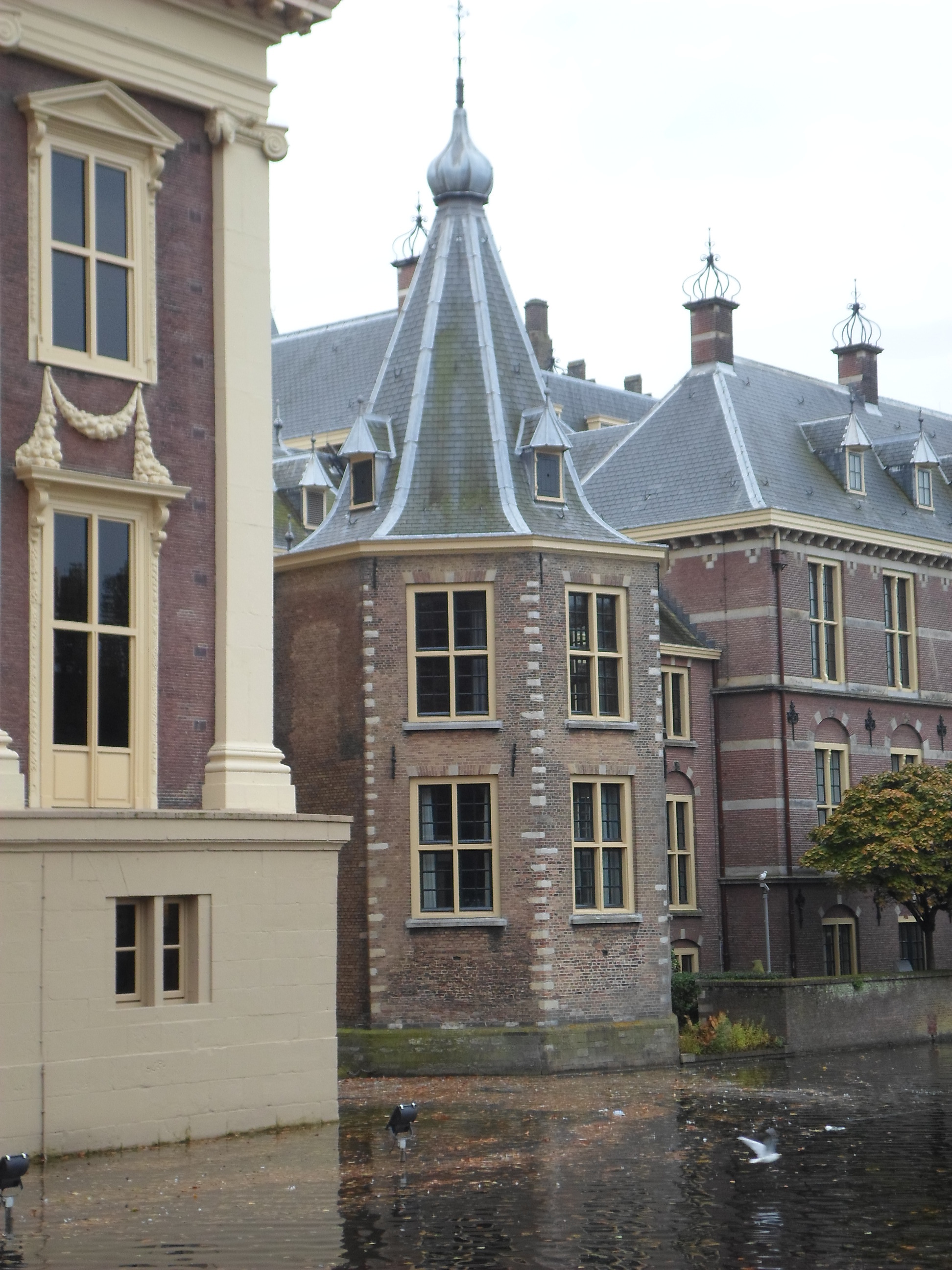 DEPARTEMENT VAN BINNENLANDSE ZAKEN, gebouwd in 1913; aan de zijde van de Hofvijver een achthoekig torentje uit de 15e eeuw en een in oorsprong eveneens middeleeuwse gekanteelde, torenvormige gevel.