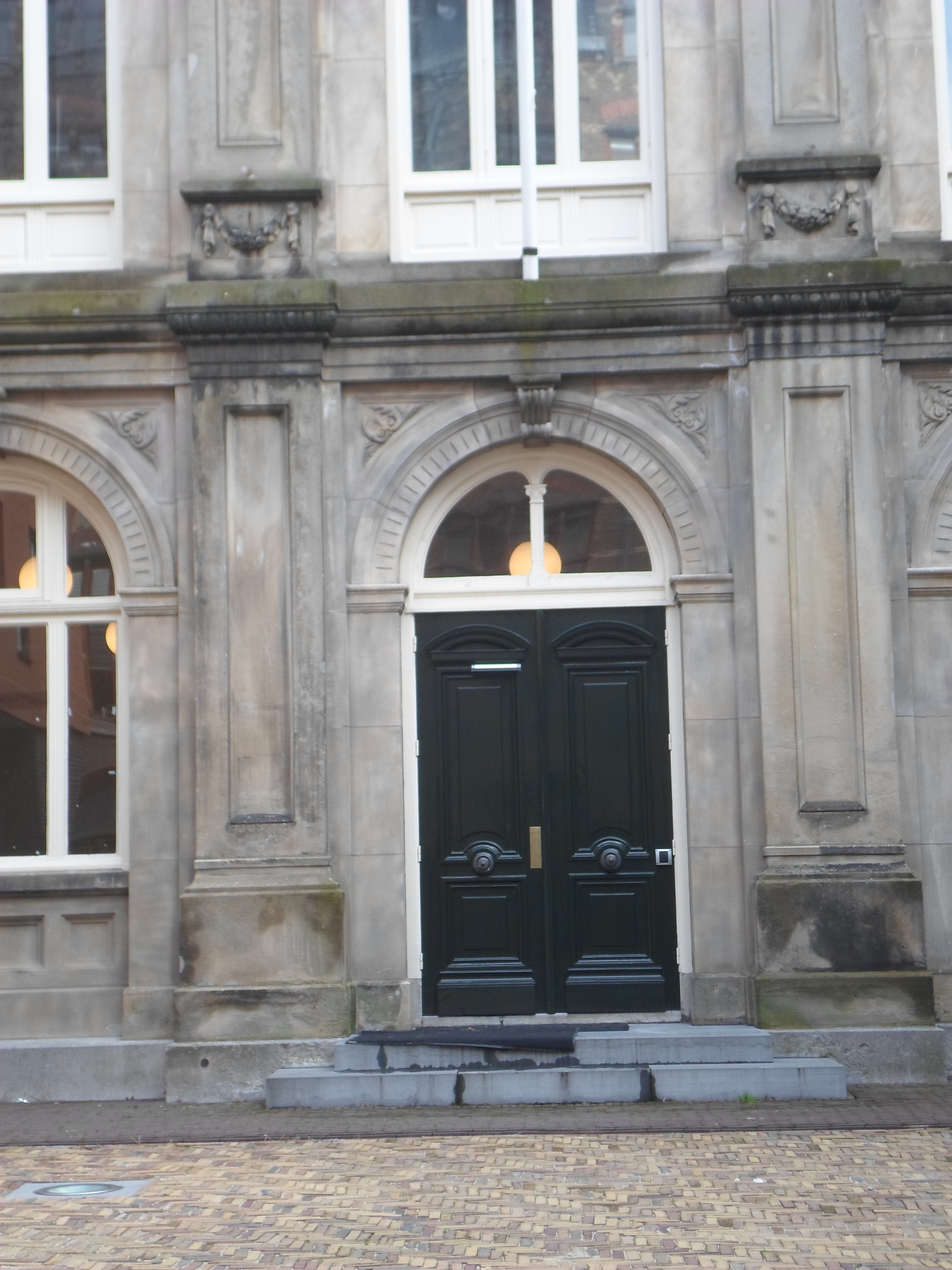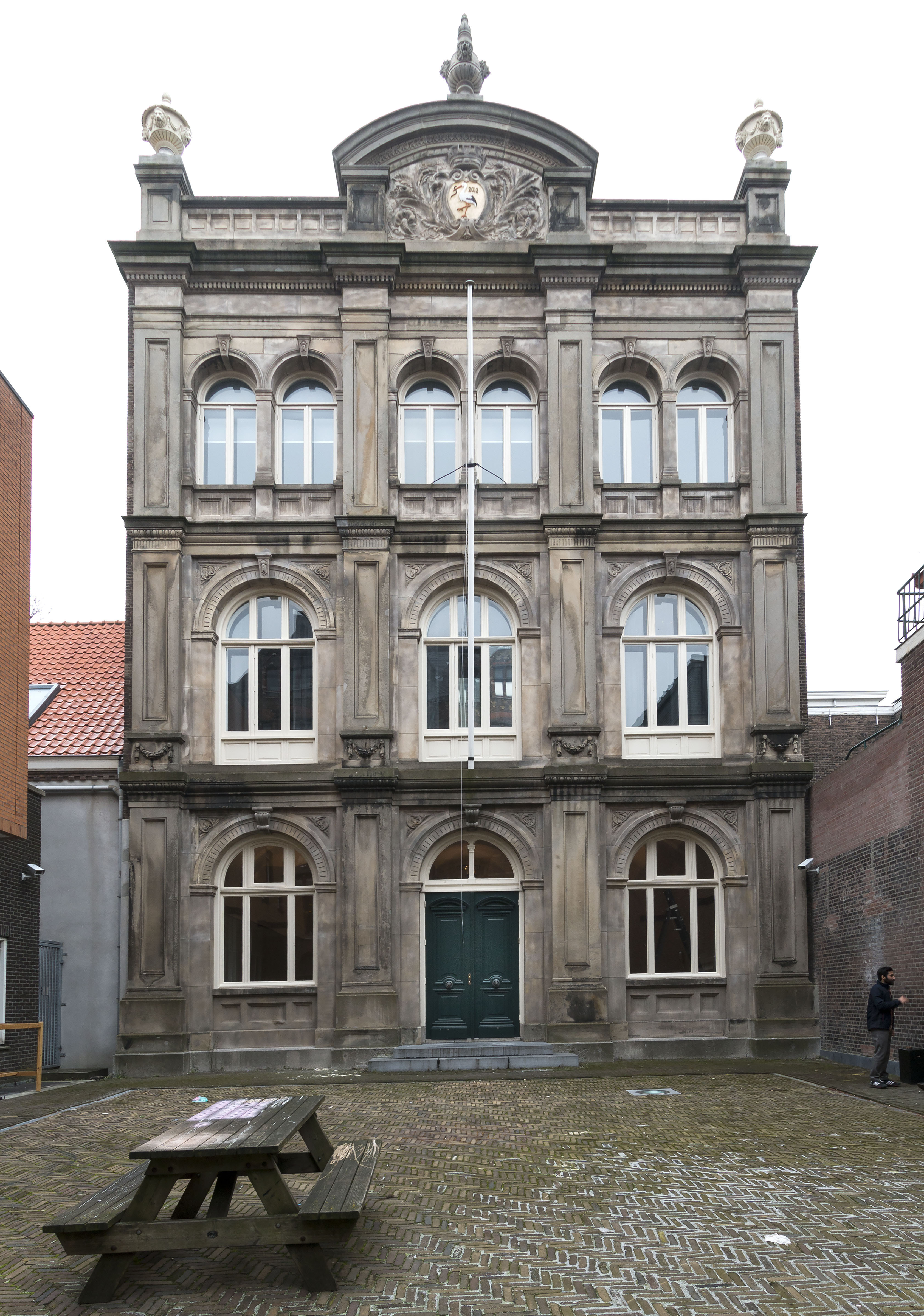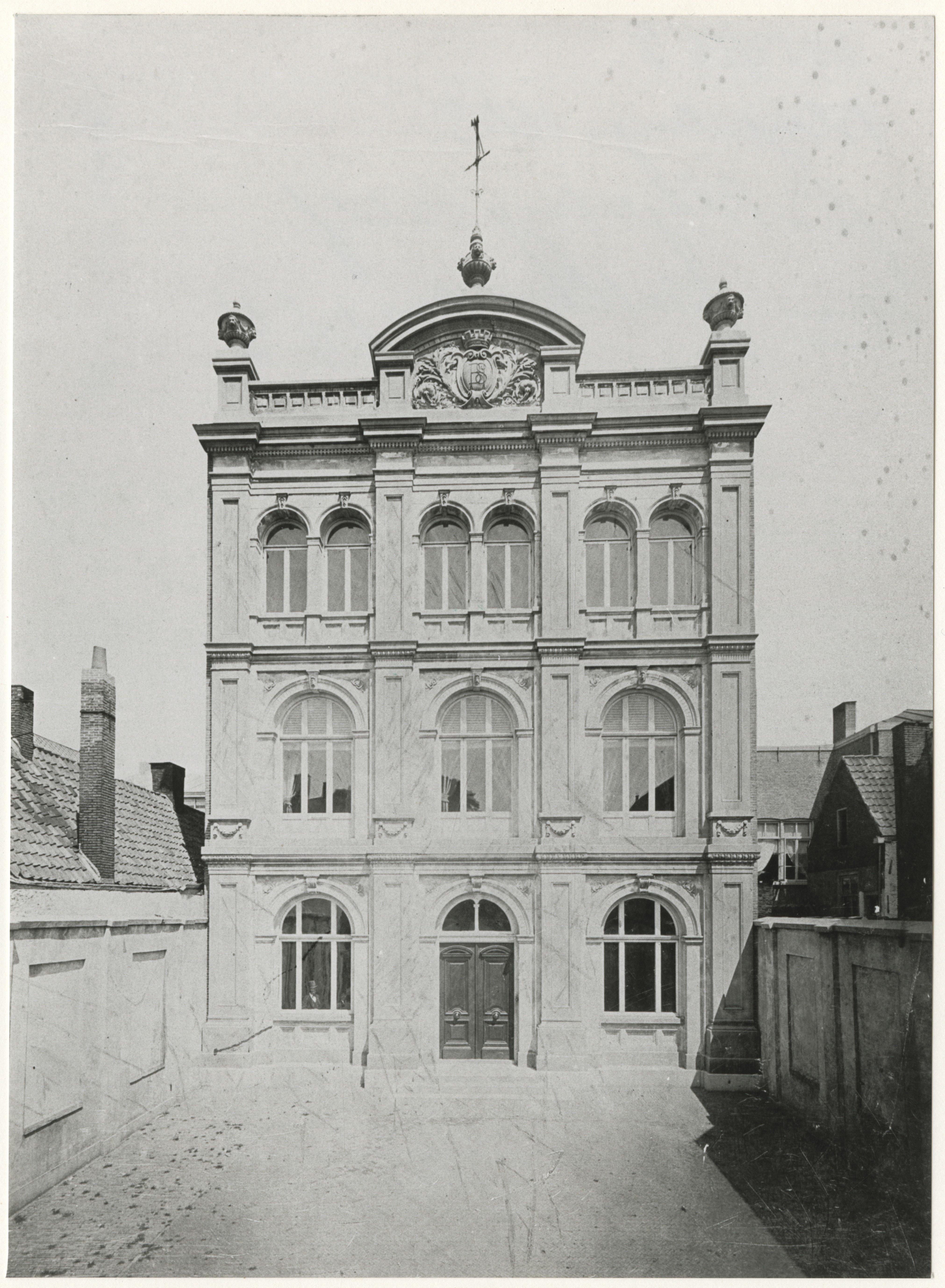 Rechthoekig gebouw van drie bouwlagen, ter breedte van drie brede vensterassen. De rijk gedetailleerde voorgevel is gecementeerd en bezit in natuursteen gebeeldhouwde decoratieve details. De gevel wordt verticaal geleed door verdiepte pilasters per verdieping en bezit tussen de verdiepingen krachtig geprofileerde lijsten. De pilasters van parterre en eerste verdieping dragen met eierlijsten versierde kapitelen. De pilasters op de eerste verdieping bezitten bovendien gebeeldhouwde festoenen tegen de basementen. De rondboogvensters, in parterre en eerste verdieping één per travee en in de bovenste verdieping paarsgewijs gekoppeld, vertonen geprofileerde bogen met sluitstenen, opgaande van pilasters. In de boogzwikken van de vensters in parterre en eerste verdieping zijn gebeeldhouwde vullingen aangebracht. De attiek boven de fors geprofileerde kroonlijst bezit boven het middendeel een gebogen fronton waarin een door gebeeldhouwde acanthusranken omgeven wapenschild met kroon. Op het fronton en op de hoeken van de attiek staan siervazen met onder andere maskerkoppen. De dubbele voordeur is versierd met panelen en bezit in het boogveld een bovenlicht. Het voorplein wordt van de straat gescheiden door een ijzeren hekwerk op hardstenen plint en met in natuursteen gebosseerde hekpijlers. Het interieur omvat een driebeukige vestibule met gemetselde graatgewelven op zware, bakstenen pijlers. Deze geeft toegang tot de grote hal met pijlers op hardstenen basementen en palmetkapitelen. Tegen de gepleisterde wanden bevinden zich pilasters. De hal wordt overdekt door een cassettenplafond. De vloer bestaat uit hardstenen tegels. Het trappenhuis links bezit pilasters tegen de wanden, getoogde vensters en nissen en een plafond met ovaal middenstuk. Langs de trap een houten balusterleuning. De bovenhal vertoont dezelfde vormgeving als de benedenhal.