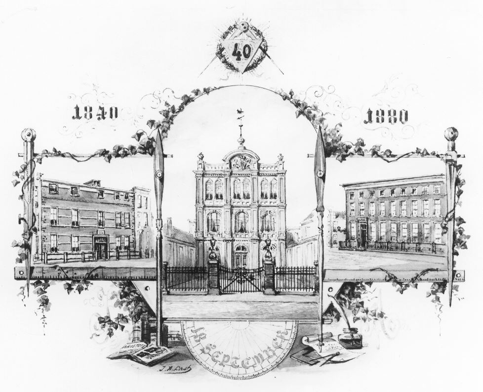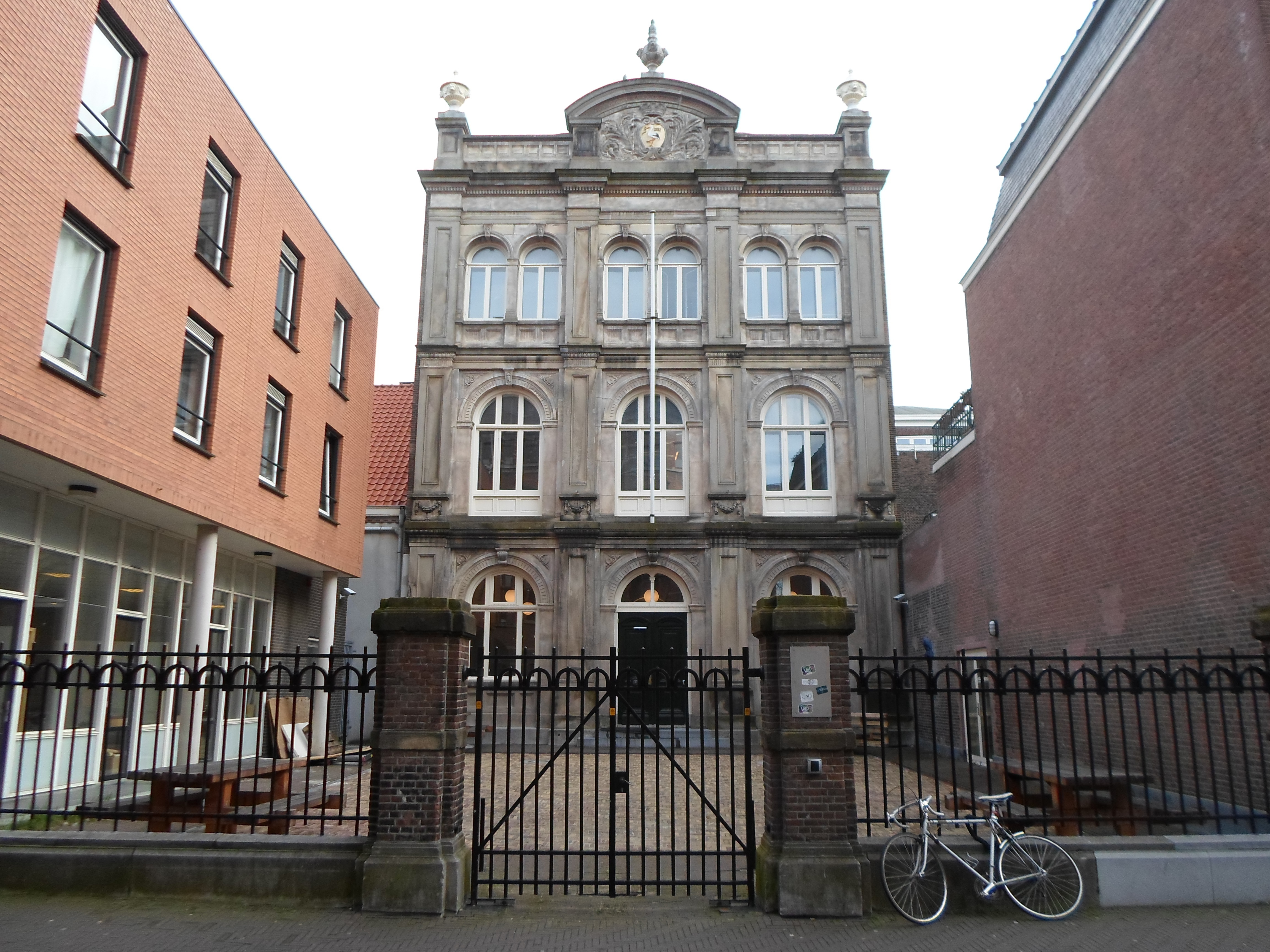 Door een ruim voorplein van de straat gescheiden schoolgebouw, naar ontwerp van B. Reinders, later adjunct-directeur van Gemeentewerken, gebouwd in 1873-1874 in eclectische, op de Venetiaanse renaissance geïnspireerde, stijl. Vanaf 1874 huisvestte dit gebouw de "Eerste Gemeentelijke Hoogere Burger School met vijfjarige cursus", die in 1865 was opgericht.