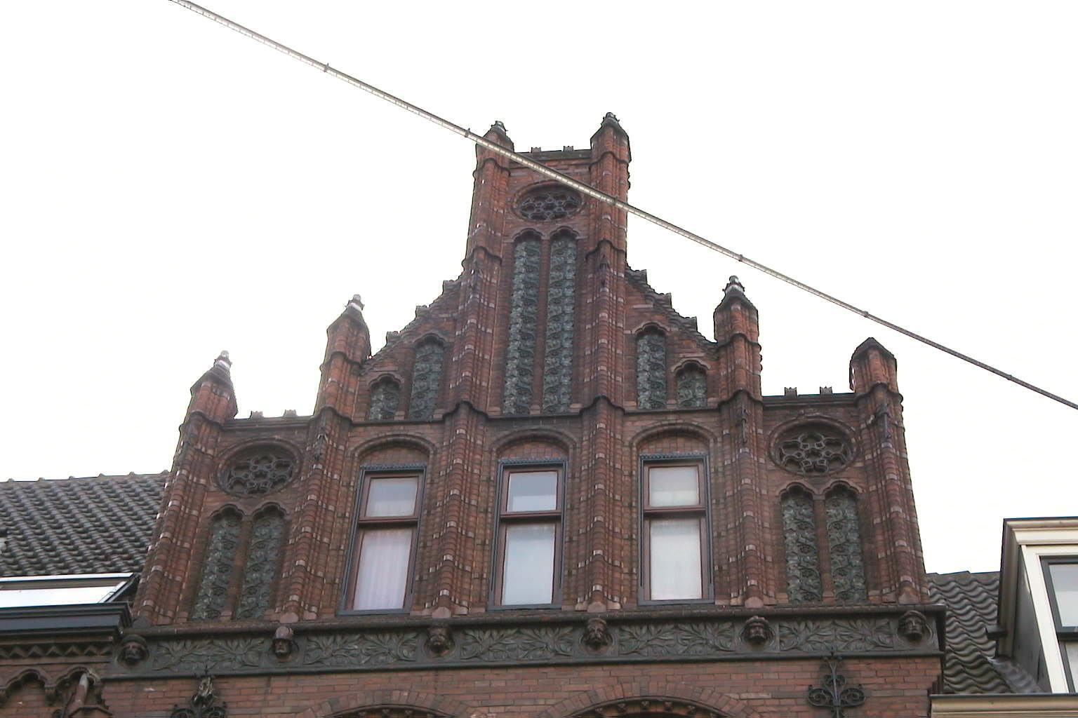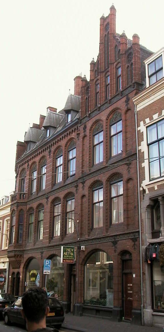 Het pand op rechthoekige plattegrond is zeven vensterassen breed en omvat drie bouwlagen onder een met pannen gedekt zadeldak. De gevels zijn bekleed met verblendsteen en geglazuurde baksteen. De beide vensterassen op de rechterhoek worden bekroond door een rijk gedetailleerde trapgevel met in baksteen uitgevoerde nissen met traceringen, kolonnetten en fioelen. Ook de linker zijgevel draagt een trapgevel met nissen en ezelsrugafdekkingen, waartegen het zadeldak aansluit. De voorgevel bezit friezen met terracotta decoraties tussen de verdiepingen, in korfboognissen geplaatste vensters met terracottaversiering in de boogtrommels, een gemetseld boogfries en een zaagtandfries onder de gootlijst en een gedecoreerd fries met zes maskerkopjes onder de trapgevel. De parterre bevat de ingangen en drie in segmentboogomlijstingen gevatte etalageruiten. Tegen de meest linkse travee is op de verdieping een driezijdig uitgebouwde, gemetselde erker aangebracht, rustend op een rijke onderkraging met tandfriezen, boogfries en fries met terracottaversieringen. De vensters van de erker zijn gevat in spitsboogomlijstingen met lofwerk van terracotta in de boogvelden en in het boogveld van het middelste venster het bouwjaar 1889. De erker wordt bekroond door een klein balkon met gemetselde borstwering. De gevel bezit voorts een aantal sierankers. Het zadeldak draagt een gemetselde schoorsteen met afgeschuinde hoeken en geprofileerde rand, en telt drie dakkapellen met leien dakjes en pirons. Waardering.