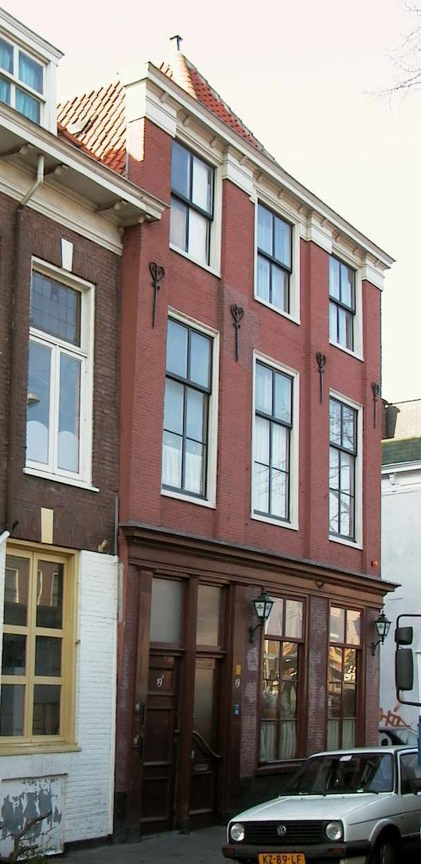 17de eeuws pand ter breedte van drie vensterassen; diepte zes assen. Voorgevel onder rechte gootlijst op klossen. Tussen de bovenvensters muurdammen en vier sierankers uit de bouwtijd. Houten onderpui met ge- tande kroonlijst, dubbele deurpartij met panelendeuren, waartussen een gecanneleerd rond zuiltje. De gevel is rood gesausd. Achtergevel afgeknot en versierd met vlechtingen. In de zijgevel vensters met acht- ruitsschuiframen.