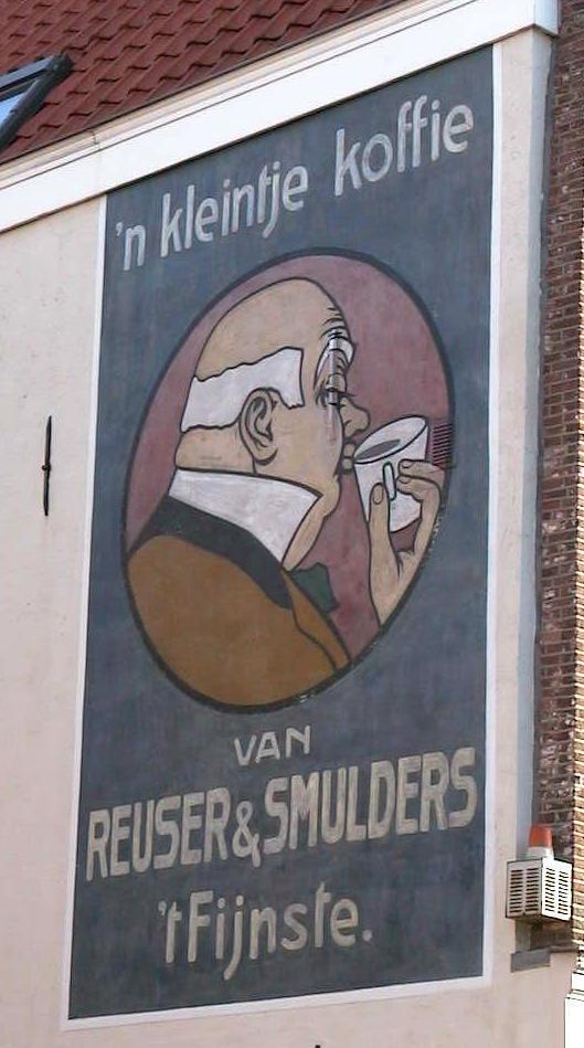 Pand uit de 17de eeuw, bestaande uit twee bouwlagen met kapverdieping in het met pannen gedekte zadeldak dat aan de achterzijde aansluit tegen een gecementeerde puntgevel en aan de voorzijde is afgewolfd.De voorgevel is afgedekt door een houten hoofdgestel met geprofileerde kroonlijst en telt twee vensterassen. De 19de-eeuwse houten winkelpui die in later tijd was gewijzigd, is bij de restauratie die in 1991 plaats vond nogmaals veranderd Tegen de.vrijstaande linker zijgevel bevindt zich een geschilderde muurreclame van de N.V. Koffie-, Thee- en Tabakshandel v/h Reuser & Smulders, die in 1992 werd hersteld. Deze reclame dateert uit omstreeks 1935 en is rechthoekig van vorm. Iets boven het midden is op een blauw fond een rode cirkel geplaatst met daarin in oker, zwart en wit de beeltenis van een koffiedrinkende heer en profil in Biedermeierkledij. In lichtgele schreefloze " Nobel'letters is de volgende tekst geplaatst: " 'n kleintje koffie van Reuser & Smulders 't Fijnste".