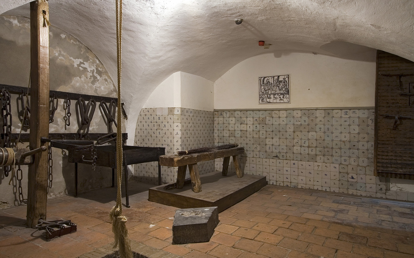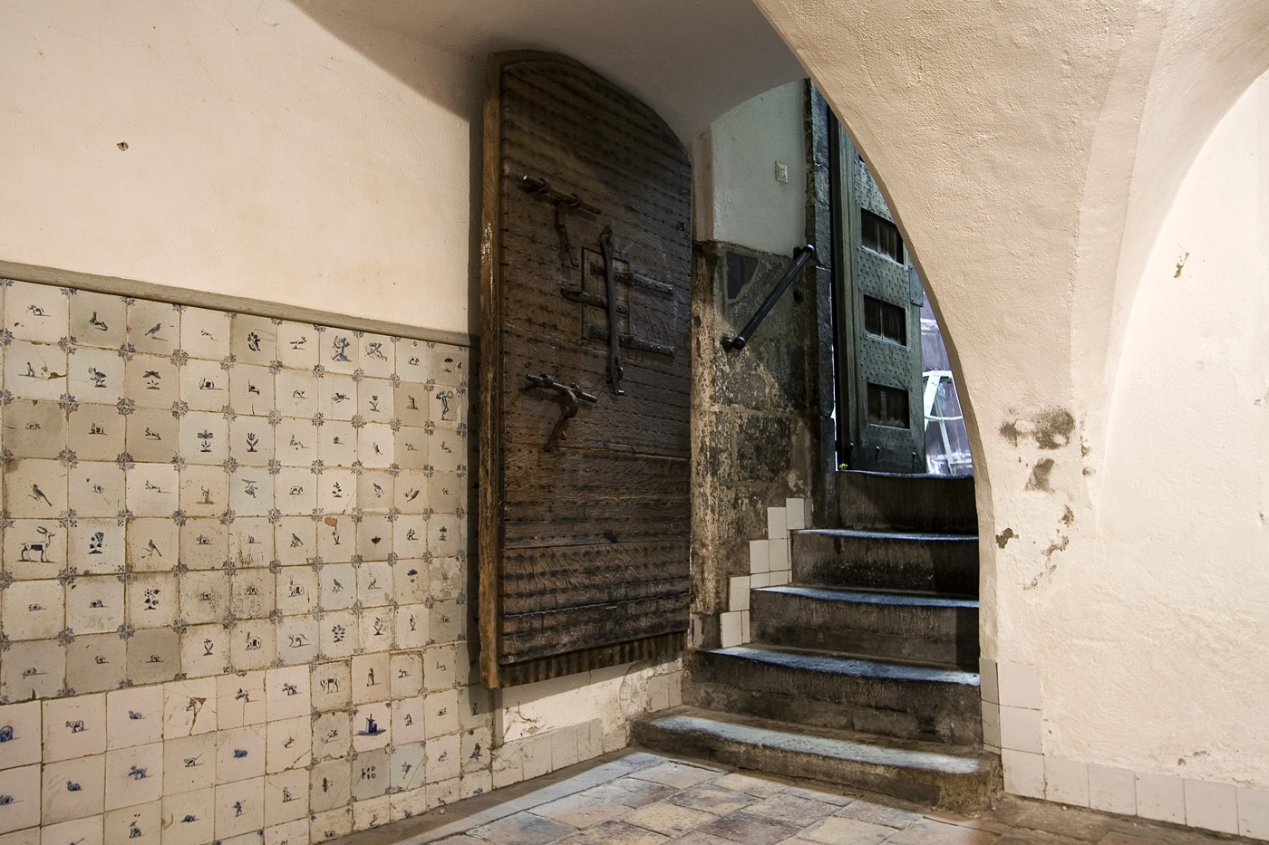 GEVANGENPOORT 14e-eeuws poortgebouw, aangebouwde gevangenis uit de 15e eeuw met overwelfde kelders, 17e eeuws.