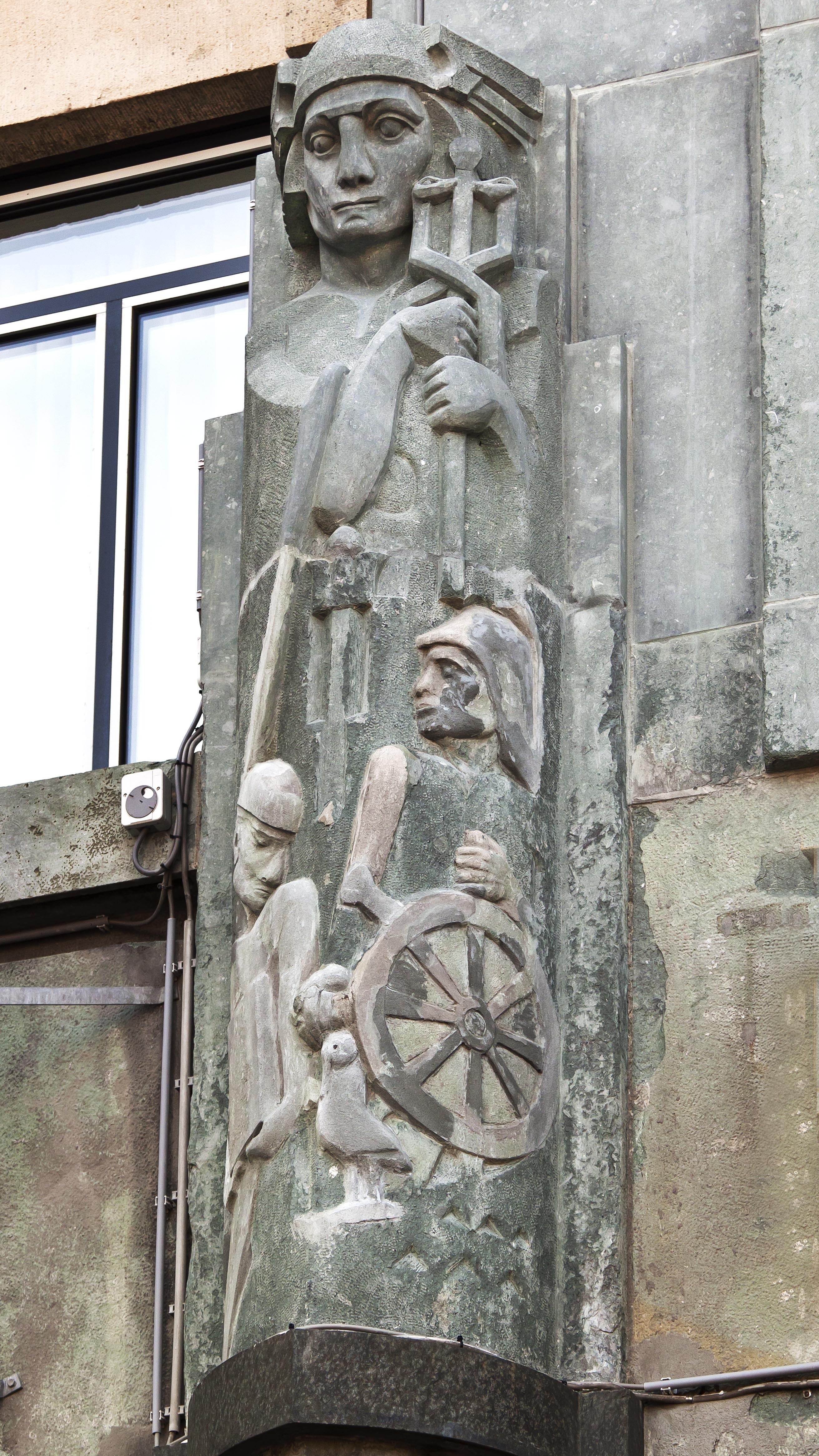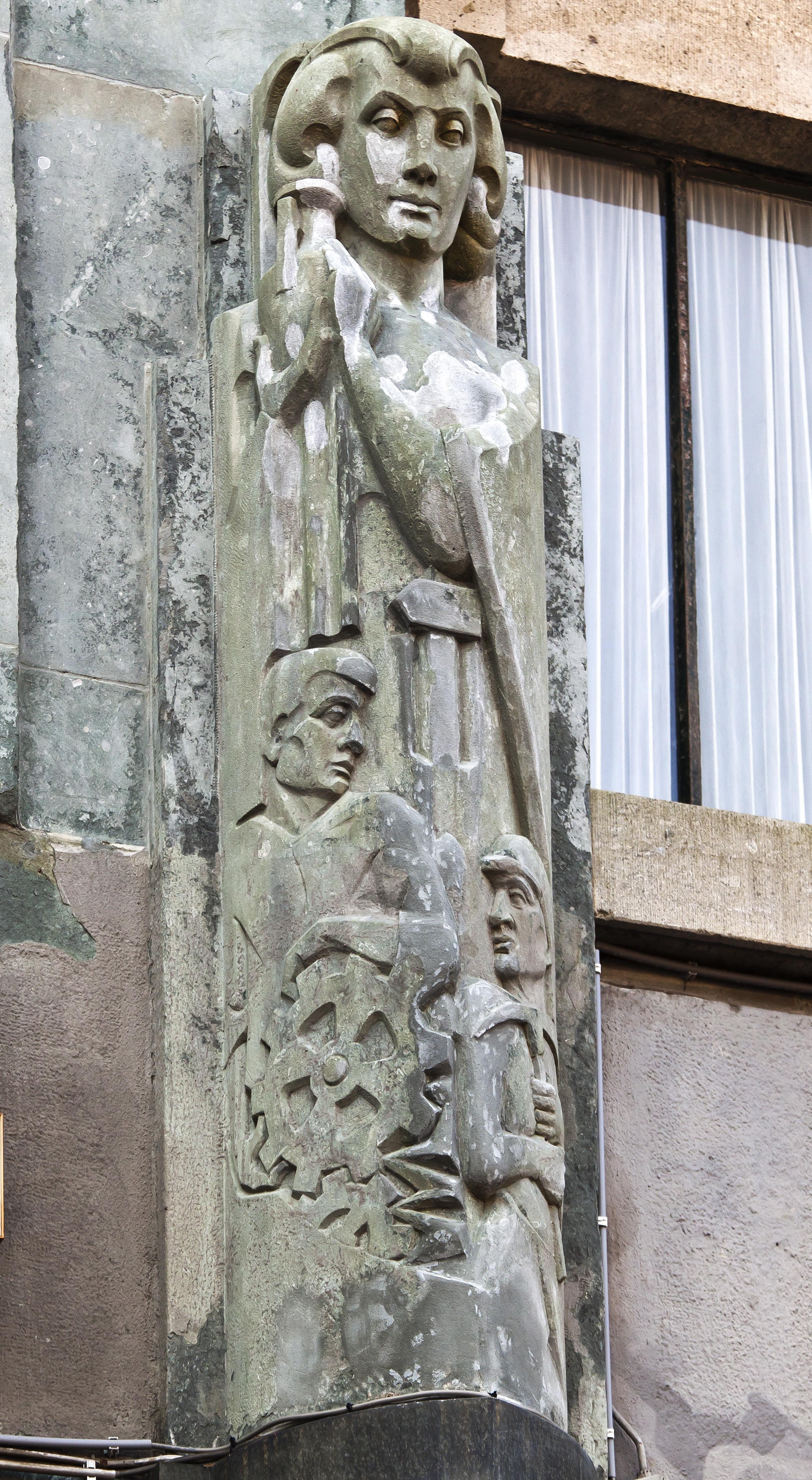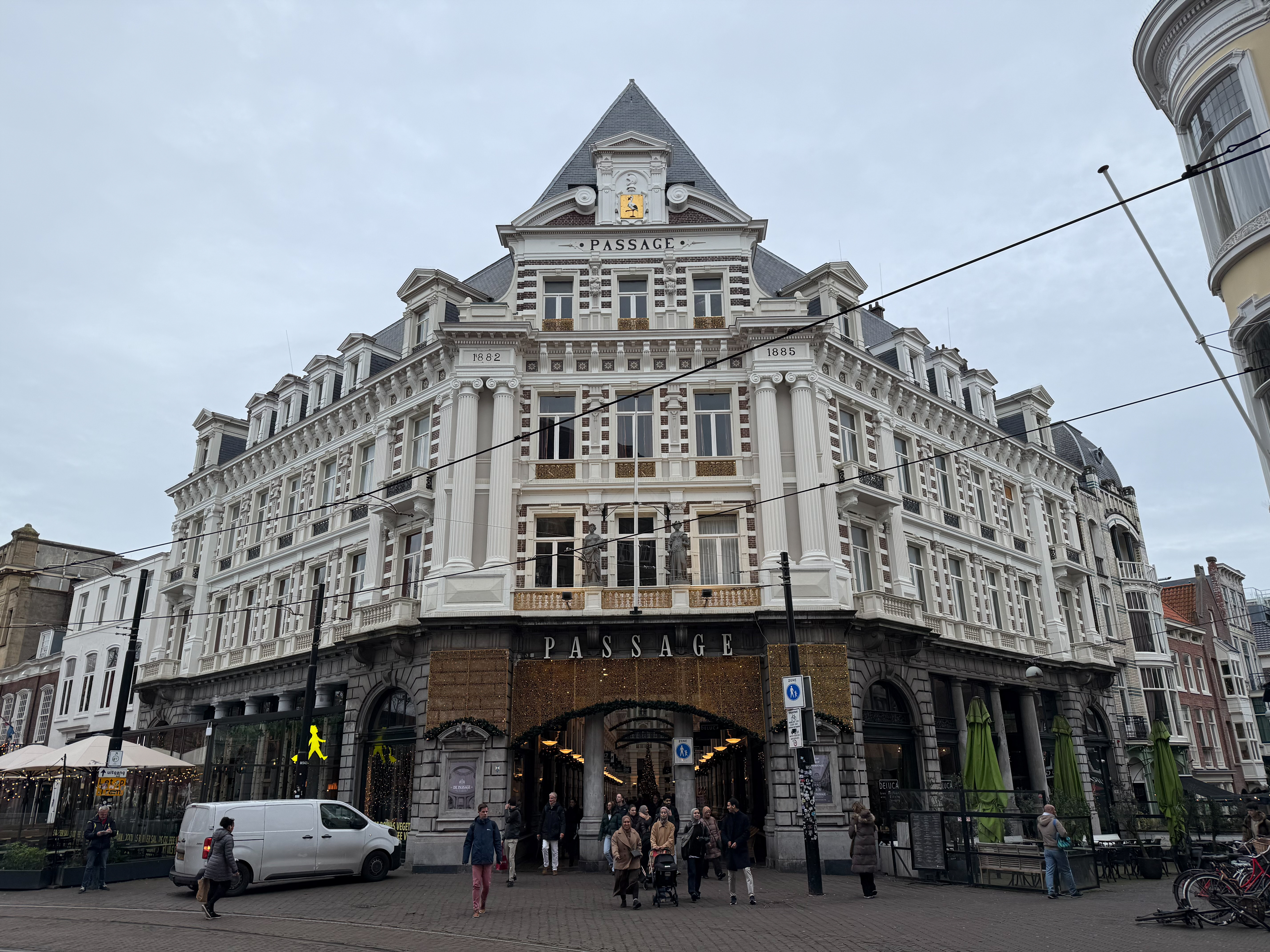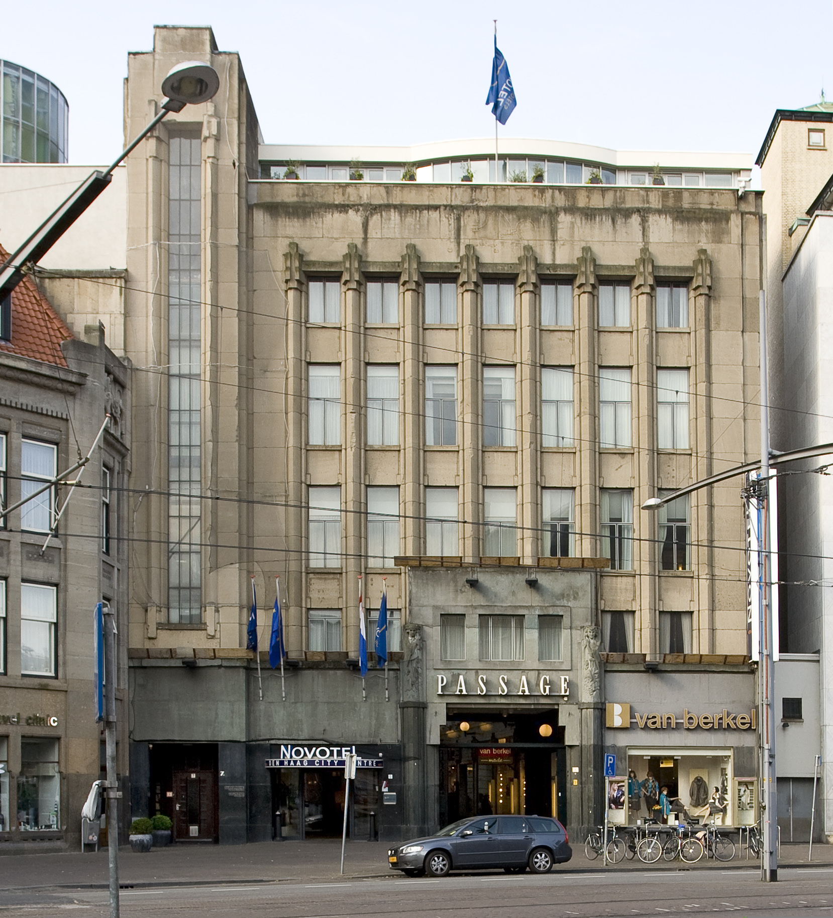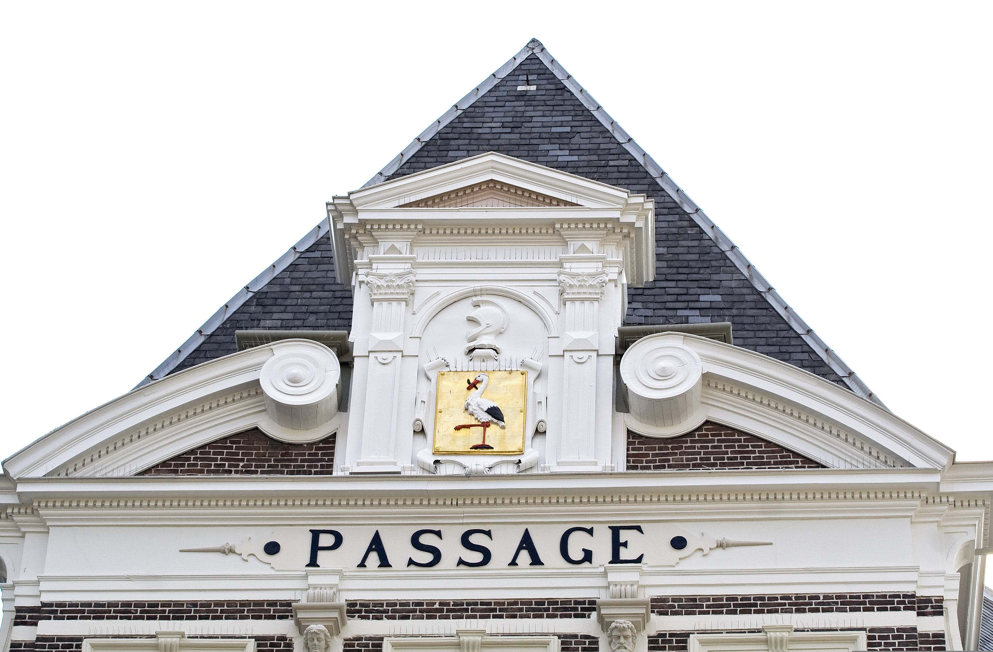 - WINKELPASSAGE, bestaande uit twee door beglaasde kappen overdekte winkelgalerijen die onder een stompe hoek samenkomen bij een door een dertiendelige beglaasde koepel overdekte rotonde; een poortgebouw met hoofdingang en twee zijvleugels op de hoek van Buitenhof en Kettingstraat; een veel eenvoudiger poortgebouw aan de Spuistraat, en twee overbouwde delen over het Achterom - alles gebouwd in 1882-'85 naar sterk vereenvoudigd ontwerp van J.C. van Wijk en H. Wesstra, in internationaal-eclectische trant; en een later tot uitvoering gekomen derde arm naar de Hofweg, in expressionistische trant naar ontwerp van Jos. Duynstee in 1928-'29.
