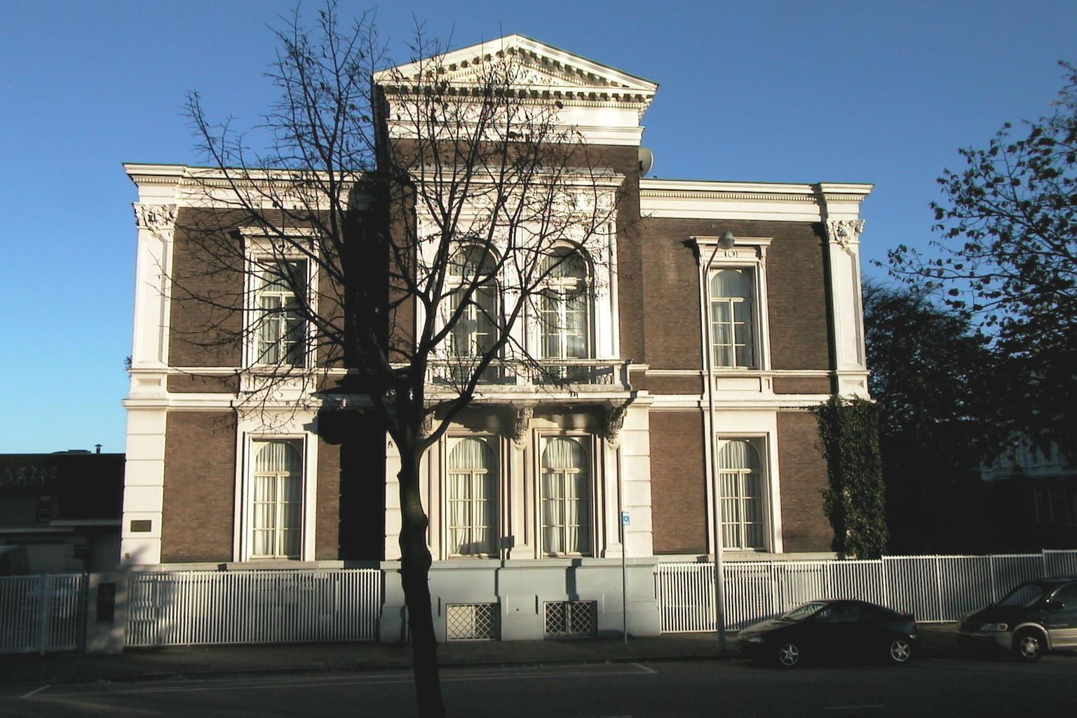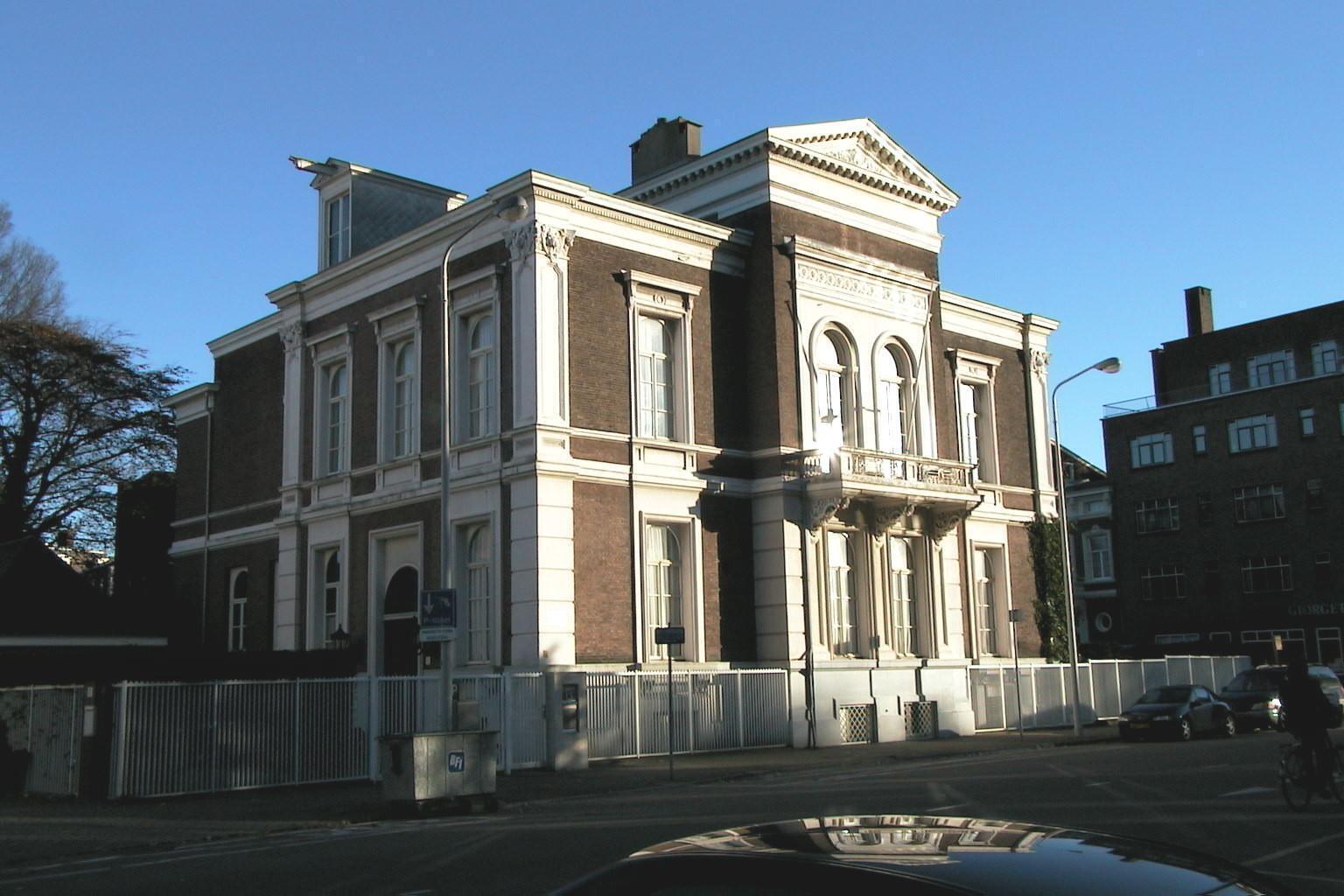 Herenhuis op rechthoekige plattegrond, bestaande uit een souterrain en twee bouwlagen, vier assen breed. Het dak bevat aan de linkerkant een dakkapel met driehoekig fronton. Beide zijvleugels zijn verder plat afgedekt. De gevels zijn van baksteen, met uitzondering van het hardstenen souterraingedeelte, en op de hoeken gemarkeerd door gepleisterde pilasters met composiete kapitelen. De schachten zijn op de eerste bouwlaag geblokt en op de tweede voorzien van verdiepte velden. De bouwlagen worden van elkaar gescheiden door geprofileerde, gepleisterde cordonlijsten. Het hoofdgestel is voorzien van een tandlijst. De middenas van de voorgevel is als risaliet behandeld en hoger opgetrokken onder een zinken roeven zadeldak. Het risaliet bezit op de eerste bouwlaag een geblokte bepleistering. De twee hierin geplaatste zesruitsstolpramen met rondboogbovenlichten worden omlijst door pilasters met verdiepte velden. Boven de vensters bevindt zich een balkon met smeedijzeren hekwerk en gebeeldhouwde panelen aan de onderzijde, rustend op rijk versierde consoles. De vensters op de tweede bouwlaag bezitten een rondboogomlijsting en zijn gevat in een gepleisterd veld, bekroond door een hoofdgestel waarvan het fries is uitgevoerd in een klassiek meandermotief. Het risaliet wordt aan voor- en achterzijde bekroond door een driehoekig tympaan, voorzien van klossen, tandlijstjes en een gedecoreerd gevelveld. De overige zesruitsstolpramen bezitten rondboogbovenlichten enzijn gevat in rechthoekige, gepleisterde omlijstingen; op de eerste bouwlaag rusten de vensterbanken op gebeeldhouwde consoles en op de tweede bouwlaag zijn de vensters bekroond door een kroonlijst op consoles en bezitten zij onder de vensterbank rechthoekige panelen. De souterrainvensters zijn deels voorzien van gietijzeren roosters. De linker- en rechterzijgevel zijn in dezelfde trant behandeld als de voorgevel, met dien verstande dat de linkergevel na drie assen wordt afgesloten door een pilaster en de rechtergevel na vier assen. Achter de pilasters zijn de gevels minder rijk behandeld. De ingang is in de linkerzijgevel gesitueerd, bestaande uit een volledig met smeedijzer bezette deur en bovenlicht, met aan weerszijden lantaarns. De vensters op de tweede bouwlaag van de rechtergevel bezitten ieder een balkon met smeedijzeren hek, identiek aan dat van de voorgevel. De achtergevel bezit een driezijdig als erker uitgebouwde middenas. Naar de erker leidt een bakstenen trap. Links daarvan bevindt zich een loggia, die over beide bouwlagen is uitgebouwd. De loggia op de eerste bouwlaag is voorzien van geblokte bakstenen pilaren en een borstwering, en is bereikbaar via een bakstenen trap. De loggia op de tweede bezit bakstenen pilaren met verdiepte velden en een borstwering met hardstenen dekplaat.