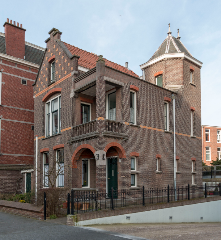 De vrijstaande woning is in dezelfde neorenaissance stijl vormgegeven als de school. Bakstenen gevels worden verlevendigd met siermetselwerk in rode verblendsteen. De entree op de hoek is verdiept uitgevoerd. Ook de verdieping erboven heeft hier een loggia met gemetselde bakstenen balustrade. Wellicht kon zo beter toezicht gehouden worden op het schoolterrein. Een ander opvallend bouwdeel van deze rijk vormgegeven conciërgewoning is de hoektoren rechts achter.