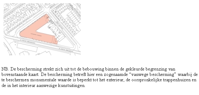 NB, De bescherming strekt zich uit tot de bebouwing binnen de gekleurde begrenzing van bovenstaande kaart. De bescherming betreft hier een zogenaamde "vanwege bescherming" waarbij de te beschermen monumentale waarde is beperkt tot het exterieur, de oorspronkelijke trappenhuizen en de in het interieur aanwezige kunstuitingen.