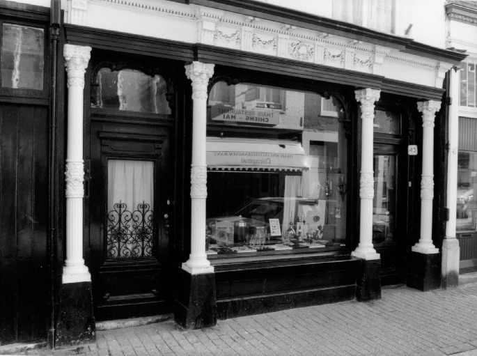 Achttiende eeuws pand met achterhuis van drie bouwlagen met gepleisterde lijstgevel ter breedte van drie traveeën. In de linker as een poort. Winkelpui uit de tweede helft van de 19de eeuw met gietijzeren zuiltjes, voorzien van versierde schachten en composiete kapiteeltjes. Op de eerste en tweede verdieping T-schuiframen. De vensters van de tweede verdieping stoten door in het hoofdgestel.