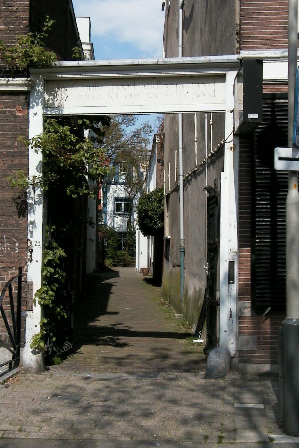 Houten poort met smeedijzeren hek, waarschijnlijk daterend uit de 18de eeuw. De steeg is genaamd Spinozapoort. Op de houten poort de tekst:"Deez' smalle poort leidt onvermoed naar ruimte tot ons geestelijk goed".