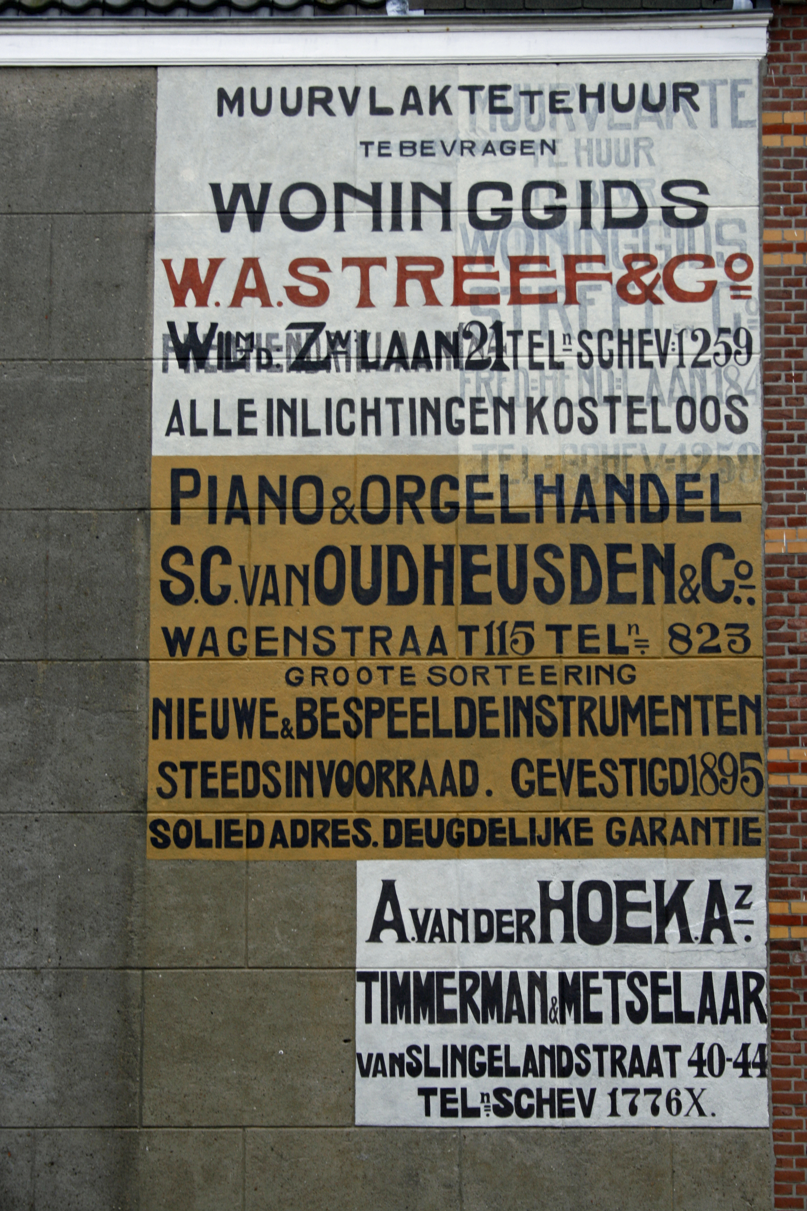 Het bovenste deel is voor de firma W.A. Streef & Co, die in de loop van de tijd zijn reclame nog een keer liet actualiseren. De oudste is de smalle reclame aan de rechterkant van het gevelvlak. Deze zal van rond 1910 dateren toen de firma zich vestigde aan de Frederik Hendriklaan 184. De nieuwe reclame die hier overheen geschilderd is vermeld dit oude adres ook nog maar daaroverheen ging het nieuwe adres van de firma die in 1914 verhuisde naar de Willem de Zwijgerlaan 21. Deze twee reclames zijn uitgevoerd in een zwarte belettering op een witte achtergrond met uitzondering van de firmanaam die is uitgevoerd in een rode belettering. De firma W.A. Streef & Co gaf een woninggids uit en was ook actief in het verhuren voor reclame van deze zijgevel. De woninggids was een krantje dat elke twee weken verscheen en waarin een opsomming werd gegeven van woningen die te koop en te huur waren. De reclame voor de firma W.A. Streef & Co is eveneens een letterreclame, nu een zwarte belettering op een gele achtergrond. De onderste reclame voor de timmerman/metselaar A. van der Hoek is weer een zwarte letterreclame op witte achtergrond. Bijzonder is de vermelding van de X achter het telefoonnummer. Deze firma komt voor het eerst in 1911 in de telefoongids voor en de X is hier ook vermeld. Dit is ook nog zo in 1912, daarna is de X verdwenen. De vermelding van de X hing samen met het fenomeen van gesplitste aansluiting, die in de periode 1908-1913 door de firma werd gebruikt. Voor een geringere abonnementsprijs deelde men de lijn met anderen. In 1923 verhuisde de laatste van de drie firma’s die hier een reclame kregen en vervaagde in de loop der tijd langzaam de reclameduidingen. In 2014 zijn deze gerestaureerd en weer zichtbaar gemaakt.