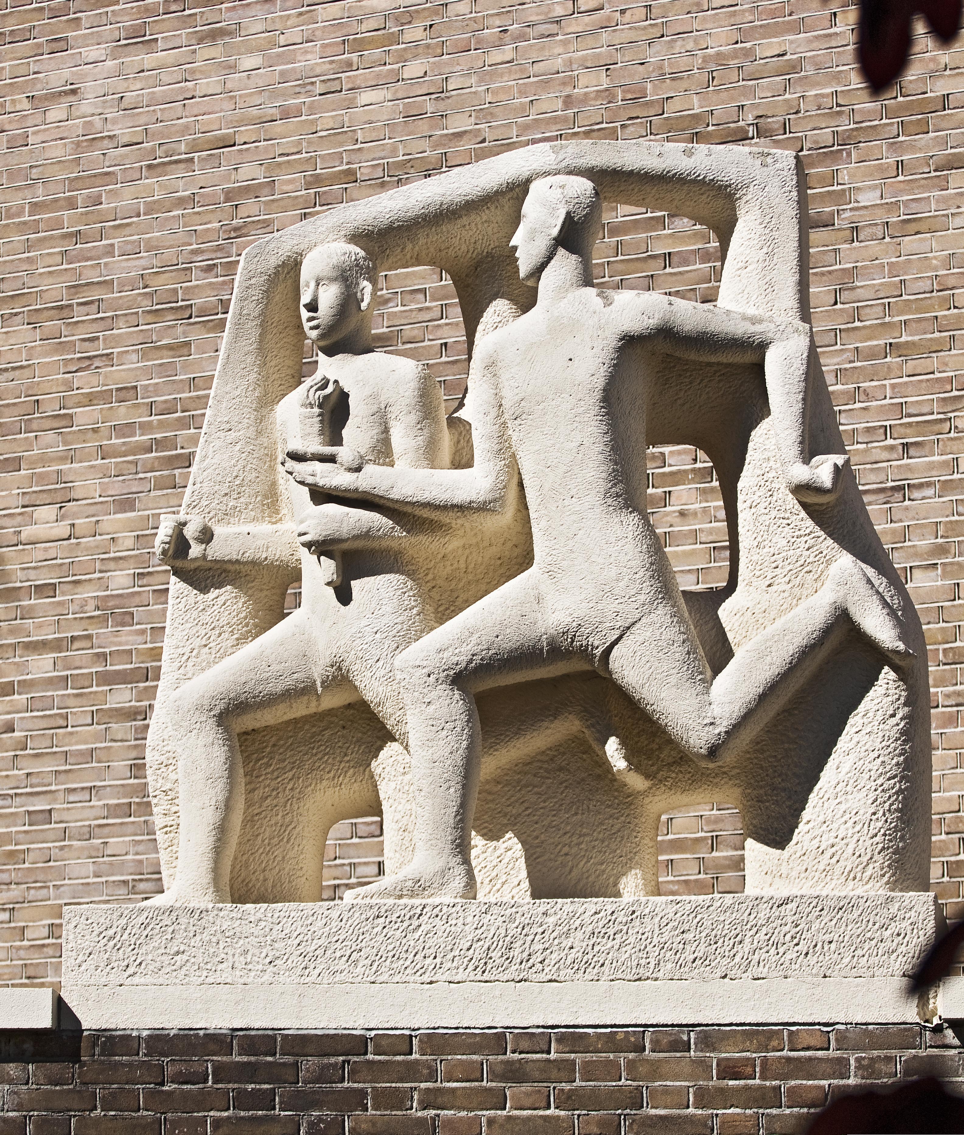 De school wordt tevens gekenmerkt door de toepassing van monumentale kunst. In de centrale hal zijn in 1956 tussen hal en garderobe twee wandschilderingen door Karel Appel aangebracht. Tevens bevindt zich in de hal een reliëf van Wessel Couzijn, voorstellende de Emmausgangers. Een ander in de school aanwezig beeld van Couzijn, een Christoforus, is een geschenk van de leraren geweest. Op de uitbouw van de gymzalen aan de zijde van het schoolplein is een beeldengroep van Rudi Rooyackers geplaatst, voorstellende twee estafettelopers, van wie de ene de fakkel der wetenschap overdraagt aan de andere.