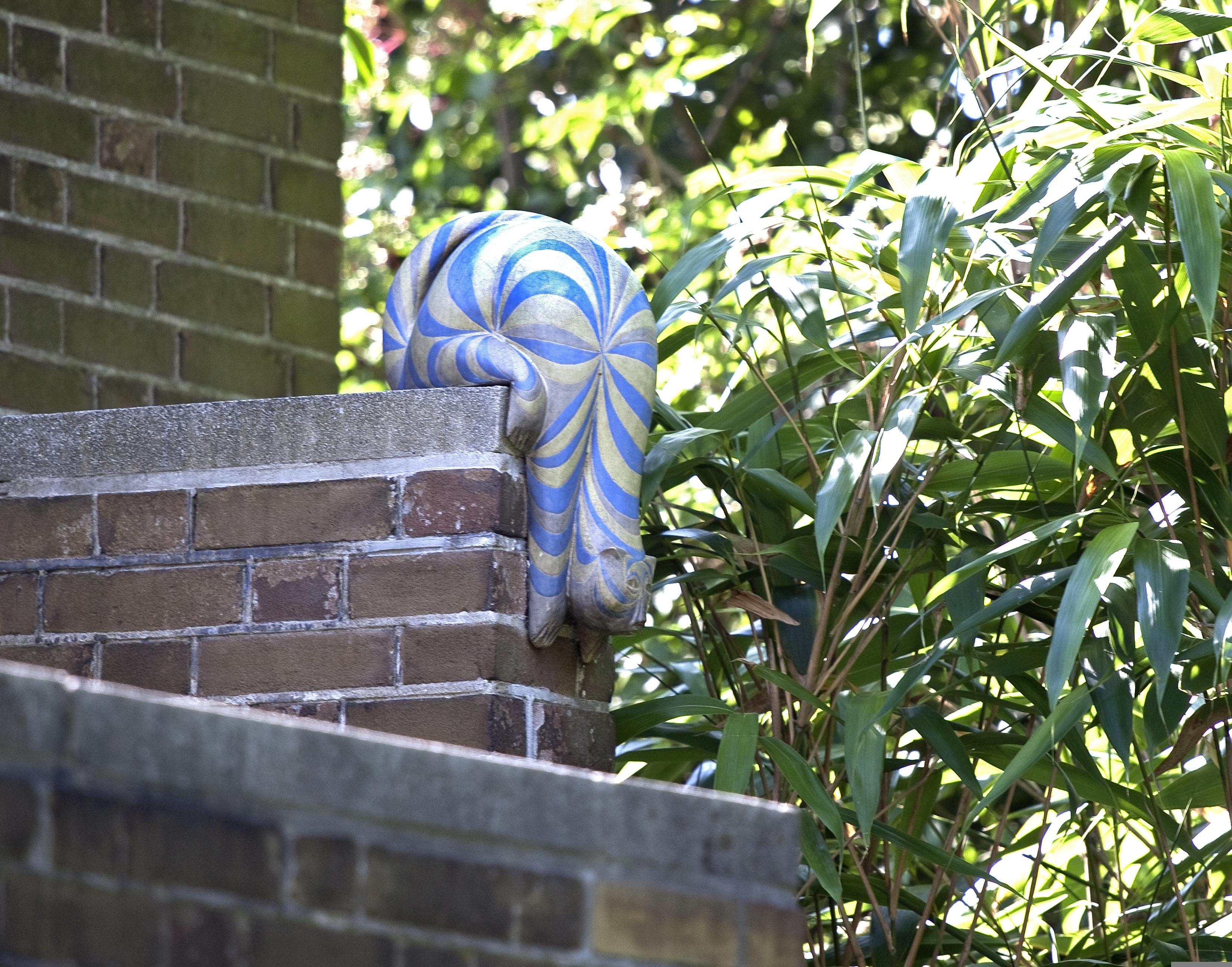 glasstrook. De zuidzijde van de woning grenst aan de ommuurde privé-tuin en is voorzien van grotere vensteropeningen en entrees. Aan de achterzijde van de woning, is op een dwarsgeplaatste muur die tegen de hoog opgetrokken gevel staat, een kleine sculptuur van majolica in de vorm van een kat van kunstenaar Aat van den IJssel geplaatst.