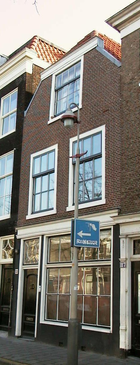 Pand uit de 17de of 18de eeuw, bestaande uit parterre, verdieping en kapverdieping in het schilddak dat is afgewolfd boven de van vlechtingen voorziene, afgeknotte puntgevels aan voor- en achterzijde. De voorgevel, die is afgedekt door een houten gootlijst, telt twee vensterassen en vertoont klezoortjes. De recente houten onderpui in vroeg- 19e-eeuwse trant bevat links de deur die voorzien is van een bovenlicht. De schuiframen met negen- en twaalfruitsroedenverdeling in de vensters van de voorgevel zijn van recente datum. In de achtergevel een 18de-eeuws zoldervenster met zestienruits roedenverdeling.