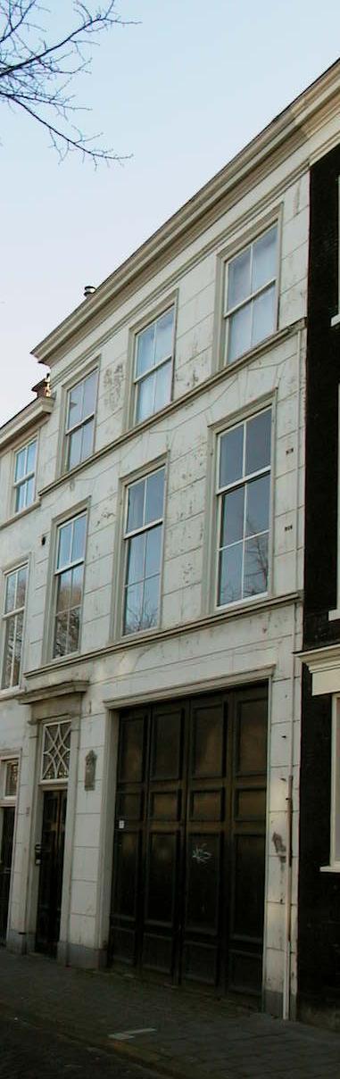 Woon- en bedrijfspand in de huidige vorm uit de eerste helft van de 19de eeuw. Het huis bestaat uit parterre, verdieping en zolderverdieping en wordt gedekt door een schilddak. De breedte bedraagt drie vensterassen. De geblokte gepleisterde gevel bezit waterlijsten en een houten hoofdgestel. De onderpui vertoont links een vleugeldeur met panelen en versierd bovenlicht, gevat in een omlijsting door pilasters en hoofdgestel. Rechts hiervan bevinden zich brede inrijdeuren. In de gevel een moderne gevelsteen met als opschrift onder meer: Hier woonde van 1852-1856 Dr. R.G. Bakhuizen van den Brink, rijksarchivaris.