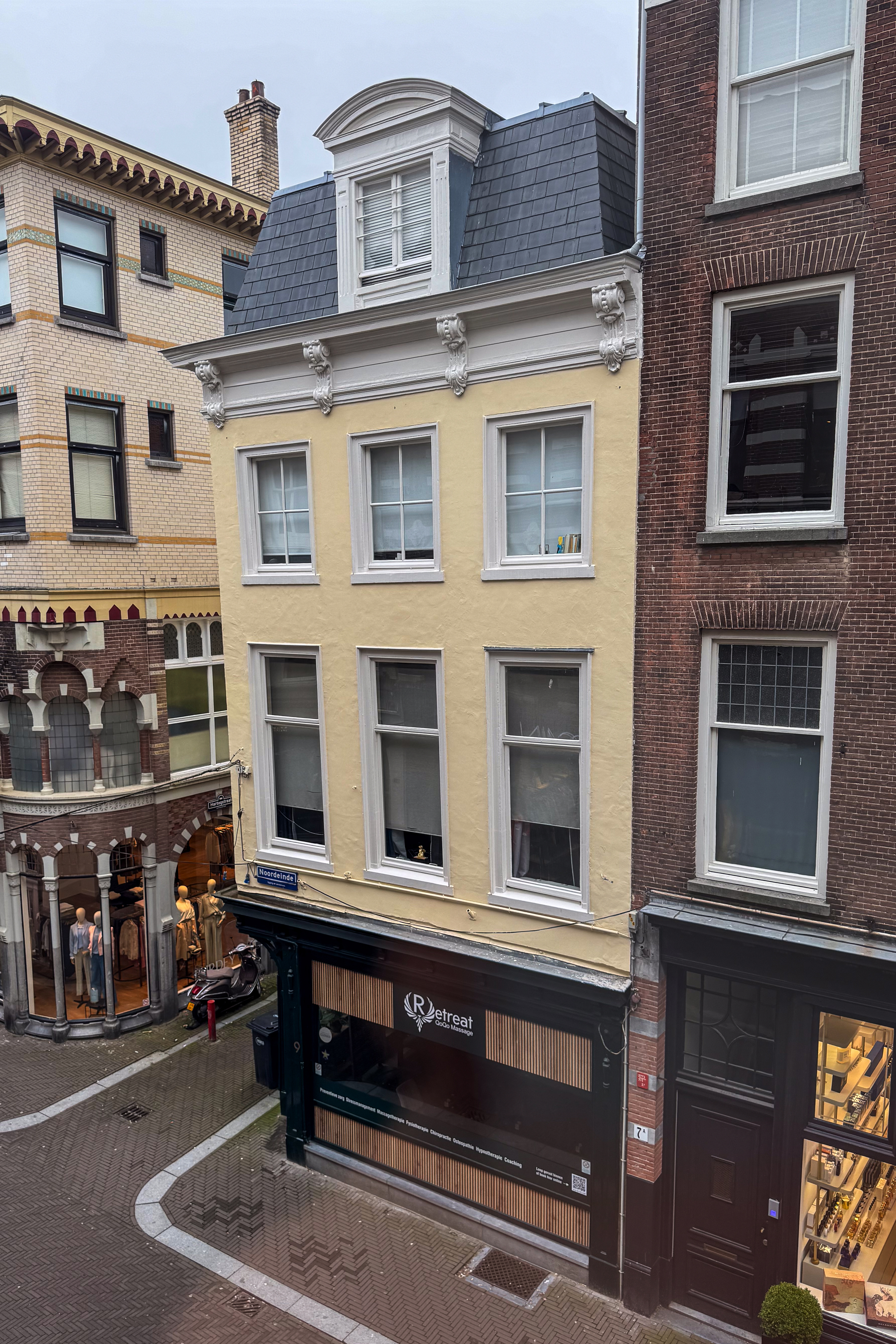 Uitwendig heeft genoemd pand een drie vensterassen brede, gepleisterde lijstgevel ter hoogte van parterre en verdieping, met in het afgeknotte zadeldak twee dakkapellen. Houten winkelpui met gecanneleerde pilasters uit het einde van de l9de eeuw. Deuromlijsting met bovenlicht en hoofd- gestel tussen gecanneleerde, houten pilaster.