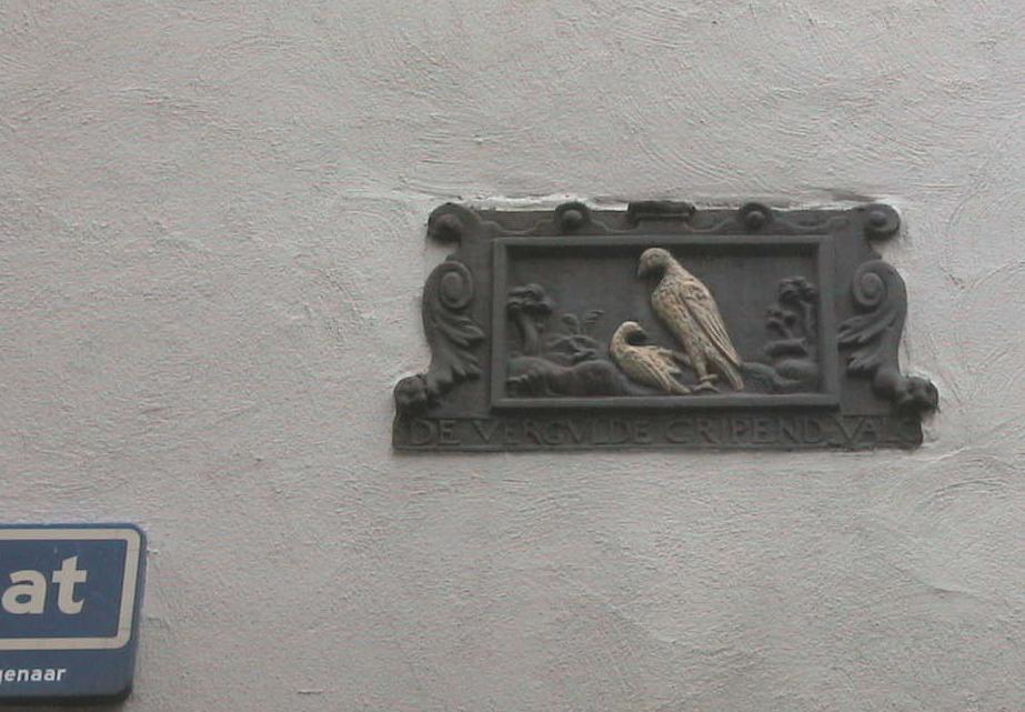 Gepleisterd hoekpand, bestaande uit parterre, twee verdiepingen en afgeknot schilddak met dakkapel, bekroond door een gebogen fronton. Breedte: drie vensterassen. Het 18de-eeuwse huis heeft een lijstgevel waarvan de houten kroonlijst gedragen wordt door vier gesneden consoles in Lodewijk XIV stijl. Houten winkelpui, eind 19de eeuw. Vensters met geprofileerde dorpels. In de bovenvensters vierruitsachuiframen. In de zijgevel een 17de-eeuwse gevelsteen met voorstelling van drie valken en opschrift: "De vergulde gripende valck".