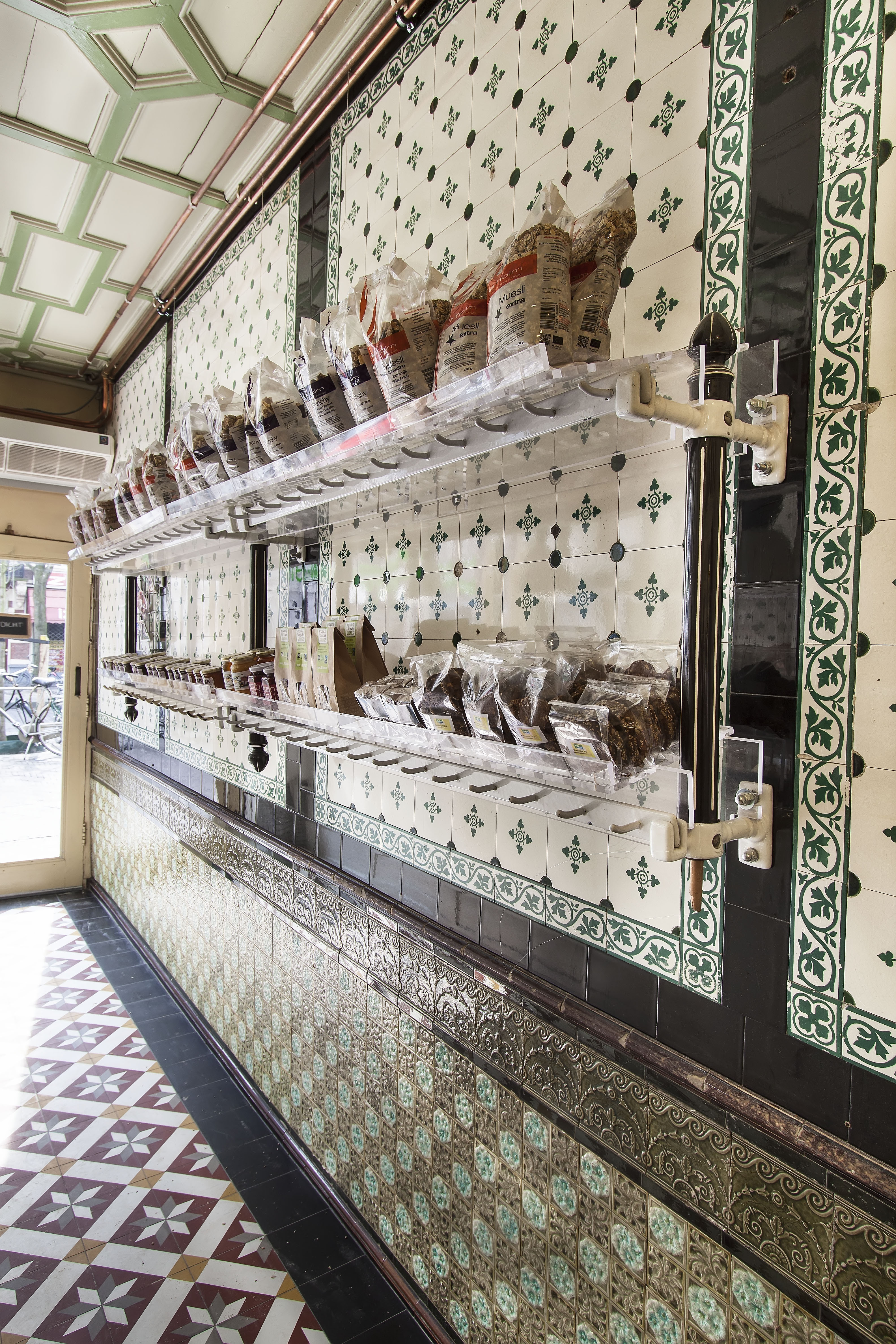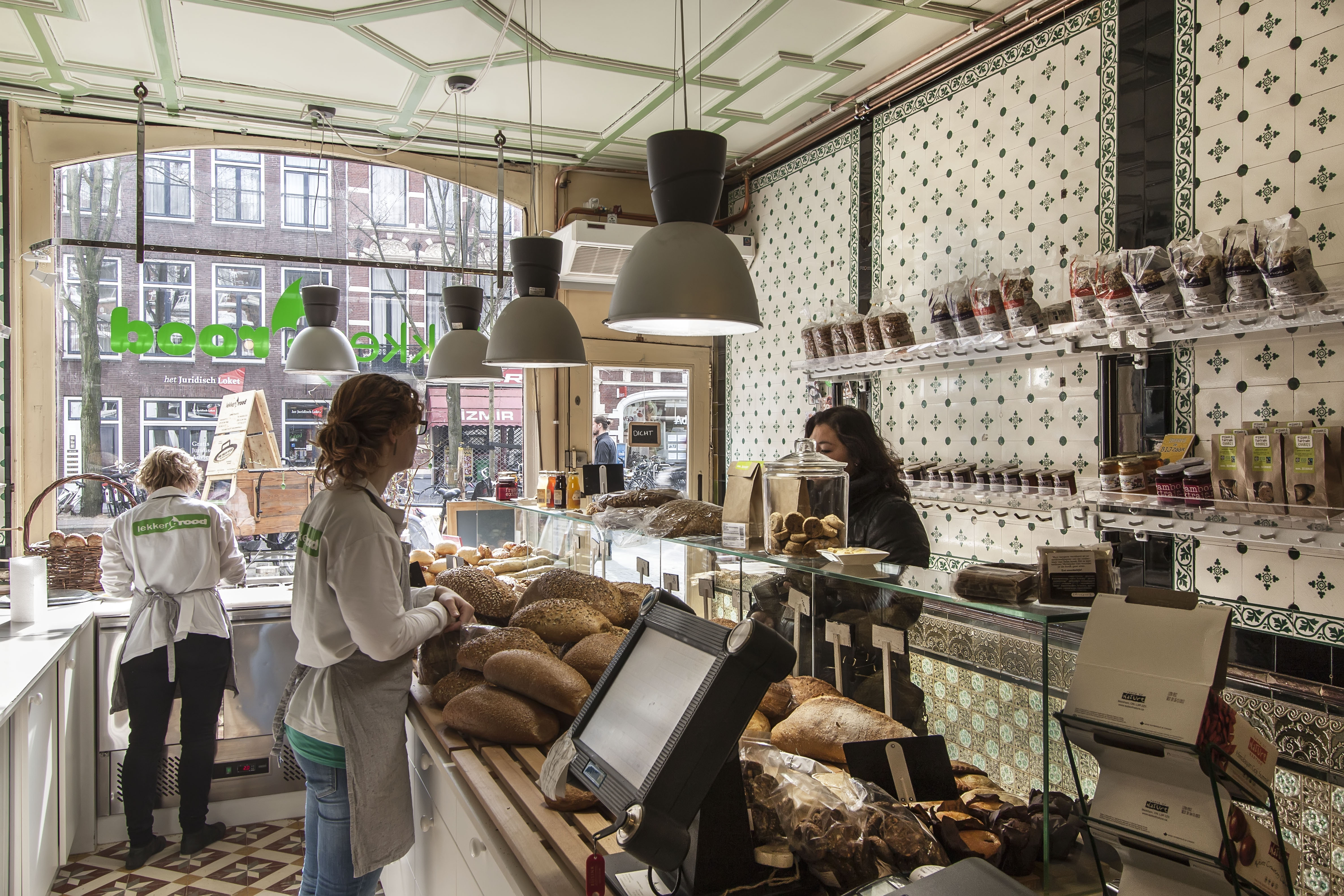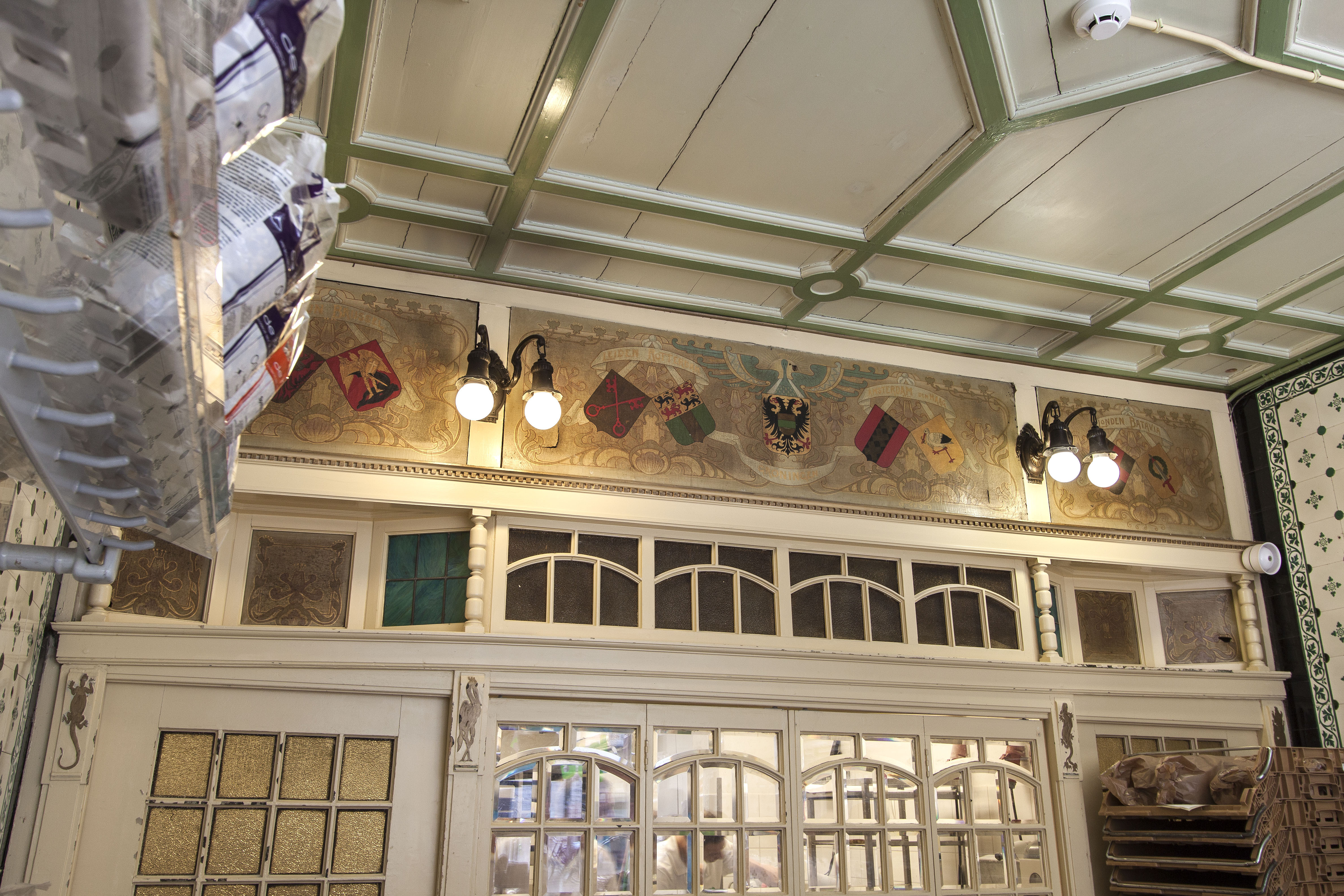 De winkel behoorde aan E. Noack, een delicatessenwinkel in ‘fijne vleeschwaren’. De destijds vermaarde vleesfabriek van Noack was gevestigd in Groningen en had filialen in binnen- en buitenland, waaronder meerdere in Den Haag. Het winkelinterieur is nog grotendeels intact, inclusief vleeshaken; alleen de vloer, de toonbank en de etalage-inrichting zijn vernieuwd. Vanwege de oorspronkelijke functie als vleeswarenwinkel zijn de wanden met geglazuurde tegels bedekt. Het vroegere kantoorgedeelte achterin wordt van de winkel gescheiden door een rijk vormgegeven wand met geslepen ruitjes. In het fries erboven zijn in panelen op doek de wapens geschilderd van de steden waar Noack gevestigd was: Leiden, Rotterdam, Groningen, Amsterdam en Den Haag, geflankeerd door Berlijn en Brussel, en Londen en Batavia. Gesneden beestjes, waaronder een ooievaar, een salamander en een varkentje sieren de deurposten. Het plafond is een origineel houten cassettenplafond. De wapenschilden aan de gevel refereren aan het feit dat Noack sinds zeker 1896 hofleverancier was.