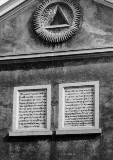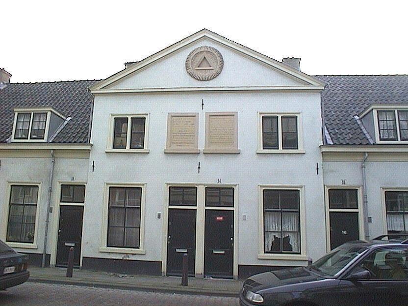 Stichting De Geefhuisjes, gebouwd in 1665 - RIJ VAN 12 HUISJES, de twee middelste verhoogd en bekroond met een driehoekig fronton
