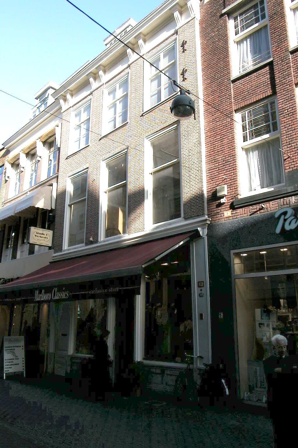 Pand ter breedte van drie vensterassen, bestaande uit parterre en twee verdiepingen. Lijstgevel van midden- 19de- eeuws karakter. Hardstenen plint met panelen, houten winkelpui uit de bouwtijd. Vensters met geprofileerde omlijstingen. De bovenste vensters hebben geprofileerde dorpels en zes- ruitsschuiframen. Houten kroonlijst met paarsgewijs geplaatste voluut- consoles. Dakkapel.