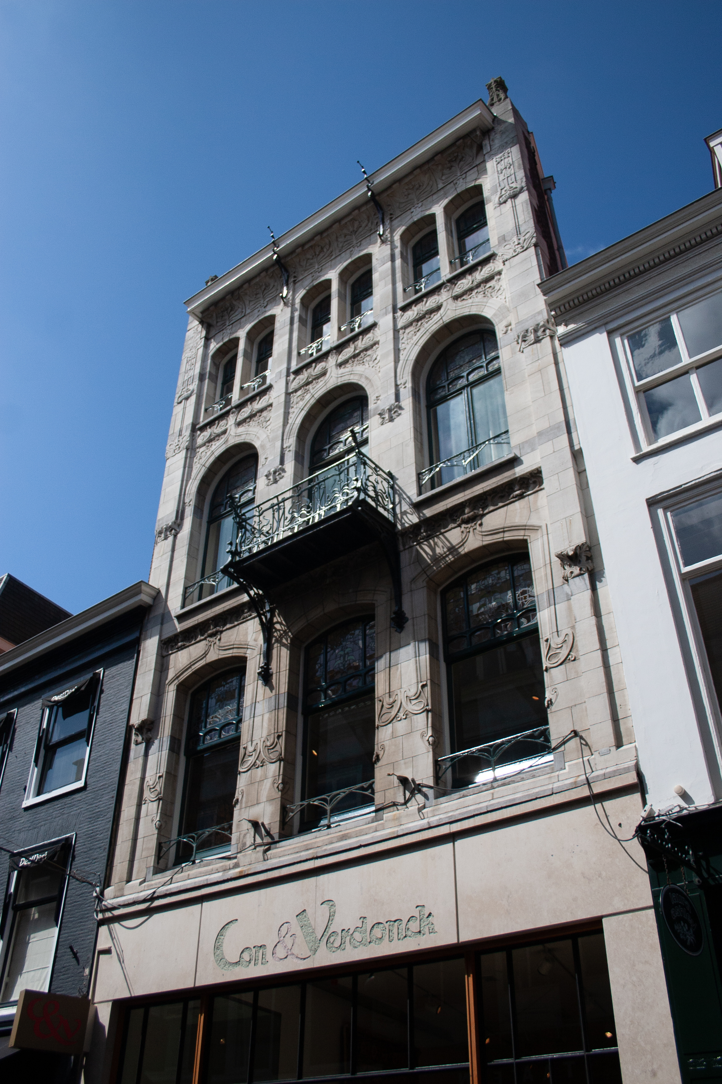 Het pand op rechthoekige plattegrond telt vier bouwlagen en is drie vensterassen breed. De geheel met natuursteen beklede lijstgevel is uitgevoerd in weelderige Art Nouveau-vormen. Het beeldhouwwerk is waarschijnlijk van de hand van de beeldhouwer M.J. Hack die veel voor Mutters werkte. De eerste en derde verdieping bezitten vensters met segmentbogen; de vensters van de tweede verdieping zijn rondbogig. De vensteromlijstingen in de eerste en tweede verdieping zijn uitgewerkt als gotische accoladebogen met kruisbloemachtige bladmotieven. De gevelvlakken vertonen sculptuur met slingerende, plantaardige motieven. De gevel is gevat tussen doorgaande hoekpenanten, die eveneens met beeldhouwwerk zijn versierd. Tussen de verdiepingen zijn friezen met bladmotieven aangebracht; het brede fries onder de door ijzeren steunen gedragen houten gootlijst is eveneens geheel met plantaardige motieven gedecoreerd. De vensters bezitten bovenramen met rijk glas-in-lood in Art Nouveau. Voor de vensters bevinden zich raamhekjes in eenvoudige Art Nouveau-vormen. Voor het middenvenster van de tweede verdieping is een klein balkon aangebracht met een rijk gedetailleerd hekwerk in Art Nouveau. De oorspronkelijke driedelige onderpui met een getoogd etalageraam, geflankeerd door deuren, is vervangen door een moderne winkelpui.