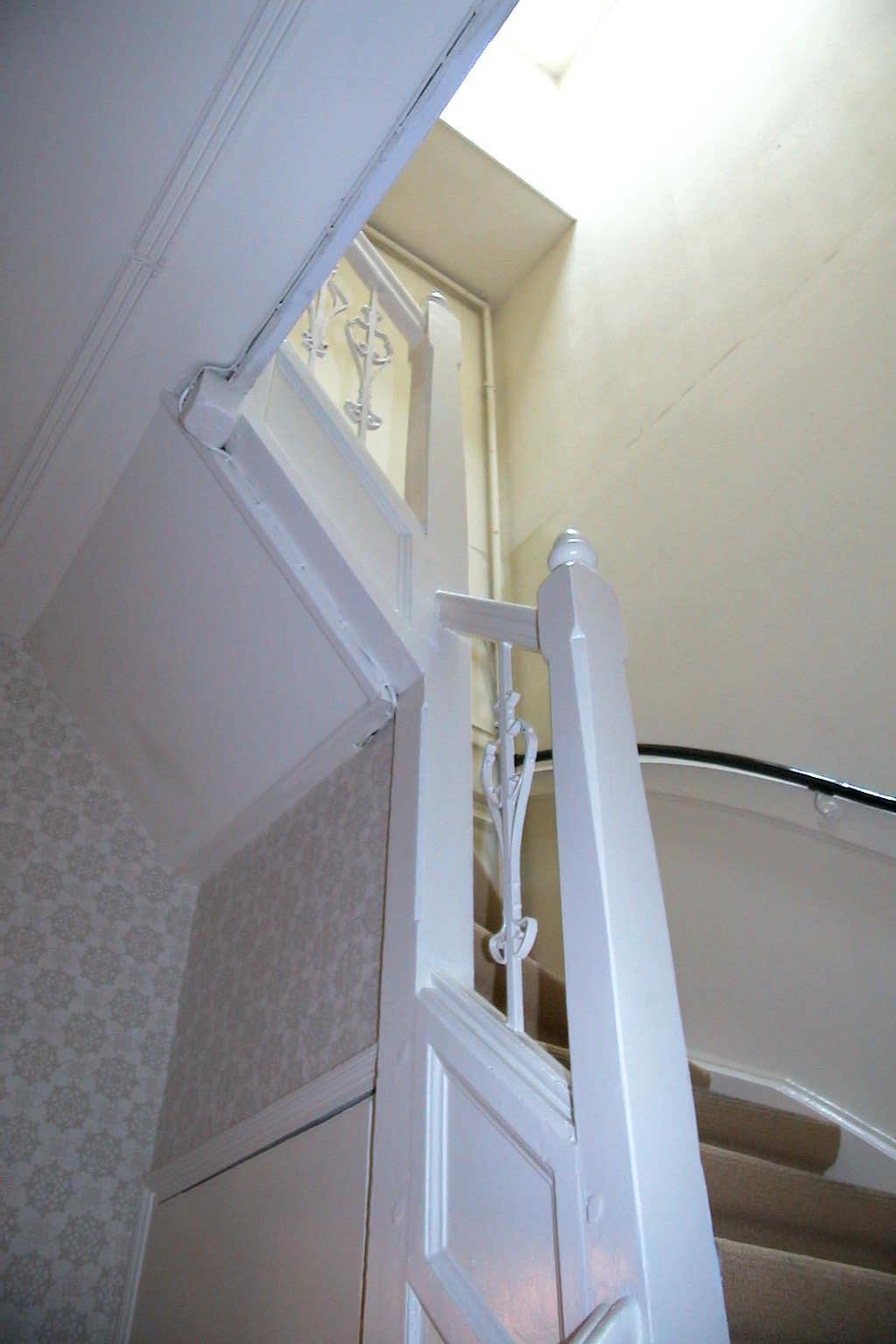 Op de eerste verdieping is de structuur goed bewaard gebleven; de voor- kamer heeft drie hoge Franse ramen en een eenvoudige 19de eeuwse marmeren schouw. De grote achterkamer heeft twee zesruitsschuifraznen uit de eerste helft van de 19de eeuw. In de kozijnen zijn de duimen van de luiken die eens de gecementeerde achtergevel sierden nog te zien. De trap heeft ij zeren balusters in Jugendstil trant.