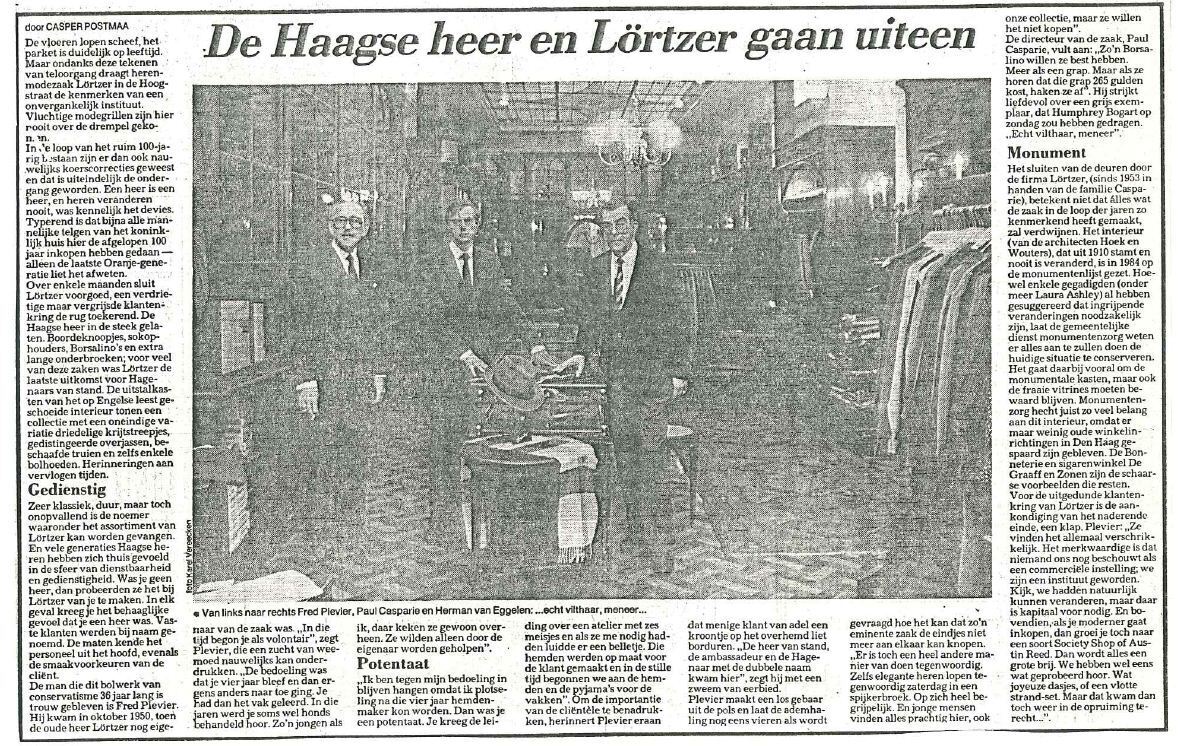Parterre: Winkelinterieur in voorname stijl met detaillering van hoge muurkasten, plafondlijsten en achterwand in eclectische trant (gotische en Lodewijk XVI variaties). Het interieur toont een vrijwel gaaf beeld van een vro 20ste eeuwse luxe herenmodezaak compleet met hoge spiegel- en ladekasten, lage toonkasten, kroonluchters, en een fraai lichtraam in het achterplafond met gebrandschilderd glas in lood. De vermoedelijke architecten van dit op de Engelse modezaken geïnspireerde winkelinterieur zijn Z. Hoek en J.Th. Wouters.