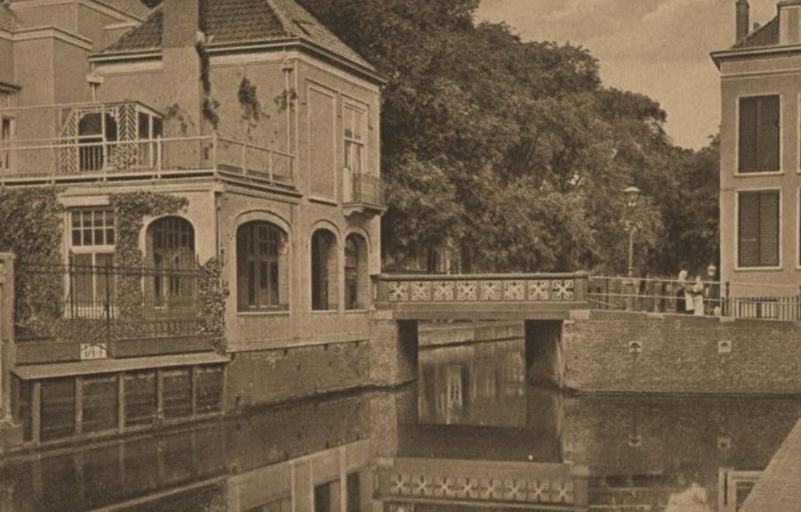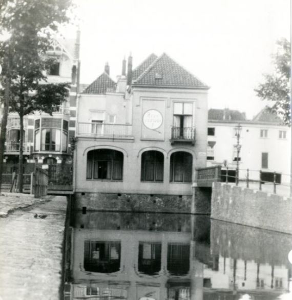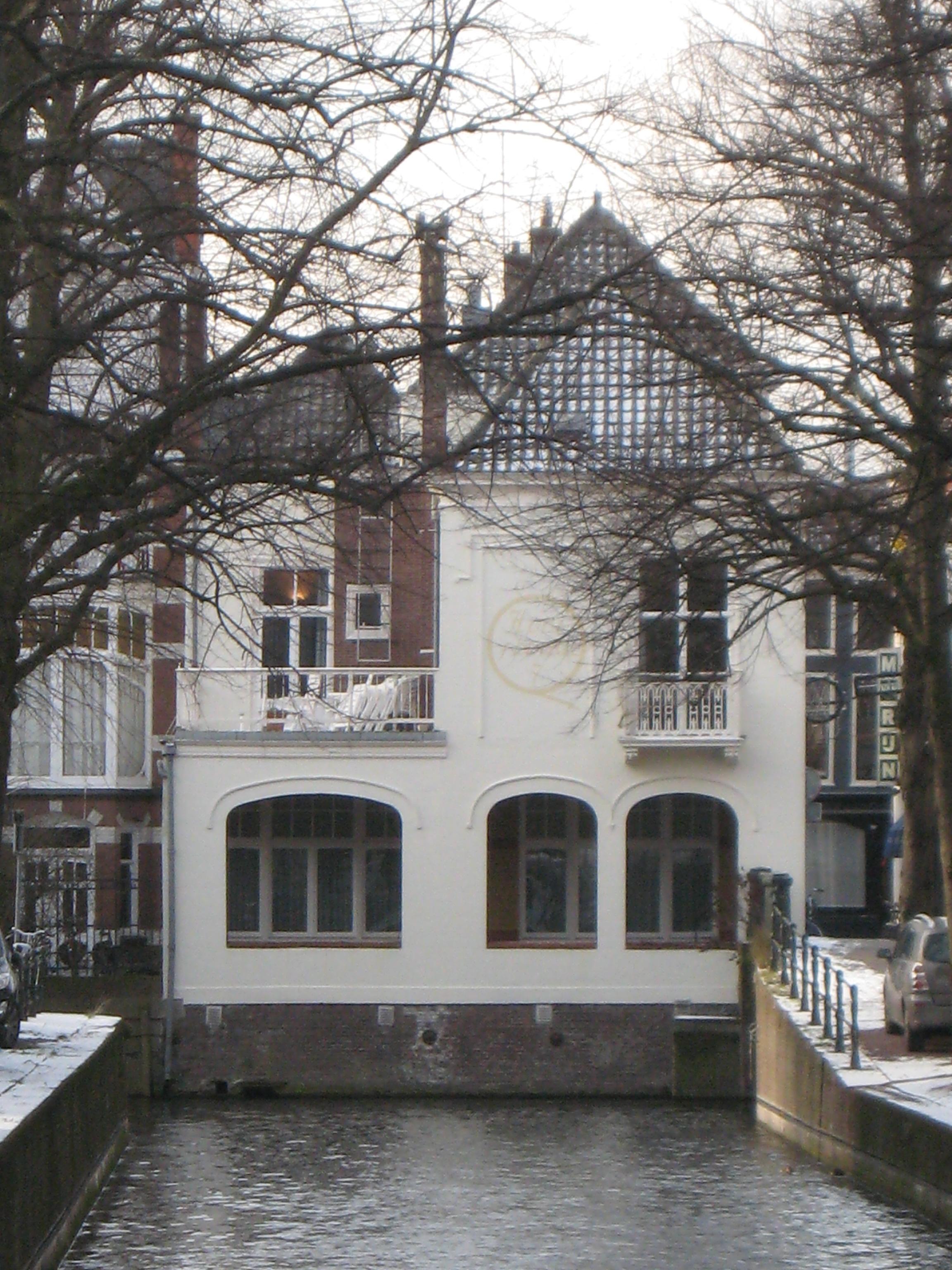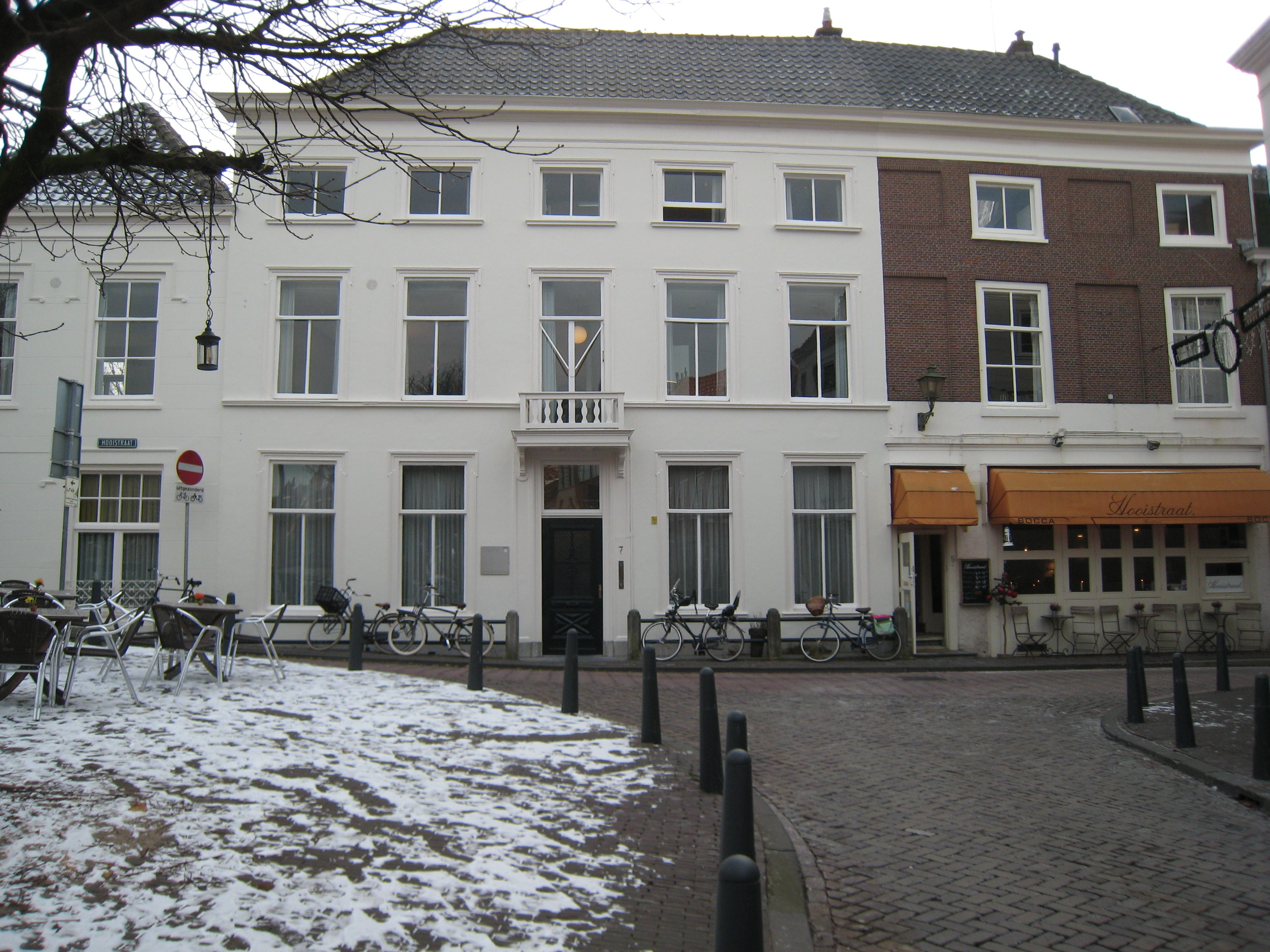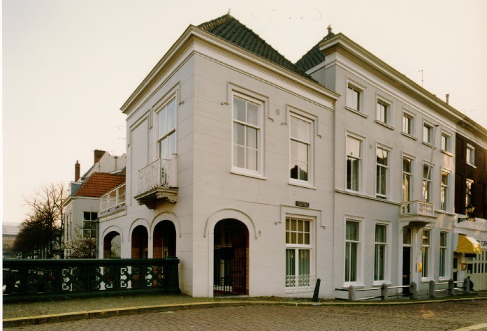 Fors 19e-eeuws pand onder hoge kap met lijstgevel en deuromlijsting.