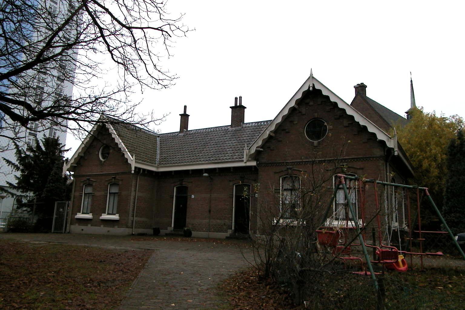 Twee geschakelde machinistenwoningen uit 1883-1885 op U vormige plattegrond, onderdeel van het sluizencomplex en gemaal Houtrustweg naar ontwerp van J. van der Vegt in sobere eclectische trant