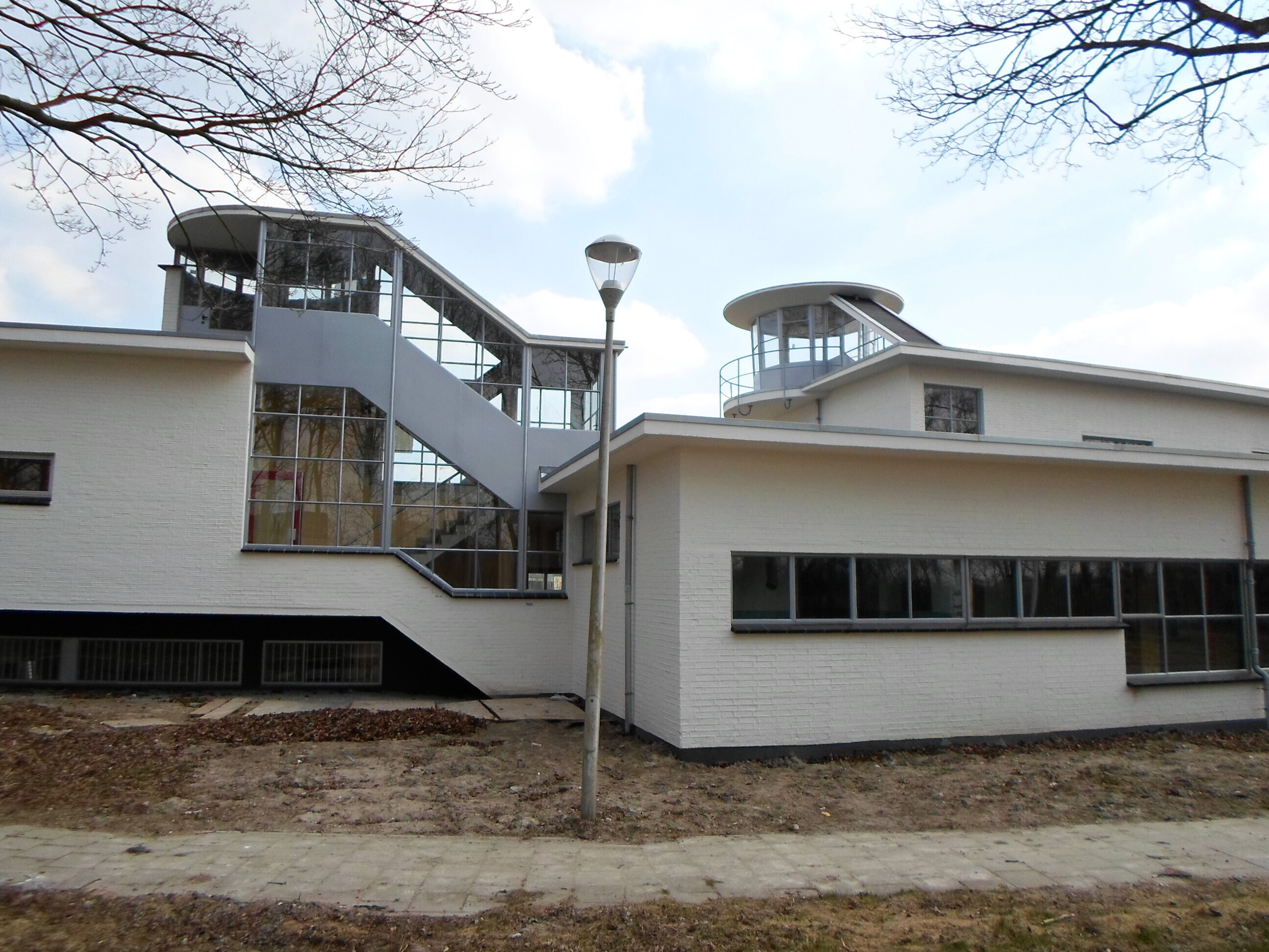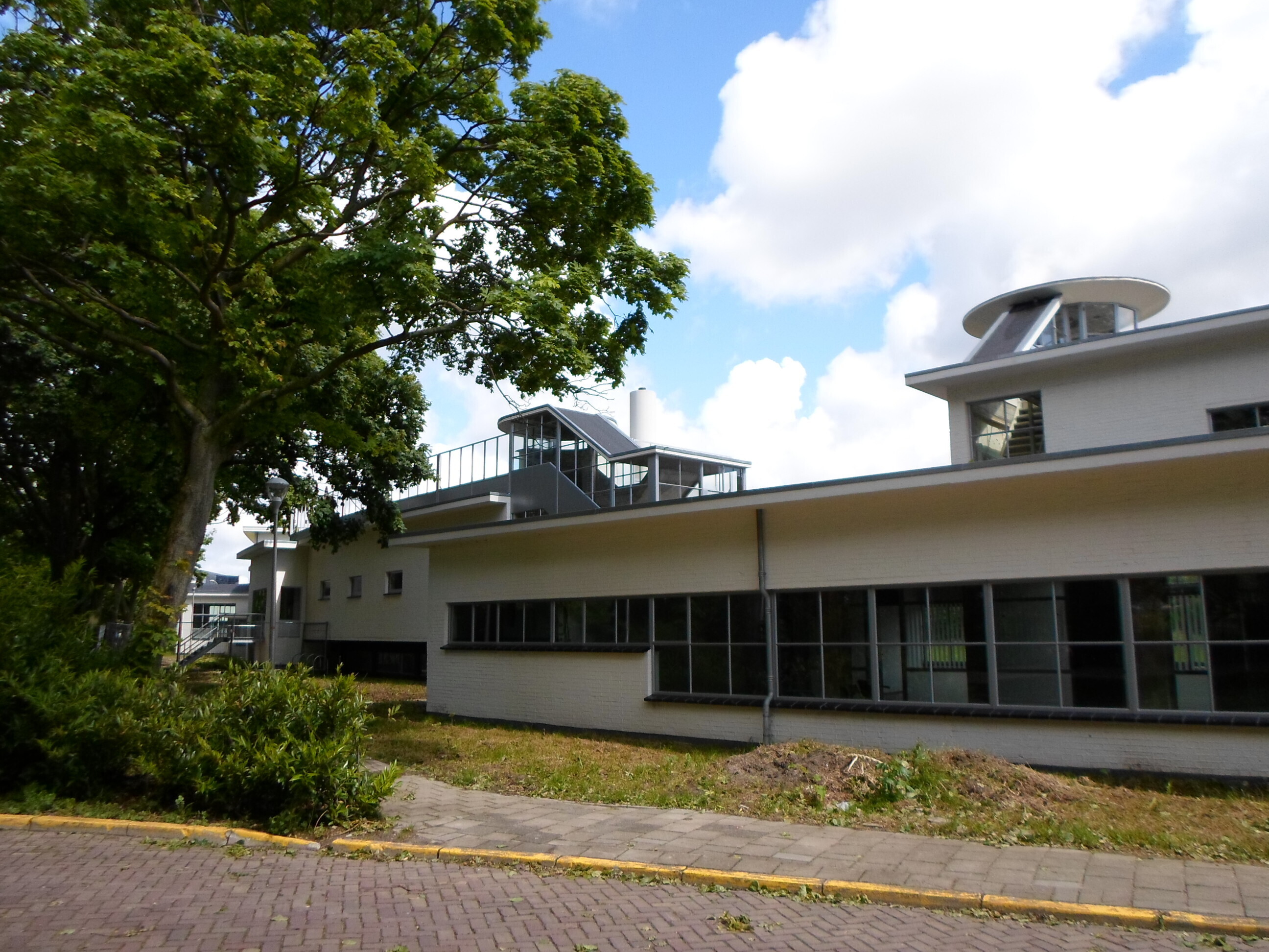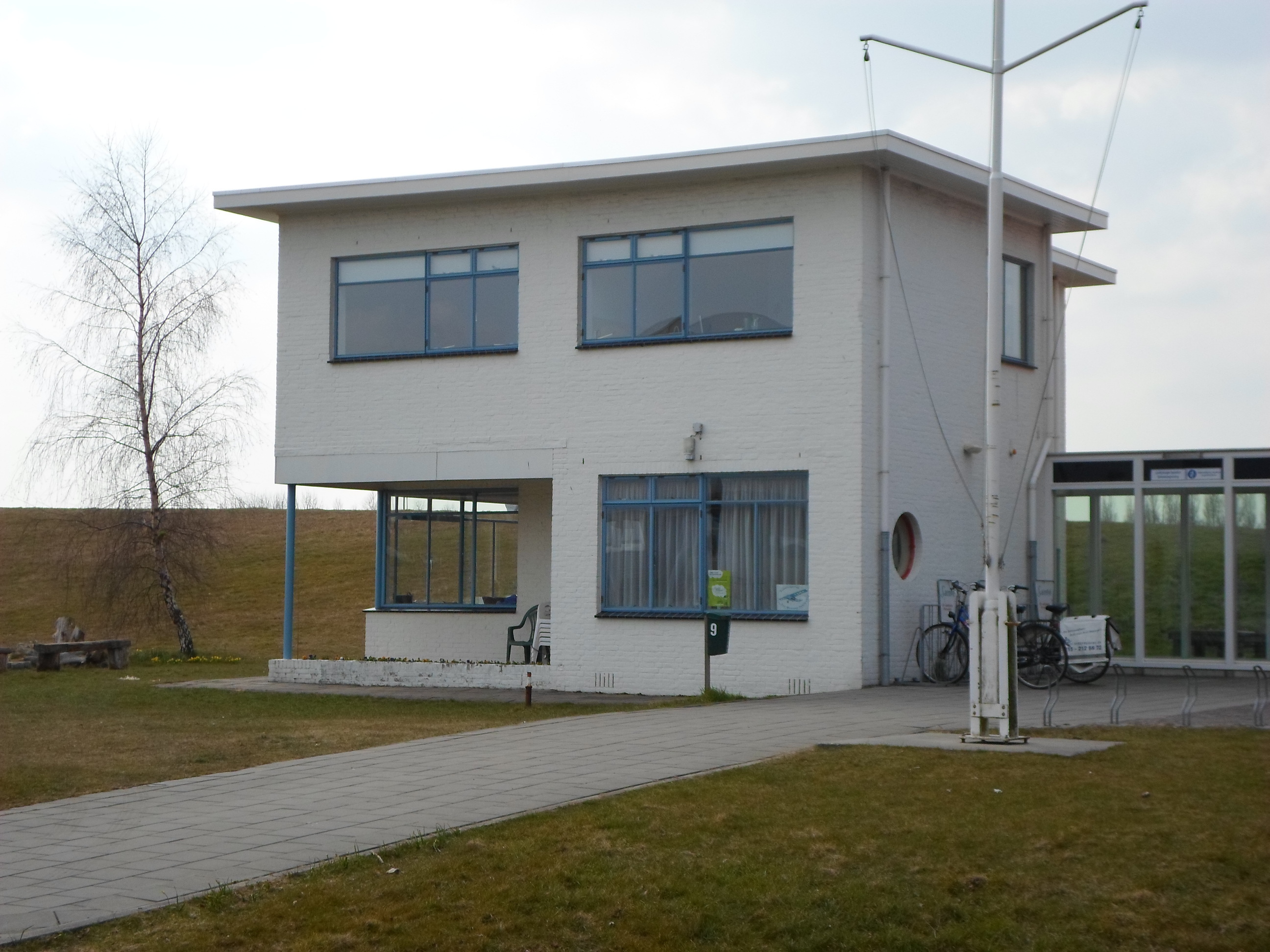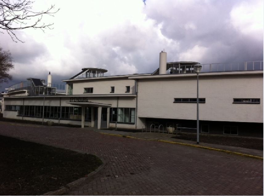 NLS-GEBOUWIn oorsprong als hoofdzetel van de NATIONALE LUCHTVAART SCHOOL (NLS) bestemd gebouw, opgetrokken in 1939 naar nieuw- zakelijk ontwerp van H.F. Mertens op min of meer T-vormige plattegrond met lage, tapse westvleugel onder oplopend, gebogen dak met overstek en de lange, licht concave oostvleugel van twee in- en uitspringende bouwlagen en kelder onder zeer licht geknikt luifeldak. De gemetselde muren zijn witgesausd en bevatten in oorsprong alle stalen kozijnen en buitendeuren. Links in de oostgevel bevindt zich een gedenksteen die blijkens opschrift is geplaatst door de toenmalige minister van Defensie.